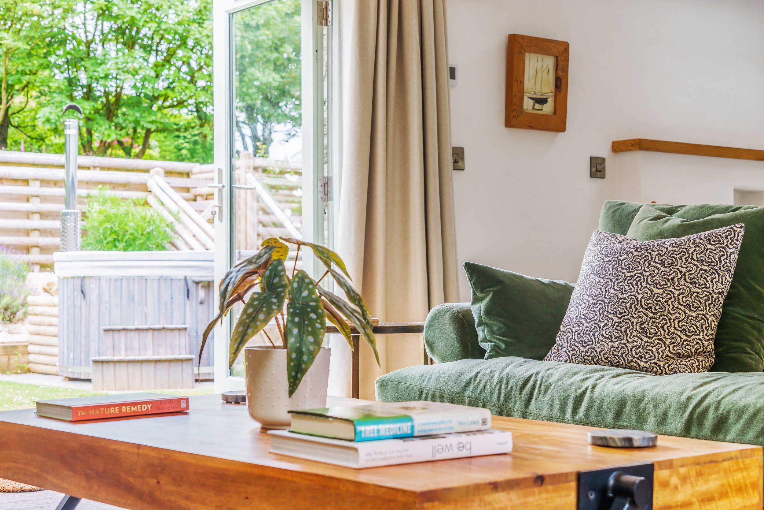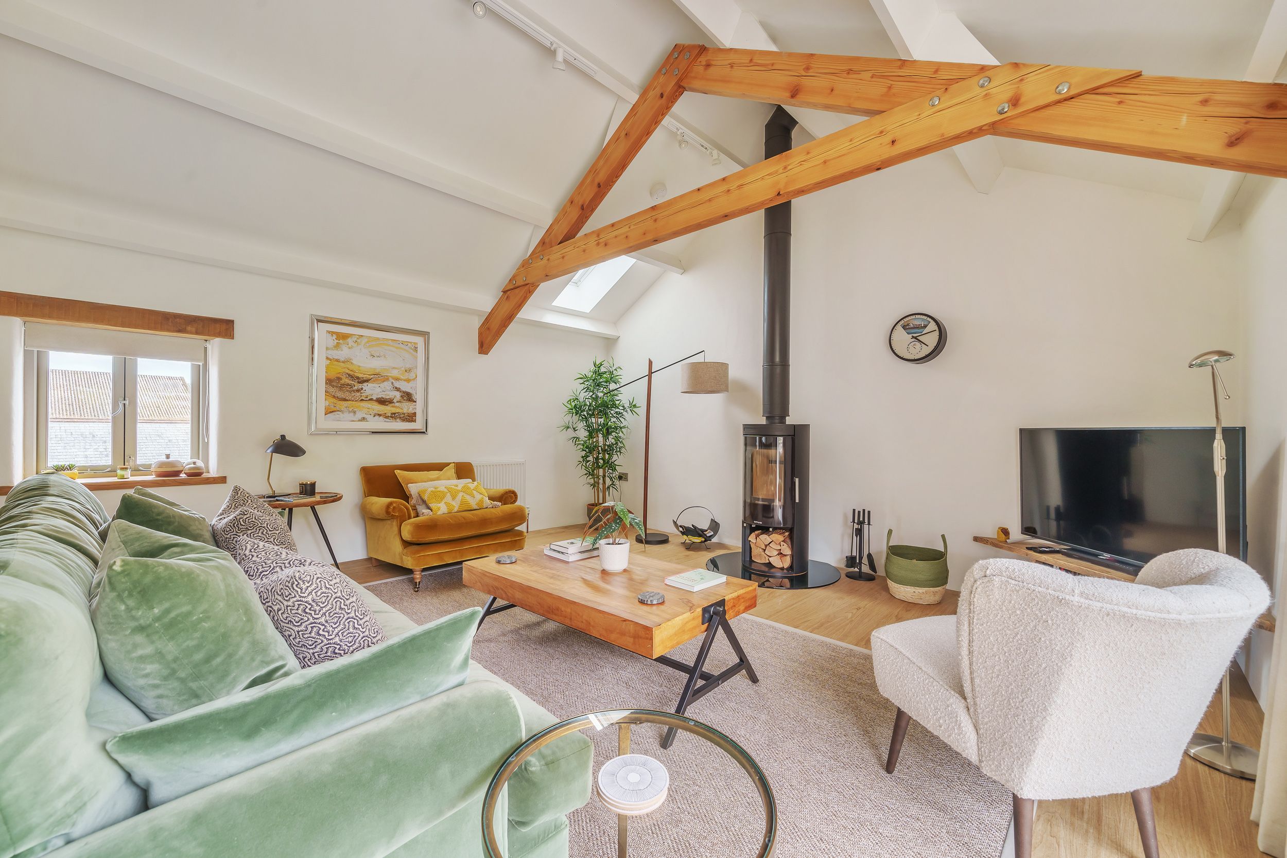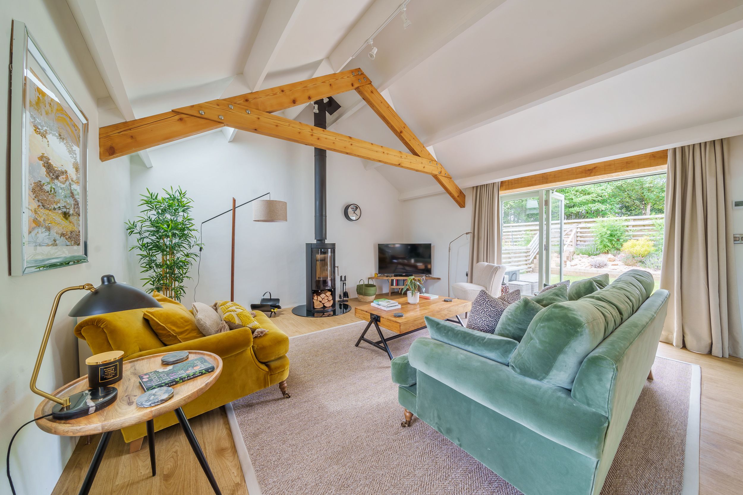 Amenities Eco-friendly air-source heat pump with combined solar power/underfloor heating with woodburning stove. Electric oven/air fryer and induction hob, microwave, fridge/freezer, Bosch Tassimo coffee maker, washing machine, dishwasher. 3 x Smart TVs and Ultra fast WiFi, Bose surround sound system. Fuel and power inc. in rent. Wood burner starter pack inc. in rent. Bed linen, robes, slippers and towels inc. in rent. Travel cot, stairgate and highchair available. Off-road parking for 3 cars and Electrical charging point available at an extra cost. Enclosed garden with patio and lawned area featuring BBQ, wood-fired eco-friendly hot tub - wood will not be provided - and outdoor furniture. Enclosed front patio with bench and communal courtyard. Guest garage store/games room with; table football, additional fridge/freezer, buckets and spades, dog cage, picnic set and more. 1 x well-behaved dog welcome at an additional charge of £50, (possibly 2 small dogs depending on breed). Sorry, no smoking. Complimentary welcome pack and luxury toiletries pack. Shop 4.9 miles, pub 0.9 miles.