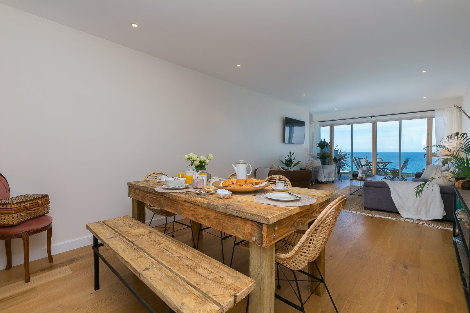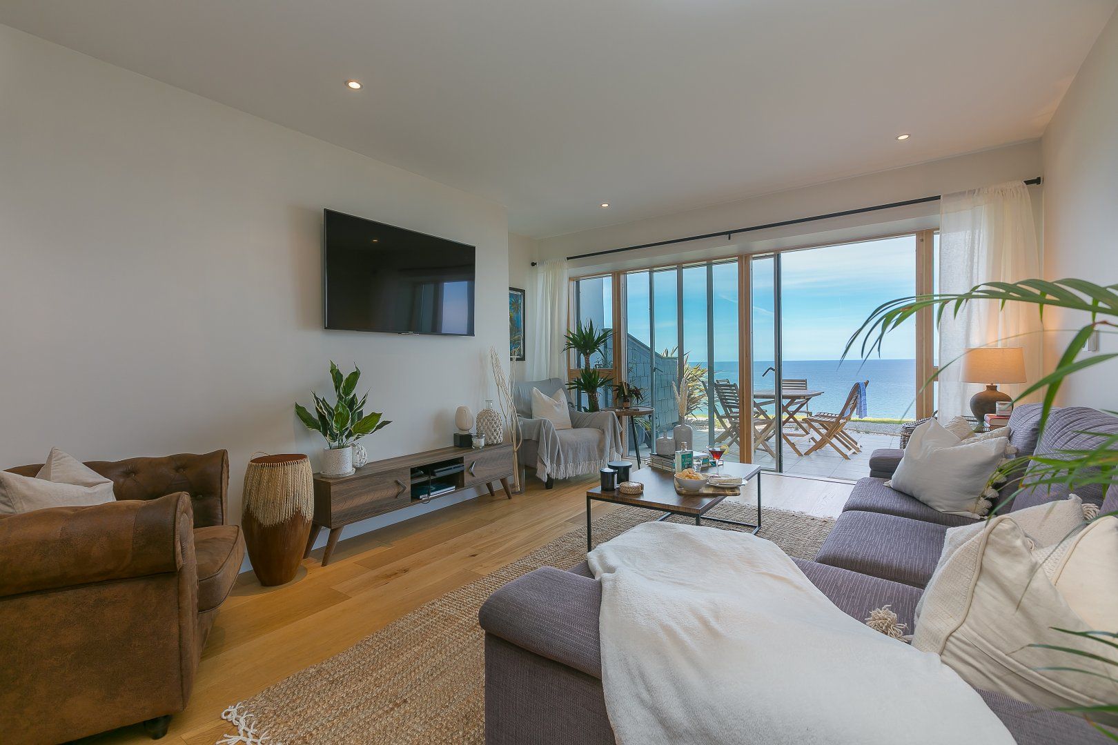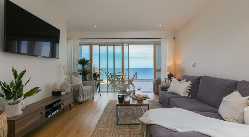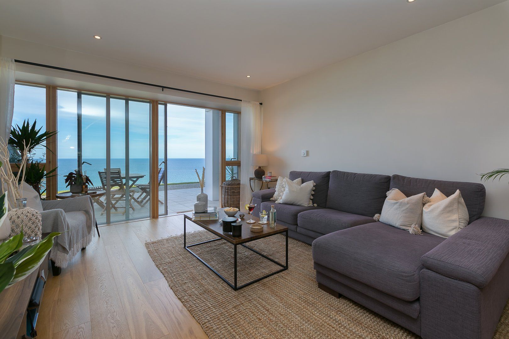 Amenities Underfloor heating throughout. Electric oven and grill, gas hob, microwave, fridge/freezer, washing machine, tumble dryer, dishwasher. 55 Smart TV, Netflix, PS4, WiFi, selection books and board games. Fuel and power inc. in rent. Bed linen and towels inc. in rent. Highchair and travel cot available. Private, gated parking for 1 car. Sea-facing terrace with furniture. Communal garden with access to South West Coast Path. Sorry, no pets and no smoking. Shop and beach 0.4 miles, pub 1.2 miles. Note: Apartment is accessed from the car park via a lift or small set of stairs. Note: Check-in at 4.00pm, check-out by 10.00am