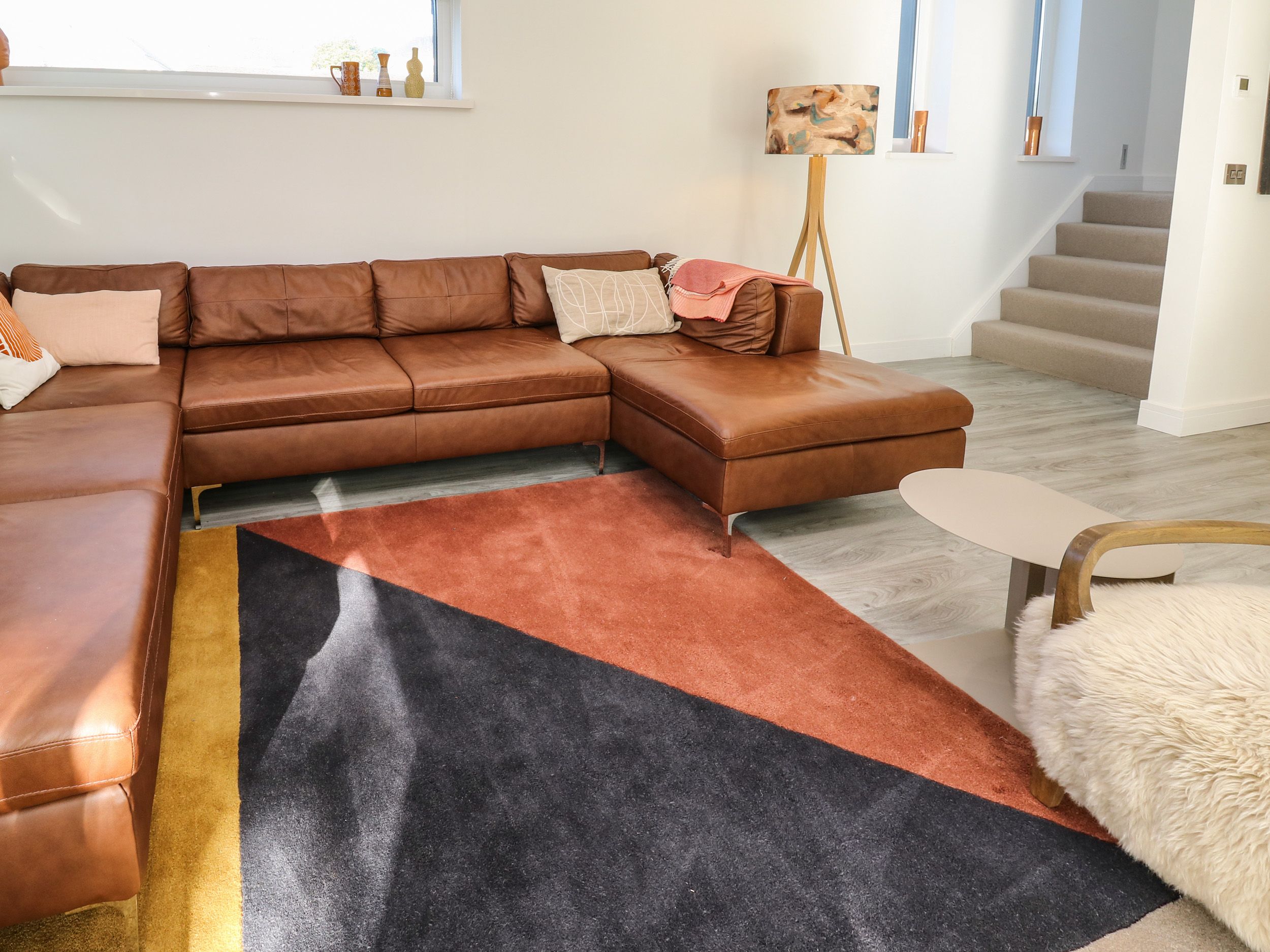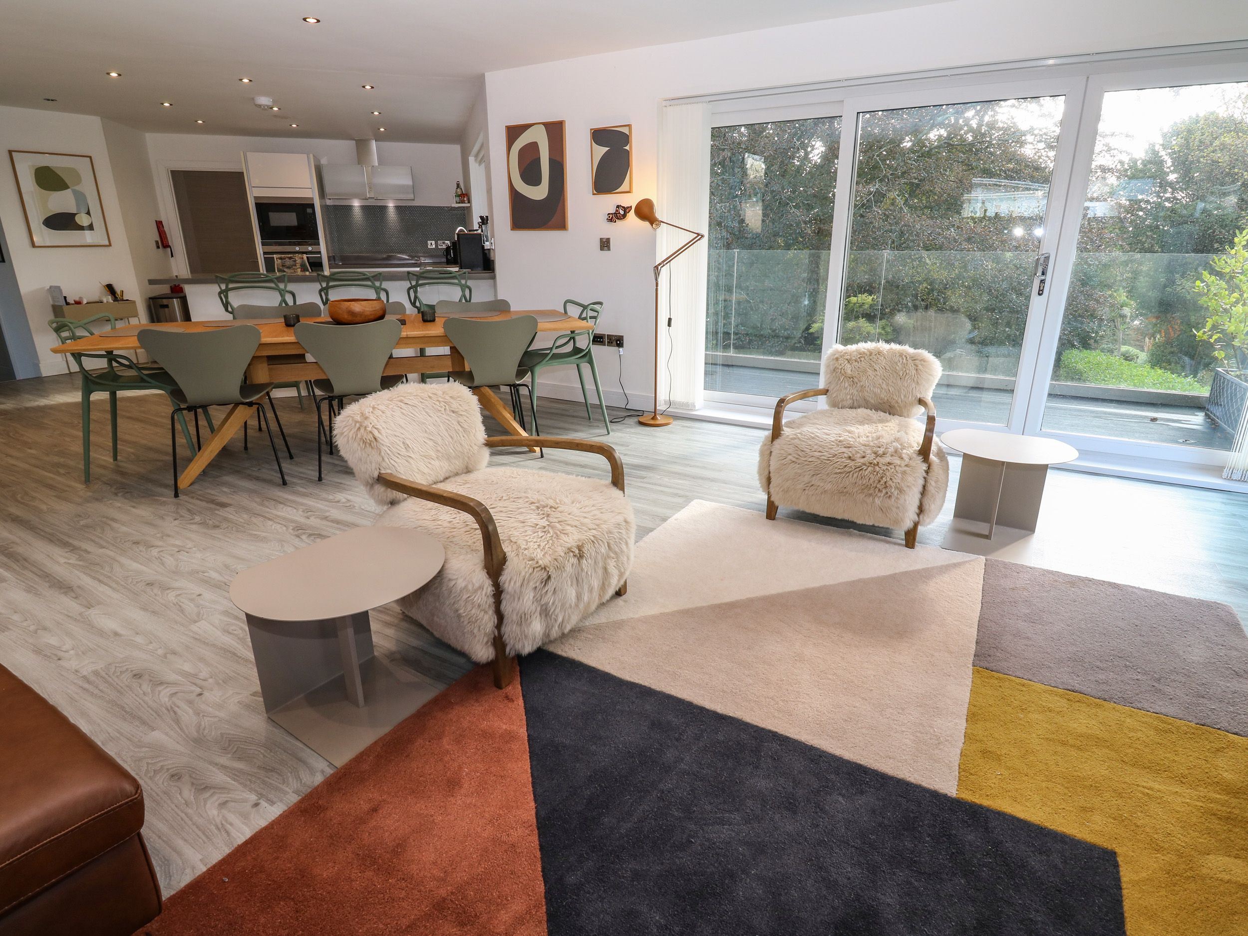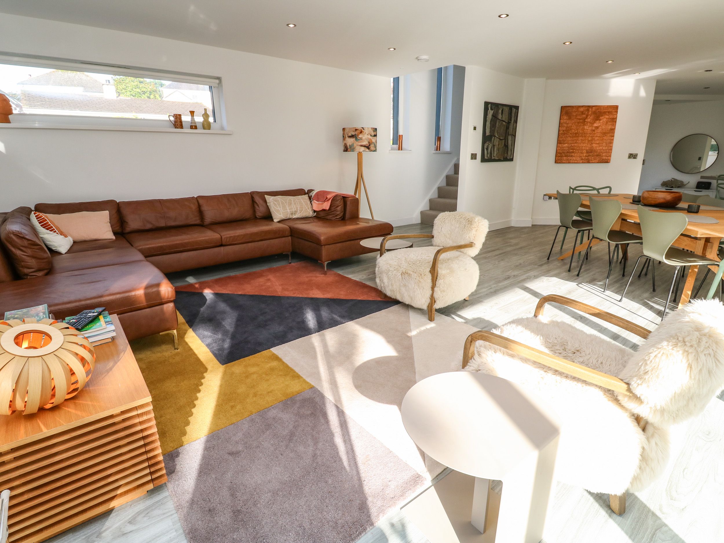 Accomodation Details Over three floors. Five bedrooms: 1 x upstairs king-size with vaulted ceiling, balcony, walk-in wardrobe, and en-suite walk-in shower, basin, and WC. 1 x upstairs king-size (can split into 2x singles), with vaulted ceiling, Juliet balcony, en-suite walk-in shower, basin, and WC. 1 x Lower-ground-floor king-size with walk-in wardrobe, en-suite walk-in shower, basin, and WC. 1 x lower-ground-floor twin with additional single truckle bed. Study with sofa bed suitable for a child. Lower-ground-floor bathroom with bath, walk-in shower, basin, and WC. Cloakroom with basin and WC. Open-plan living space with kitchen, dining area and sitting area with balcony. Utility.