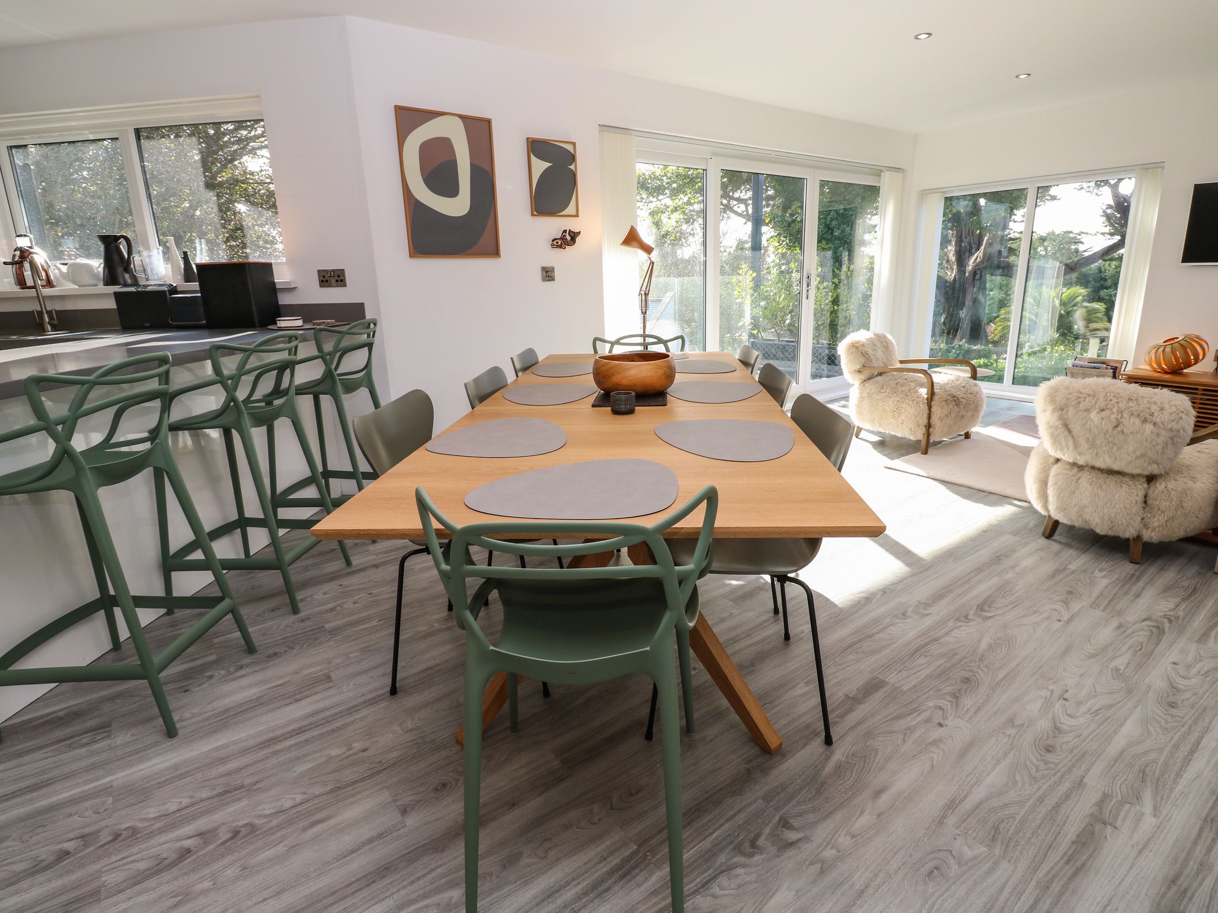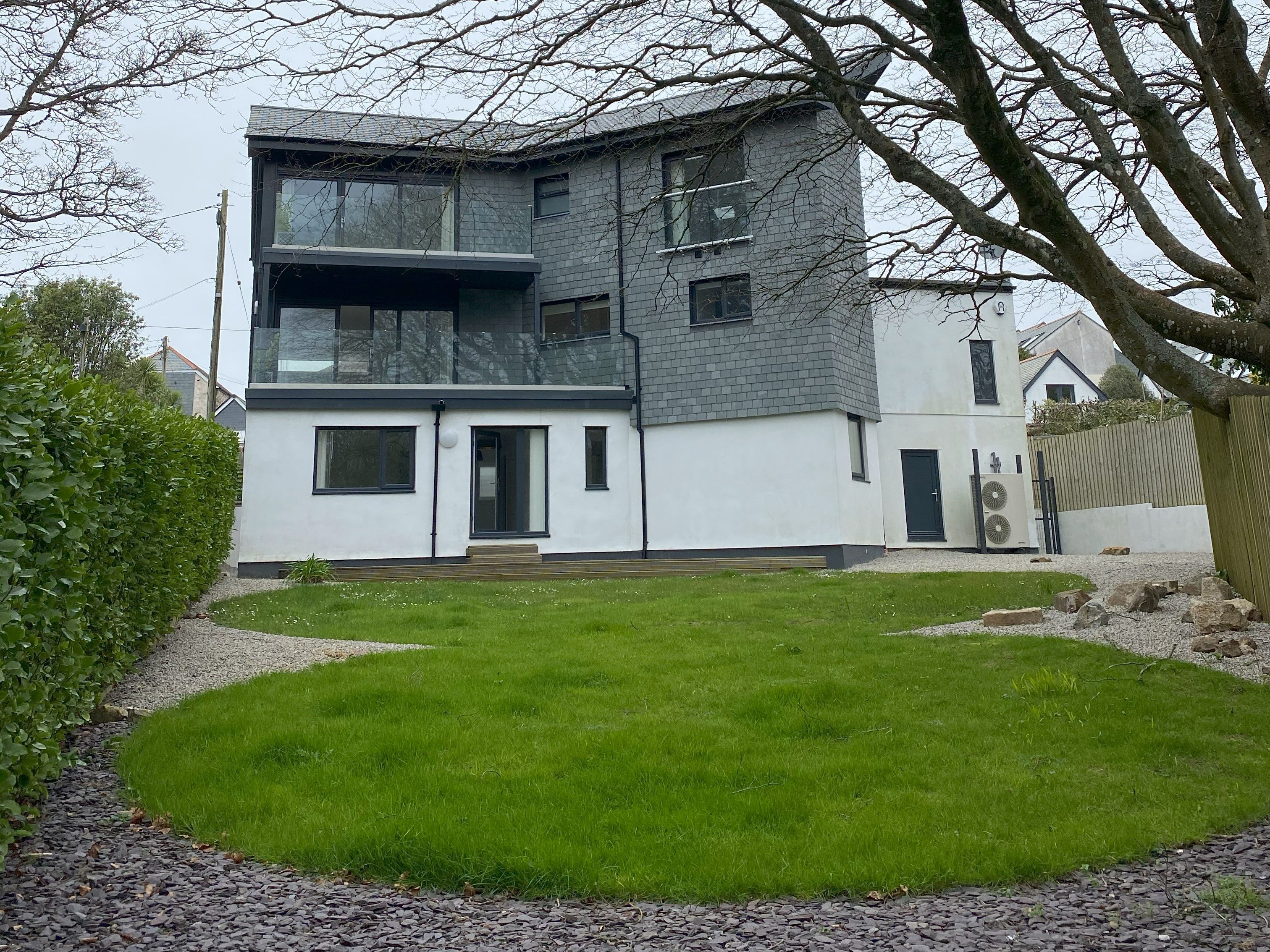 Amenities Air source heat pump with underfloor heating throughout. Electric oven and conduction hob, microwave, fridge/freezer, additional fridge, washing machine, tumble dryer, dishwasher. Smart TV, WiFi, Fuel and power inc. in rent. Bed linen and towels inc. in rent. Private driveway for 2 cars. Enclosed rear garden with lawn, decking and furniture, 2 balconys with seating, secure bike storage. Sorry, no smoking. Shop (deli/bistro) 0.6 miles, pub 0.1 miles, beach 0.6 miles. Note: There are steps up to the entrance of the property, and throughout the home, unsuitable for those with limited mobility.