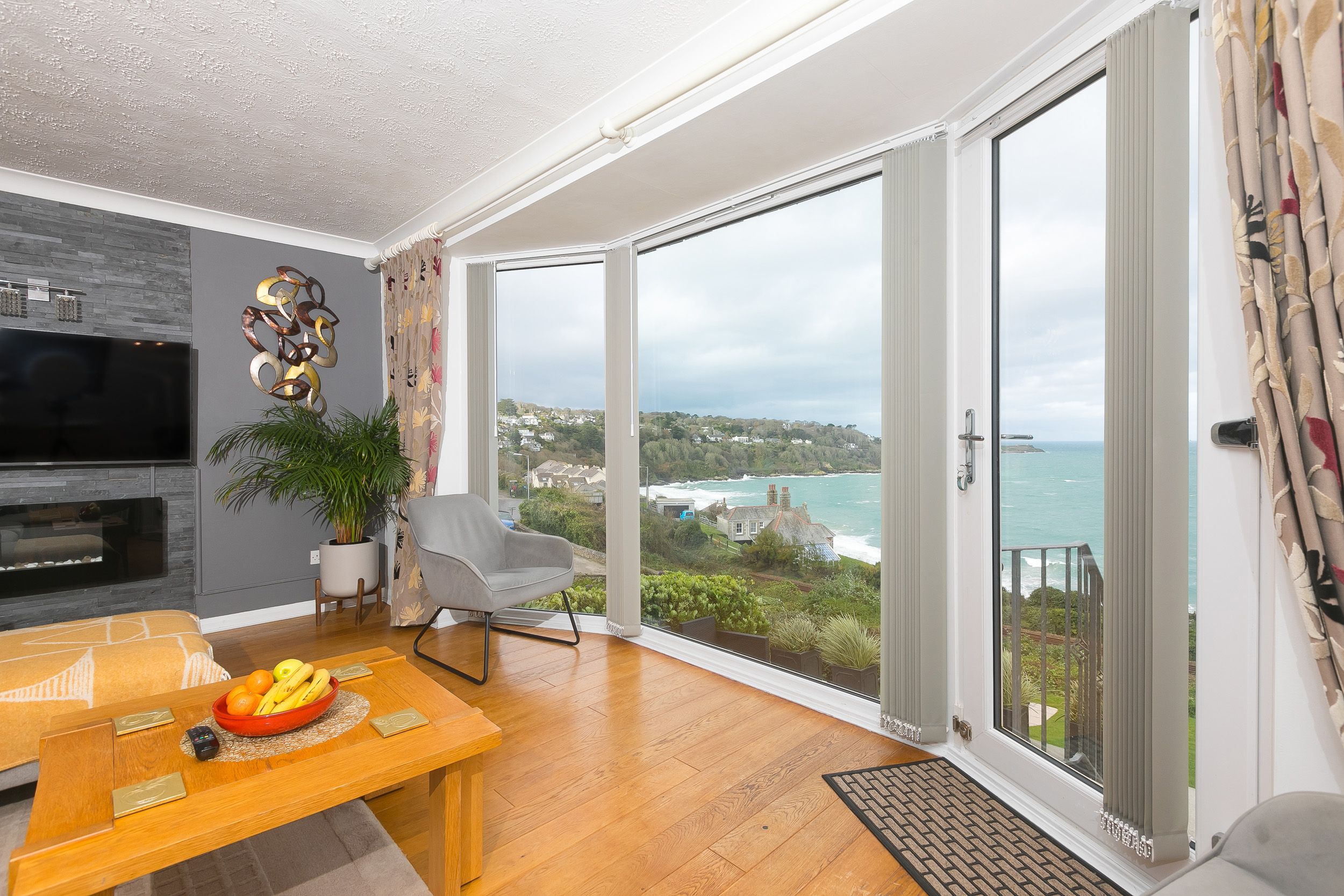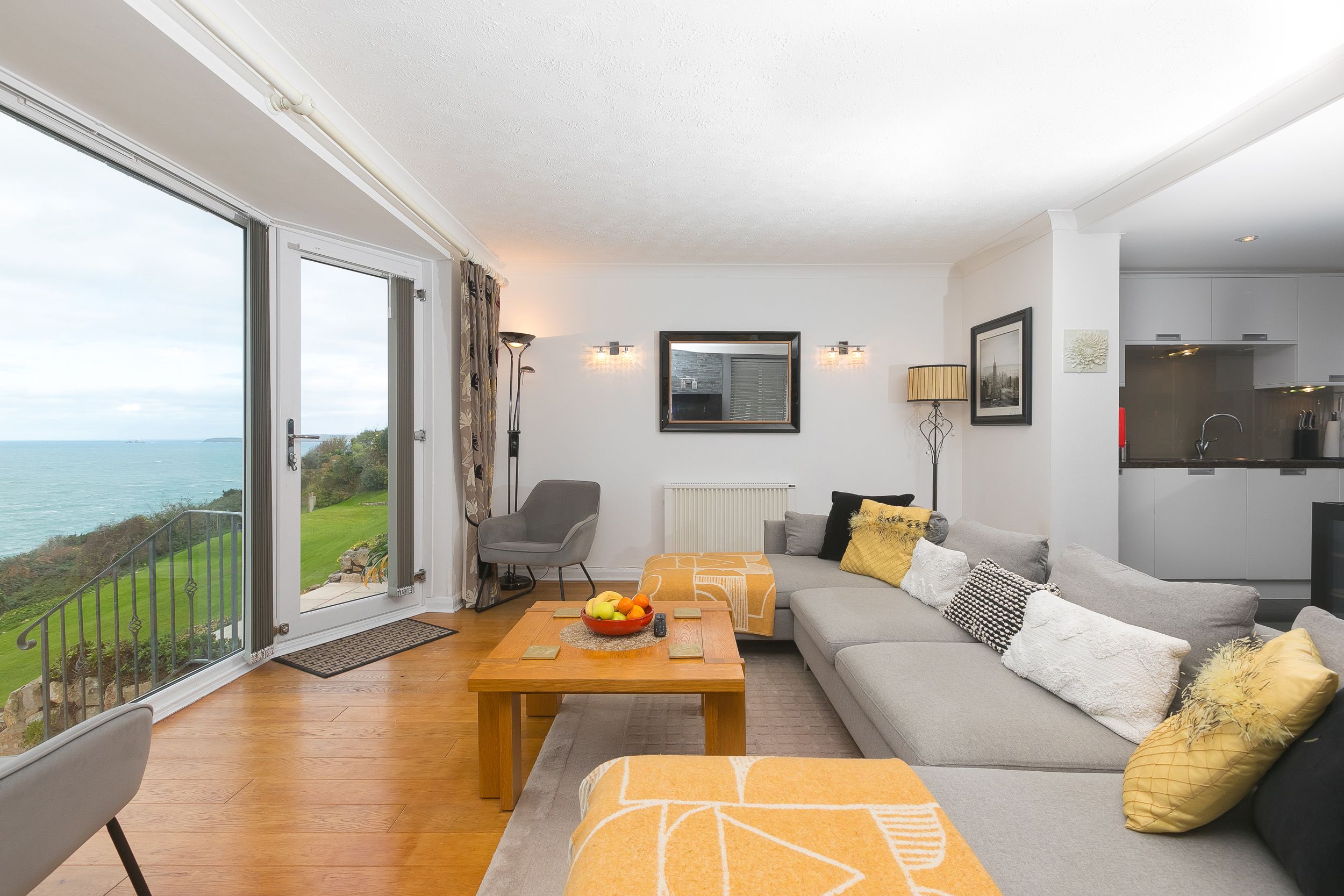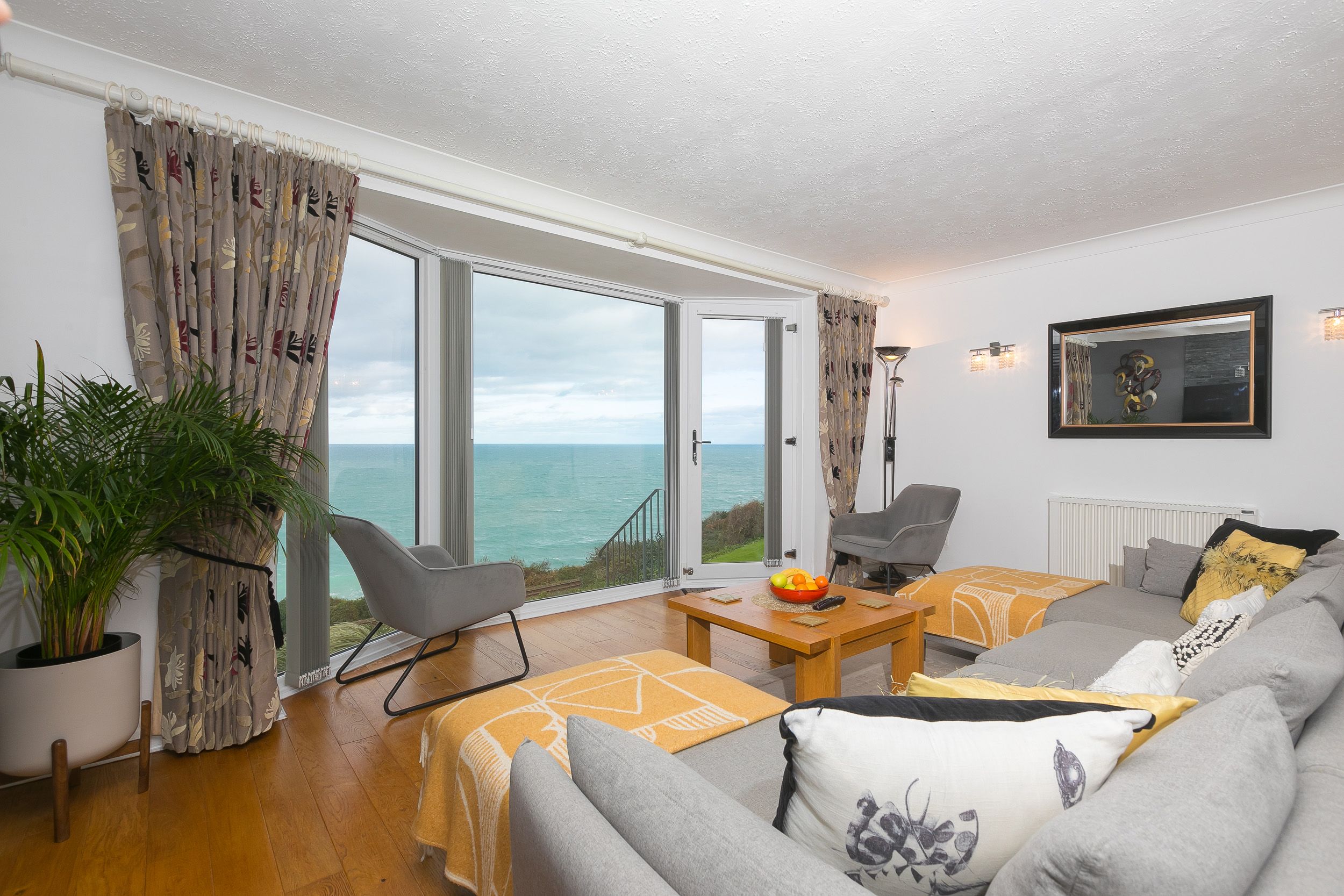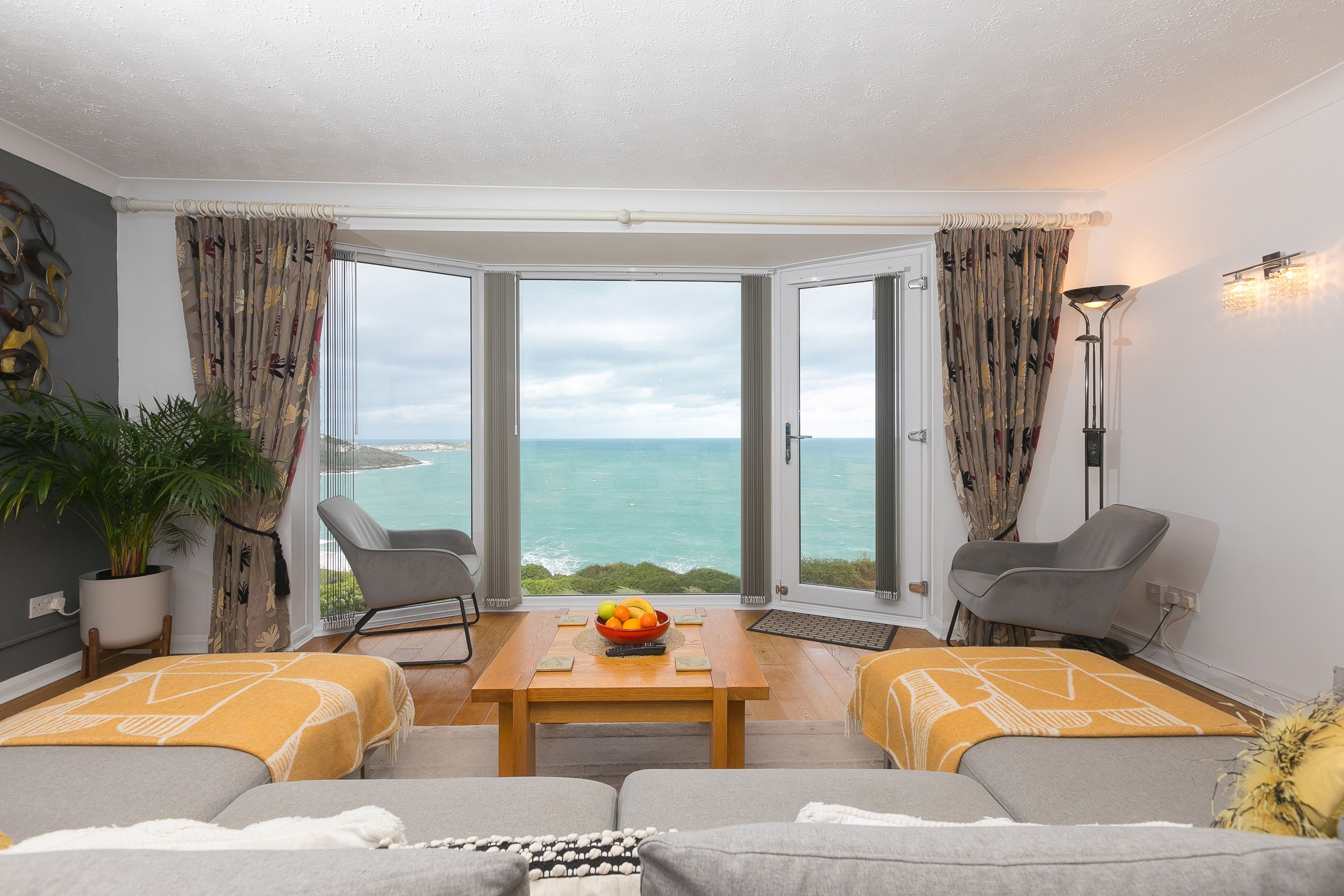 Holiday home Ocean Edge is set across one floor and has two bedrooms, including a king-size and a family room with a double, day bed, and TV. There is also a bathroom with a freestanding bath and walk-in shower, along with an open-plan living space with kitchen, dining area and sitting area. Appliances include an electric double oven and hob, microwave, fridge/freezer, dishwasher, wine cooler, and coffee maker. For entertainment, there is a Smart TV, TV and WiFi. Outside, there is parking, a private front garden with lawn, patio, furniture, and access to the coastal path, and a private rear courtyard with a bench. Fuel, power, bed linen and towels are all included in the rent. Sorry, this is a pet-free, smoke-free property. You can find a shop, pub and beach within 0.5 miles or less. Note: There are external steps. Note: Check-in from 4pm and check-out by 10am. Enjoy some of the best sea views in Cornwall from Ocean Edge.