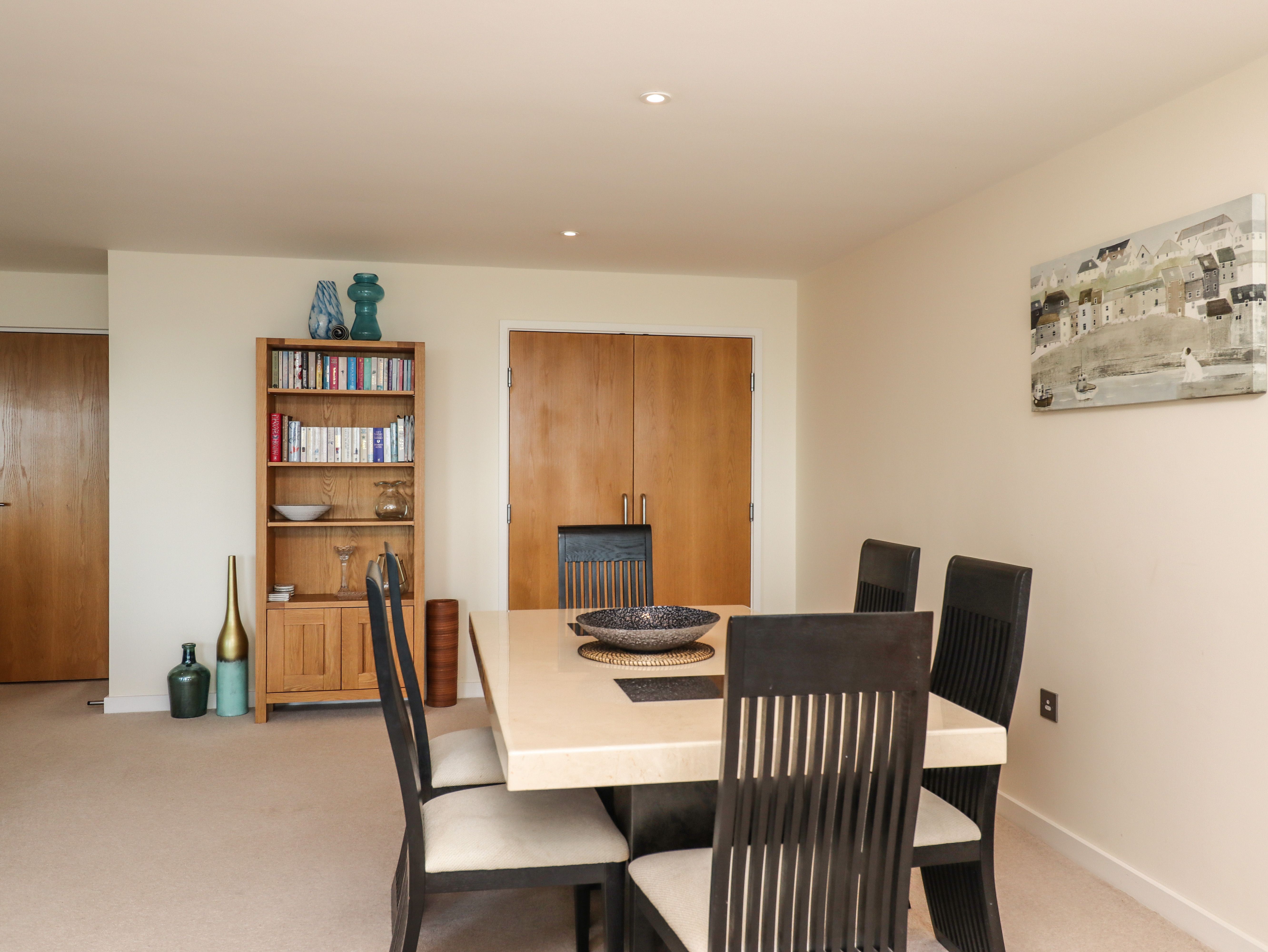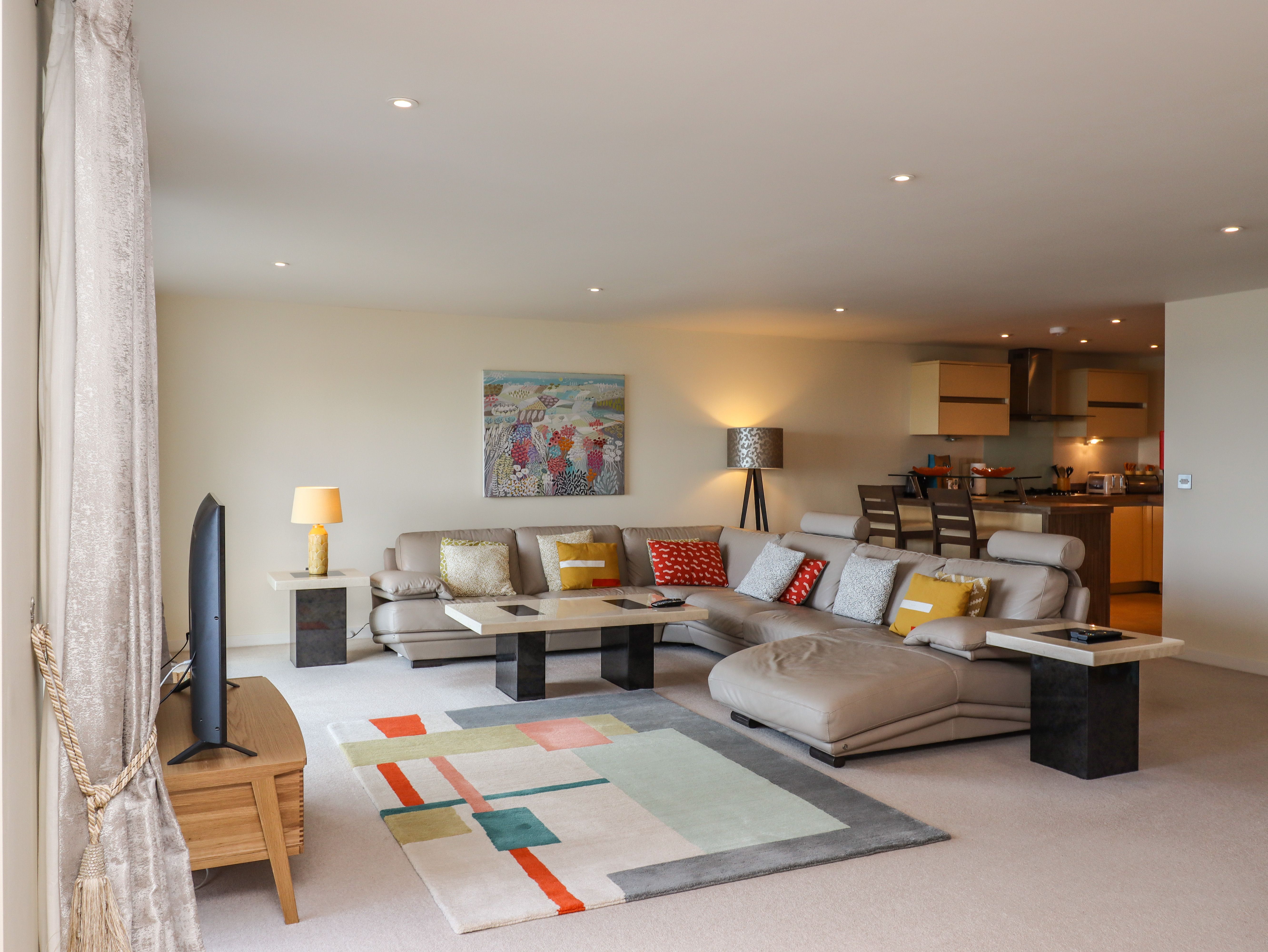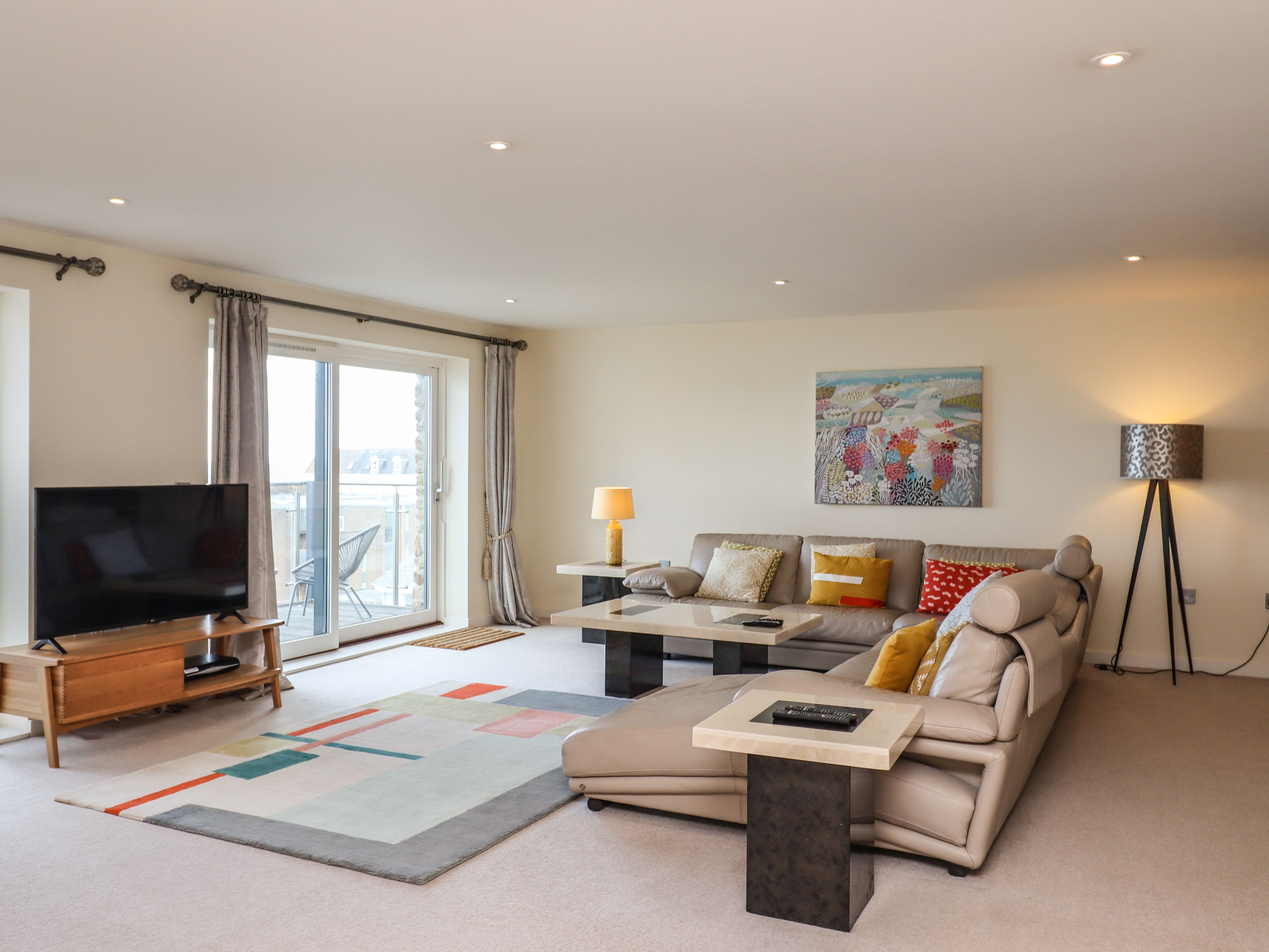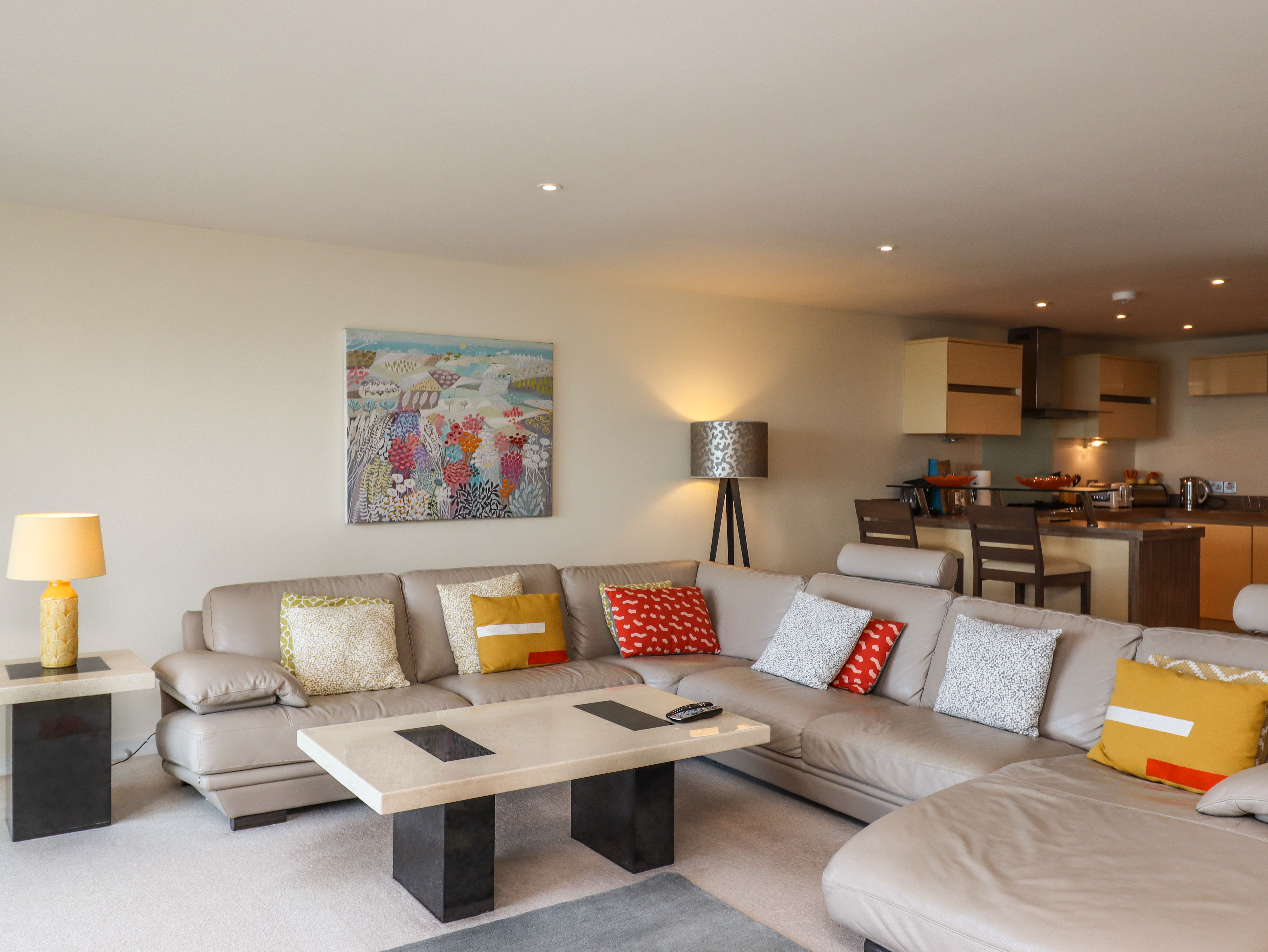 Accomodation Details Penthouse apartment. Two-bedrooms: 1 x king-size with LCD Freeview TV and en-suite walk-in shower, basin and WC, 1 x twin with LCD Freeview TV. Bathroom with bath, shower over, basin, heated towel rail and WC. Open-plan living space with kitchen, dining and sitting area with balcony
