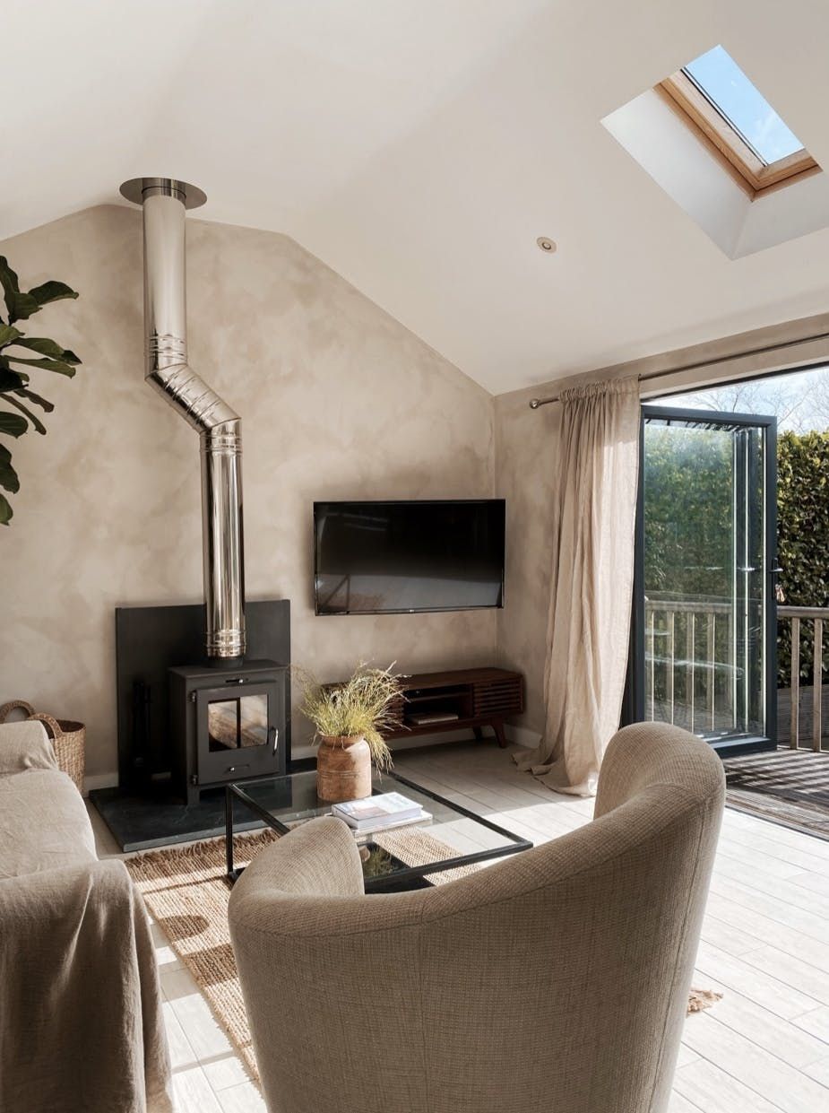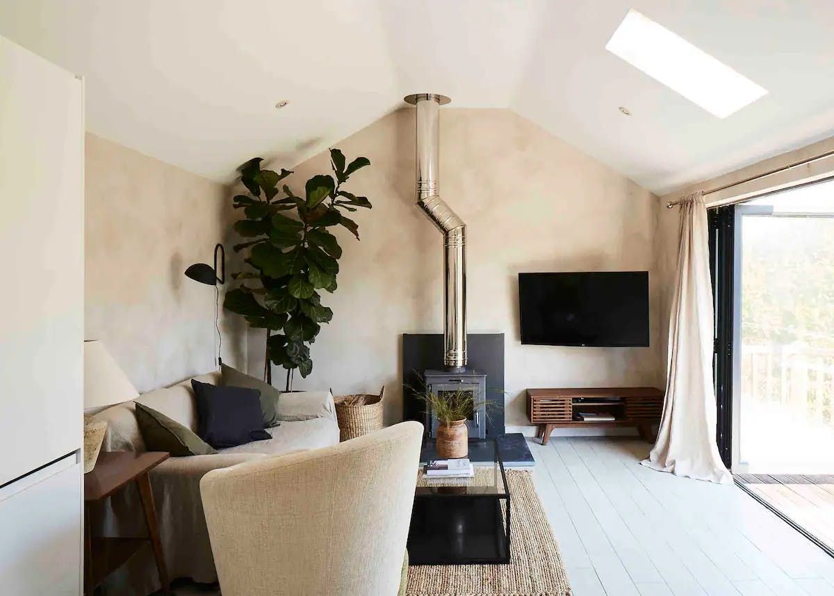 Listen to the trickling stream with a cup of coffee in hand, or surround yourself with views of verdant greens and ocean blues on the elevated viewing platform. The south-facing terrace area is a lovely little sun trap and makes for an idyllic reading or sunbathing spot for ever-craved lazy days soaking up some vitamin D. On chillier days curl up in front of the wood burner fire with your favourite Netflix show playing in the background.