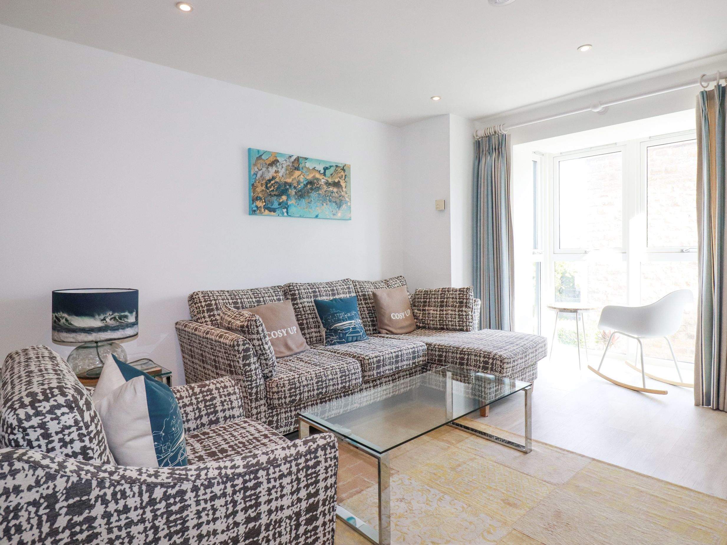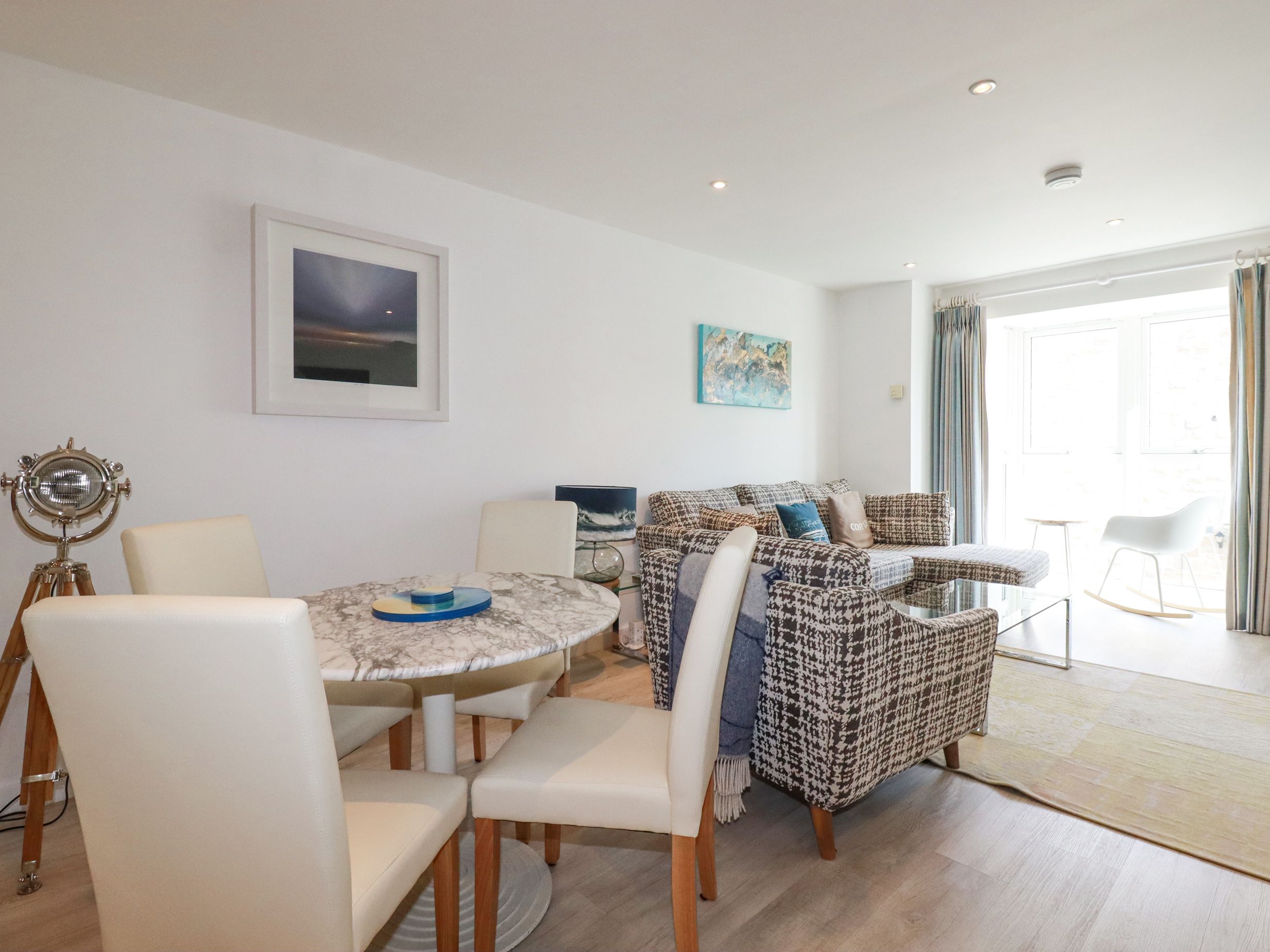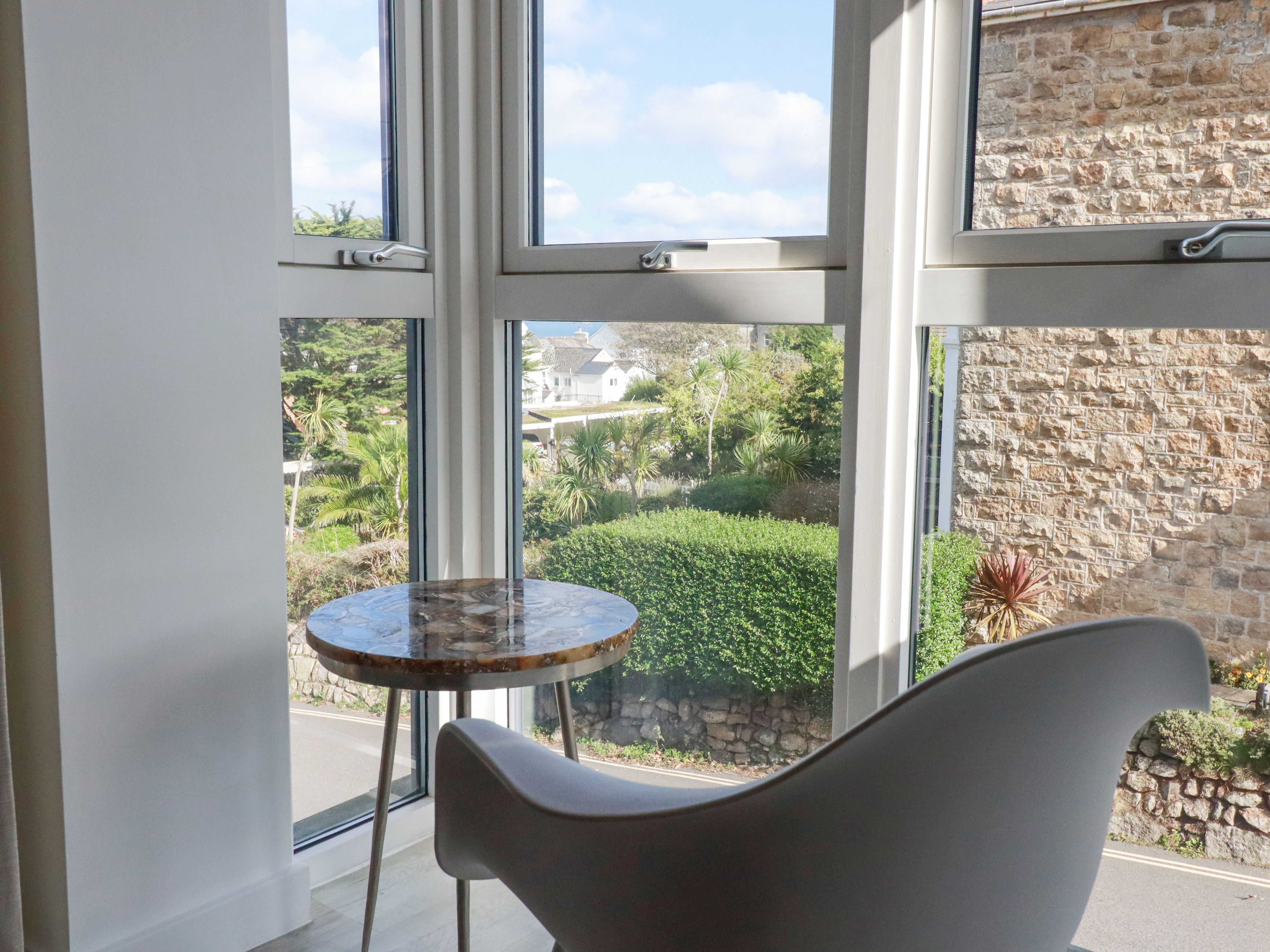 Holiday home The Trick, a first-floor apartment, consists of a kitchen with double electric oven, gas hob, fridge/freezer, microwave, washer/dryer, dishwasher, coffee maker, and iron with ironing board, a dining area with dining table, and a sitting area with Apple TV, Sonos speaker, and DVD player. The bedroom consists of a super-king size (zip/link) with TV, along with a bathroom. WiFi, fuel, power, bed linen, and towels are included in the rent. Outside, there is a shared front lawn and designated parking for one car in a private car park. Sorry, no pets and no smoking. Shop and pub 0.3 miles, beach 0.2 miles. However you decide to spend your days here in Cornwall, guarantee a memorable getaway with a stay at The Trick. Note: Babes in arms only. Note: There is no lift access and there is one flight of stairs to the front door of the property. Once inside the entrance foyer, there are sixteen steps ascending to the entrance of the apartment.