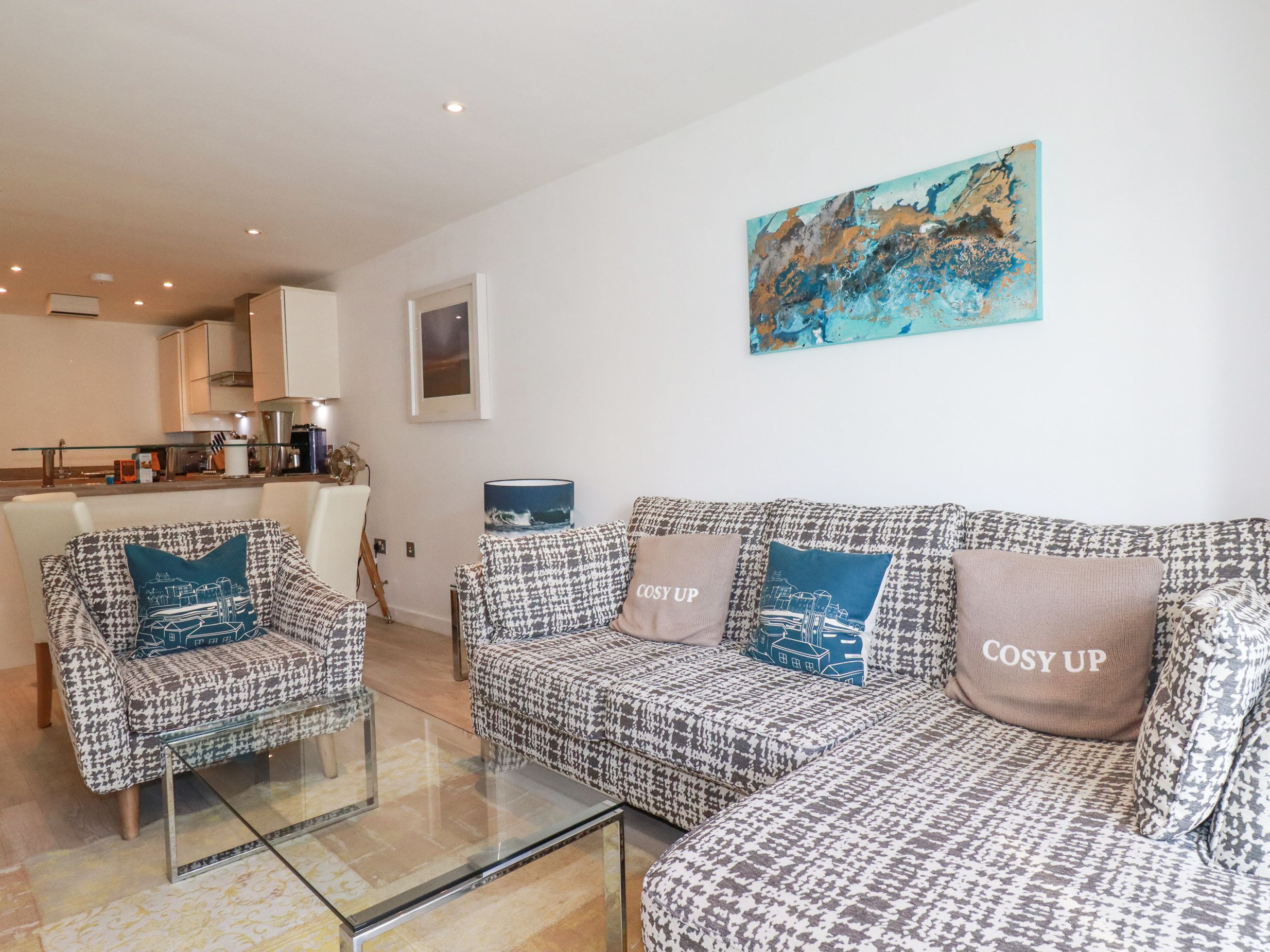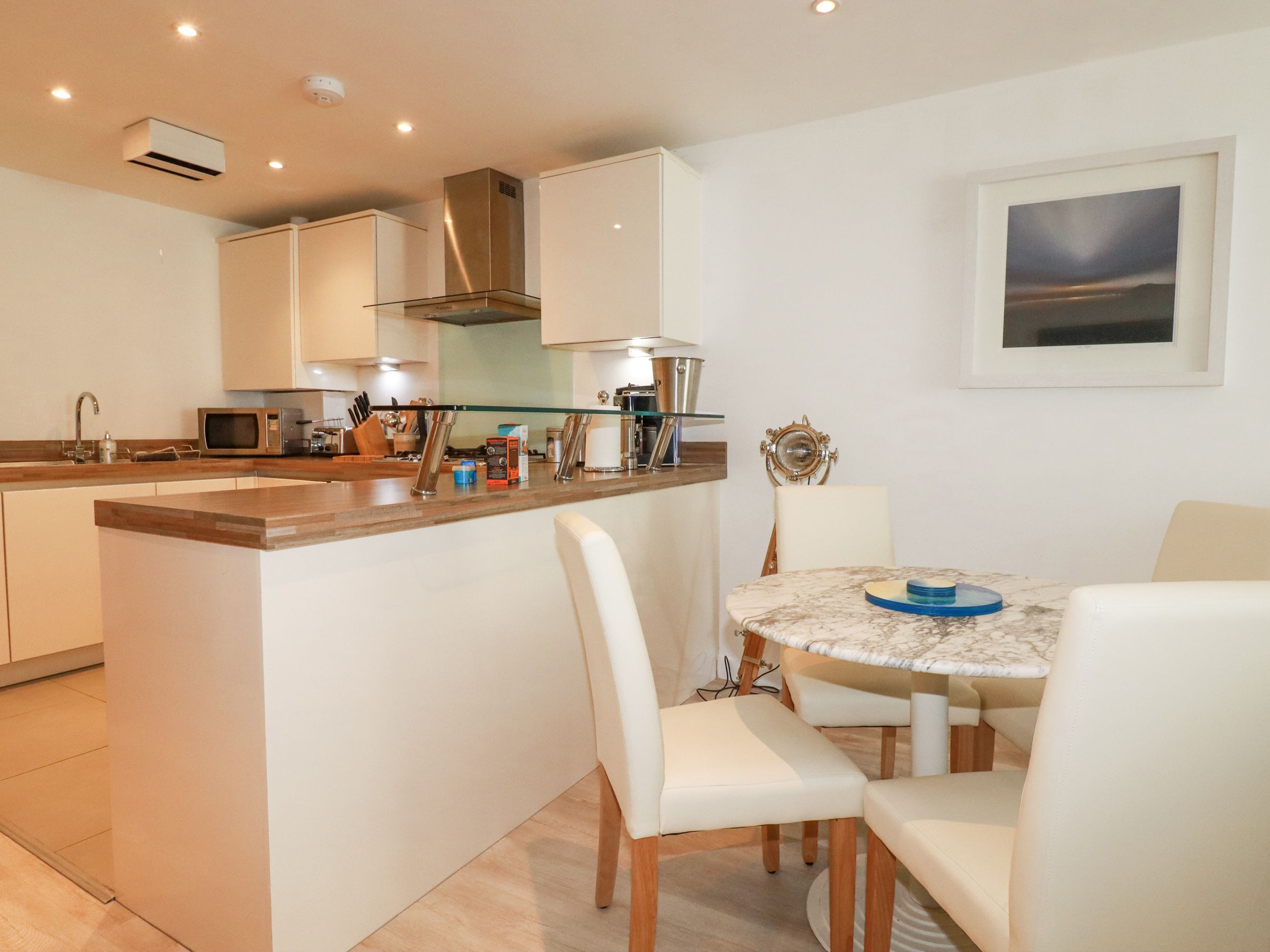 Accomodation Details First-floor apartment. One super-king-size bedroom (zip/link, can be twin on request) with TV. Bathroom with bath, shower over, basin, heated towel rail, and WC. Open-plan living space with kitchen, dining area, and sitting area