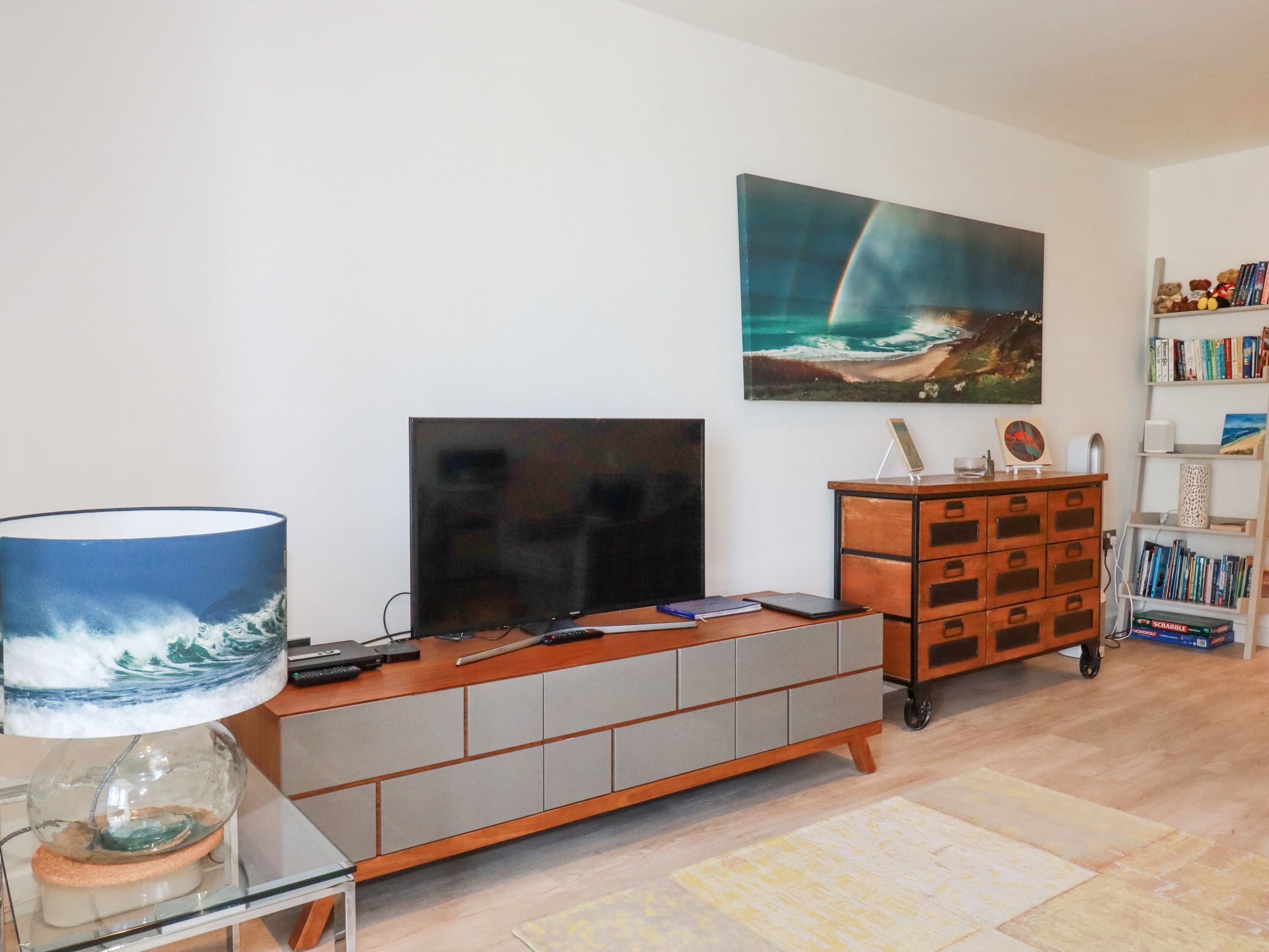 Amenities Electric heating with underfloor heating. Double electric oven, gas hob, microwave, fridge/freezer, washer/dryer, dishwasher, coffee maker. TV, Apple TV, DVD player, WiFi. Fuel and power inc. in rent. Bed linen and towels inc. in rent. Designated parking for 1 car in private car park. Shared front lawn. Sorry, no pets and no smoking. Shop and pub 0.3 miles, beach 0.2 miles. Note: Babes in arms only. Note: There is no lift access and there is one flight of stairs to the front door of property. Note: Once inside the entrance foyer there are 16 steps ascending to the entrance of apartment