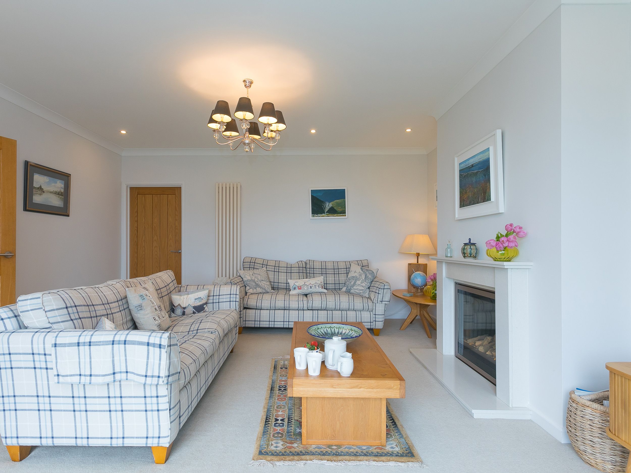 Holiday home The living areas in the property consist of an open-plan living area with a kitchen with Rangemaster gas range cooker/grill, 2 x oven, warming oven, five ring gas hob with wok burner, , a hotplate/griddle, microwave, , American style fridge/freezer, coffee machine, washing machine, dishwasher, dining seating for eight, a first-floor sitting room with woodburning stove, HD TV with SKY HD, Blu-Ray player, Sonos Playbar, second sitting room with LCD TV and DVD player, third lounge with LCD TV and Blu-Ray player, and two balconies. The bedrooms consist of a super-king with en-suite bathroom, a king-size, a ground-floor king-size with en-suite shower room, and a twin, along with a bathroom and a shower room. Outside, there is a seaward facing tiered garden with decking area, rear terrace, outside furniture including BBQ, 2 x sun loungers, table, and chairs. Within 0.5 miles, you will find a shop, and within 0.3 miles, a pub, and please note that this is a non-smoking property. WiFi, fuel, power, bed linen and towels are all included in the price. One well-behaved pet welcome. Please note, the stairgates cannot be used at the bottom of the living room stairs due to one side of the stairway being constructed with a glass balustrade. Secure your stay at Treetops.
