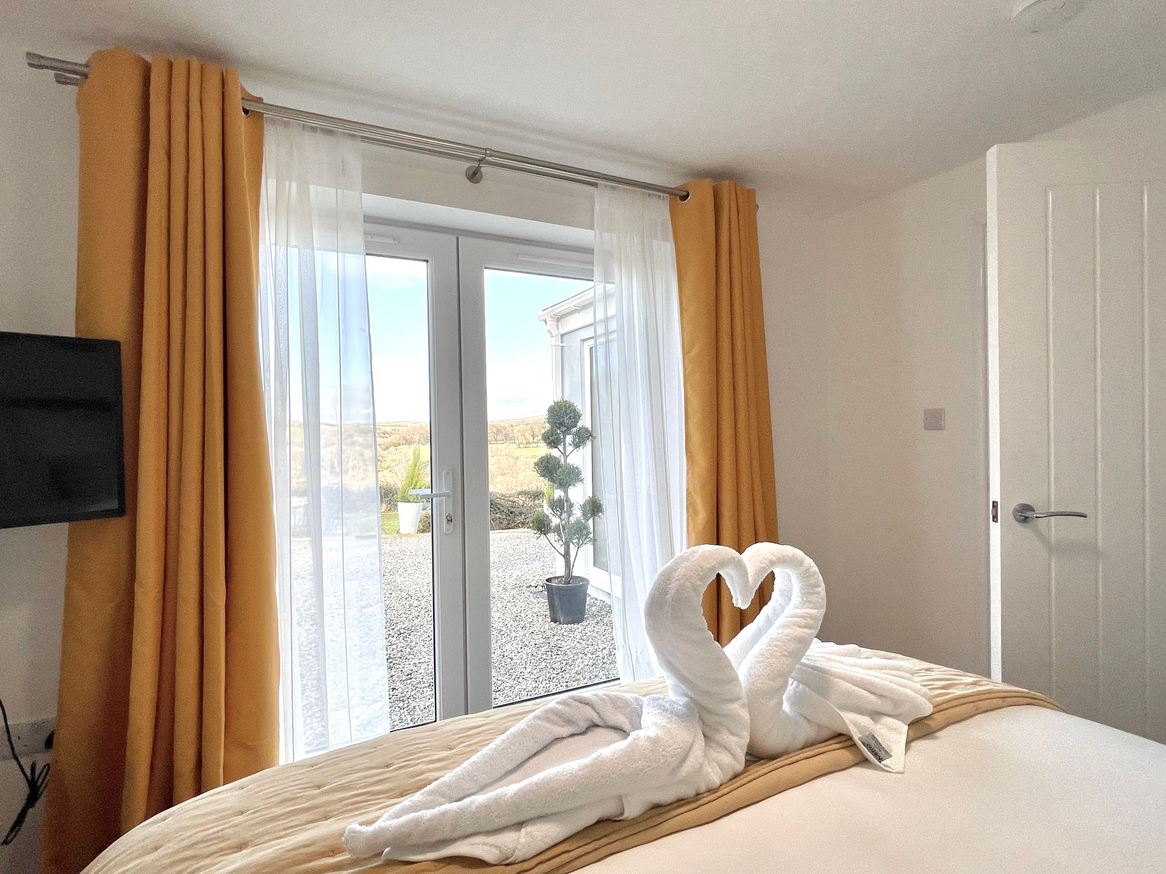 Please note: This property only accommodates weekly bookings starting on a Friday. Single-storey. One king-size bedroom. Shower room with walk-in shower, basin and WC. Open-plan living space with kitchen, dining area and sitting area with wood-burning stove