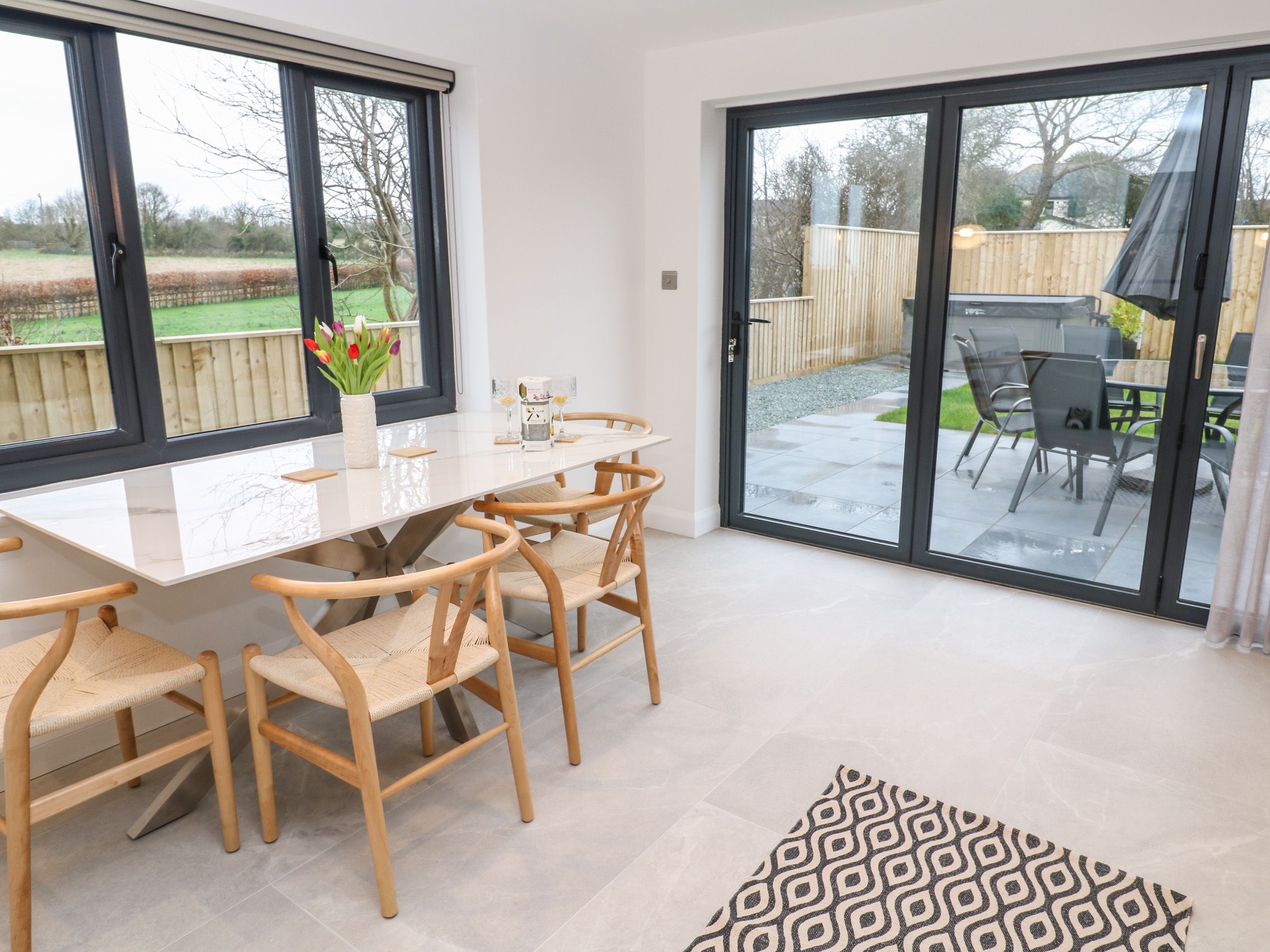 Underfloor heating throughout, Air source heat pump. Electric oven, induction hob, combination microwave oven, fridge/freezer, washing machine, tumble dryer and dishwasher. 4 x Smart TV and WiFi. Fuel, power inc. in rent. Bed linen and towels inc. in rent. No through lane leading to ample off-road parking for 4 cars. Enclosed side and rear garden with lawn and patio with generously sized Master Spas hot tub, with 5 seats and 1 lounger. Two well-behaved dogs welcome, if you wish to bring more please enquire first. Sorry, no smoking. Shop 0.1 miles, pub 0.1 miles, Restaurant and Farm Shop 1 mile and beach 2 miles. Please note the property has an open tread staircase - please take care when using them. Please note the high chair is a baby booster seat.