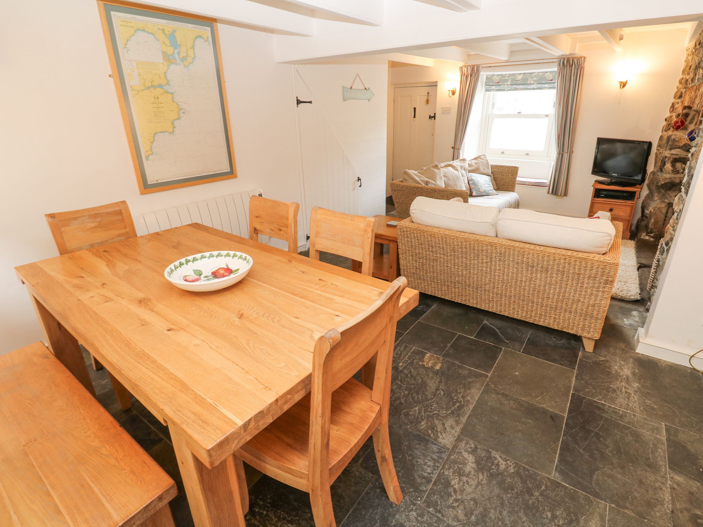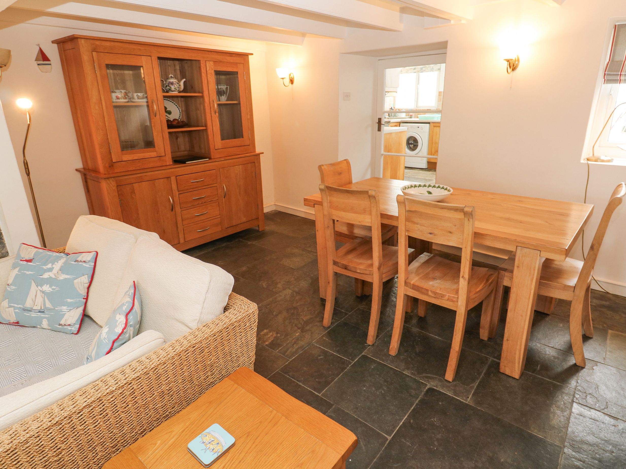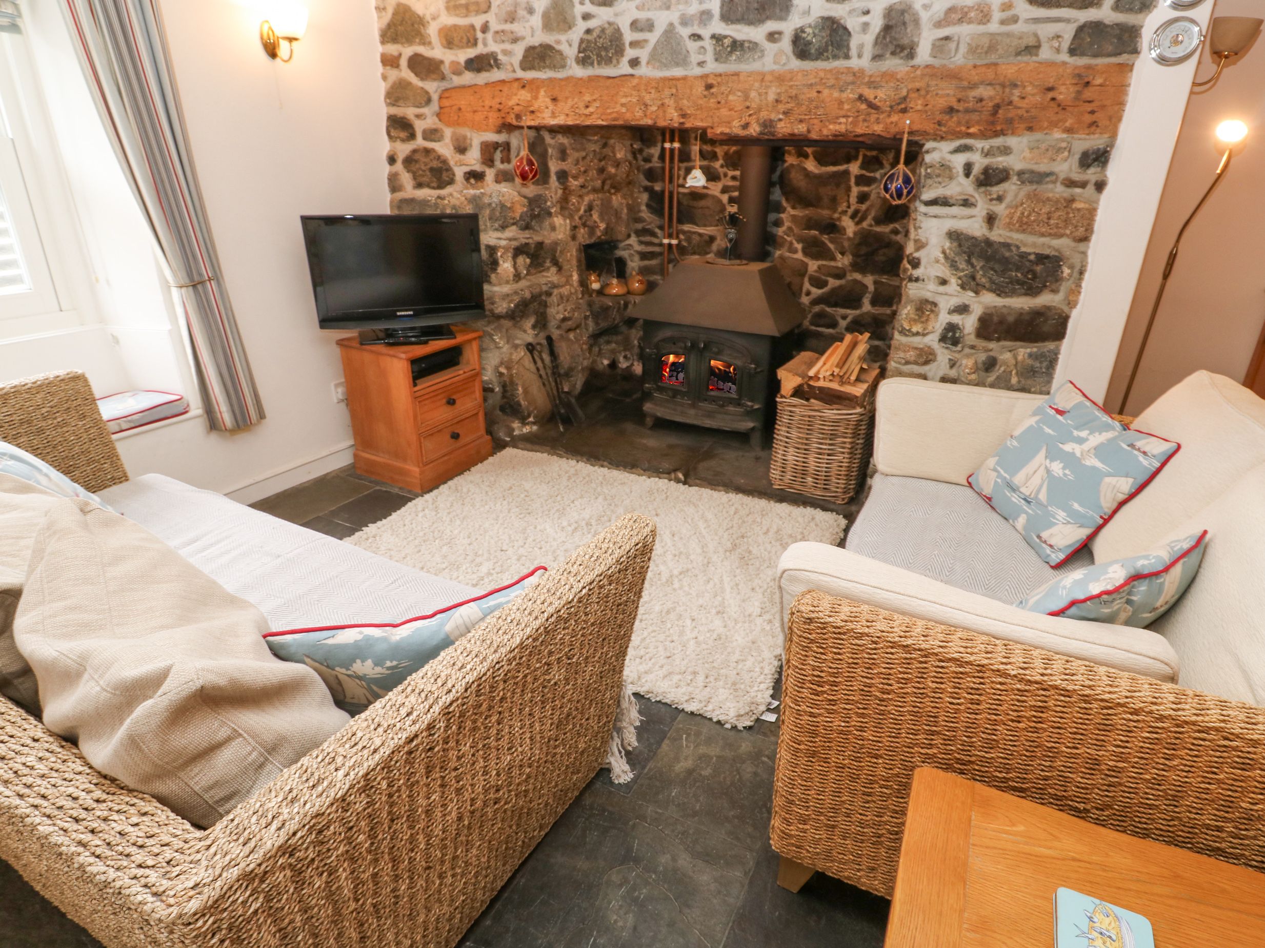 Amenities Electric central heating. Electric oven and hob, microwave, fridge, freezer, washing machine, dishwasher. Smart TV, WiFi. Fuel, power, and starter pack for woodburning stove inc. in rent. Bed linen and towels inc. in rent. Roadside parking available. Rear garden with lawn and furniture. One well-behaved dog welcome. Sorry, no smoking. Shop and pub 0.1 miles, beach 0.2 miles. Note: Steep staircase at the property, please take care. Note: Steep steps up to garden