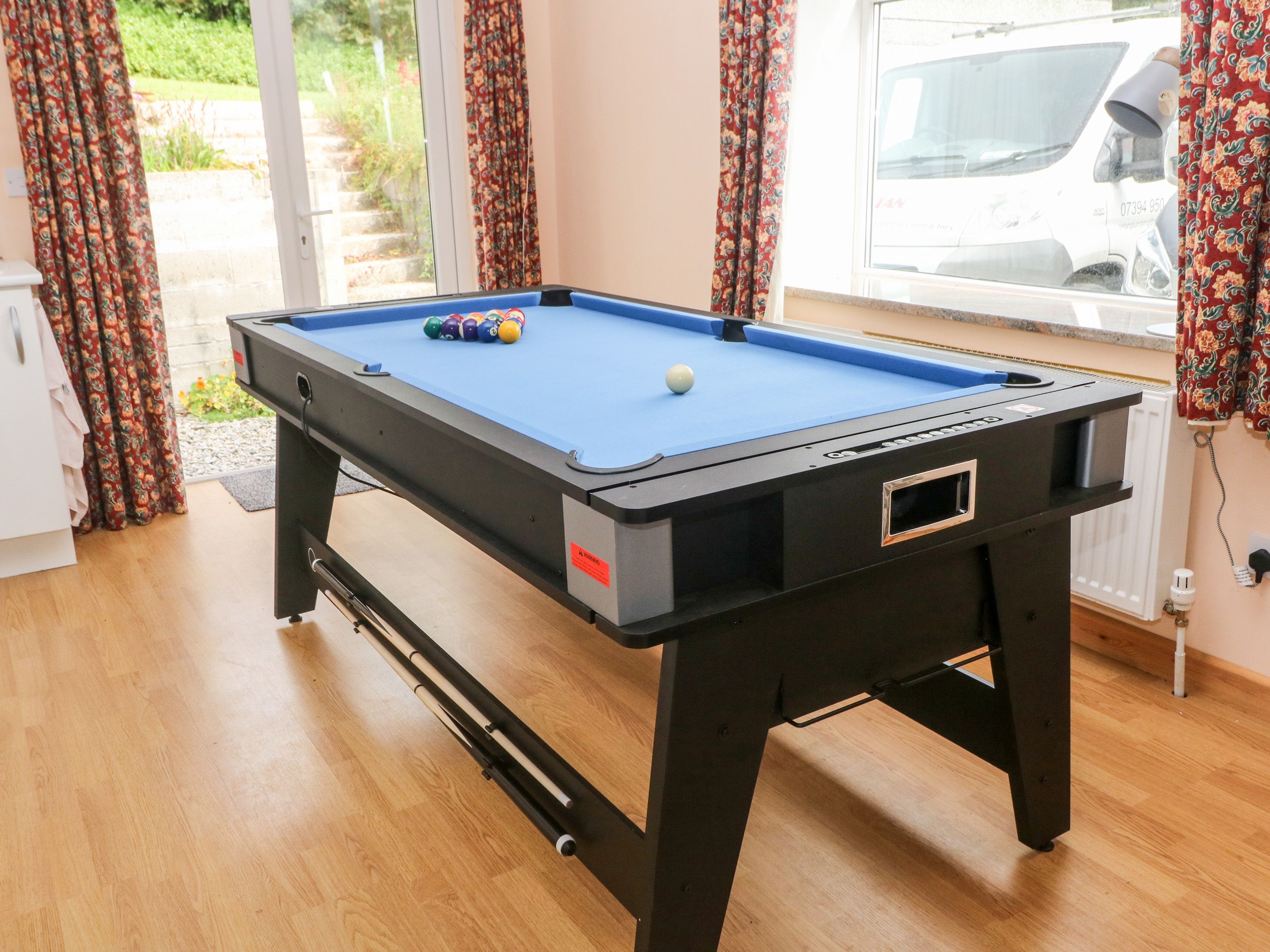 Amenities Gas central heating and two woodburning stoves. Electric oven and hob, microwave, fridge/freezer, washing machine x 2, dishwasher x 2, 2 x TVs, Superfast Fibre Broadband. Integrated Games Table: Pool / Table Tennis / Air Hockey. Two traditional folidng card tables available for bridge( or Poker). Sonus Sound system in Lounge and Dining Room. External hanging shed for wet suits. Fuel and power inc. in rent. Bed linen and towels inc. in rent. Travel cot, highchair and stairgate available on request. Private driveway parking for 6 cars. Garden with lawn, patio, furniture, wood store and barbecue. Two well-behaved pets welcome. Sorry, no smoking. Shop 0.4 miles, pub 0.5 miles, beach 0.3 miles