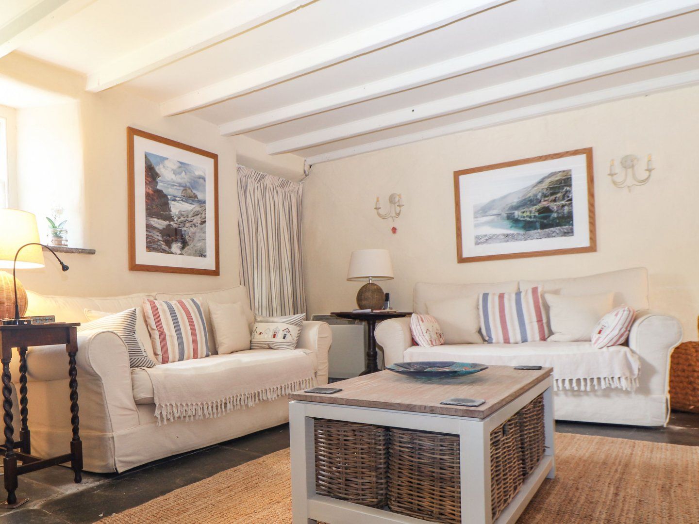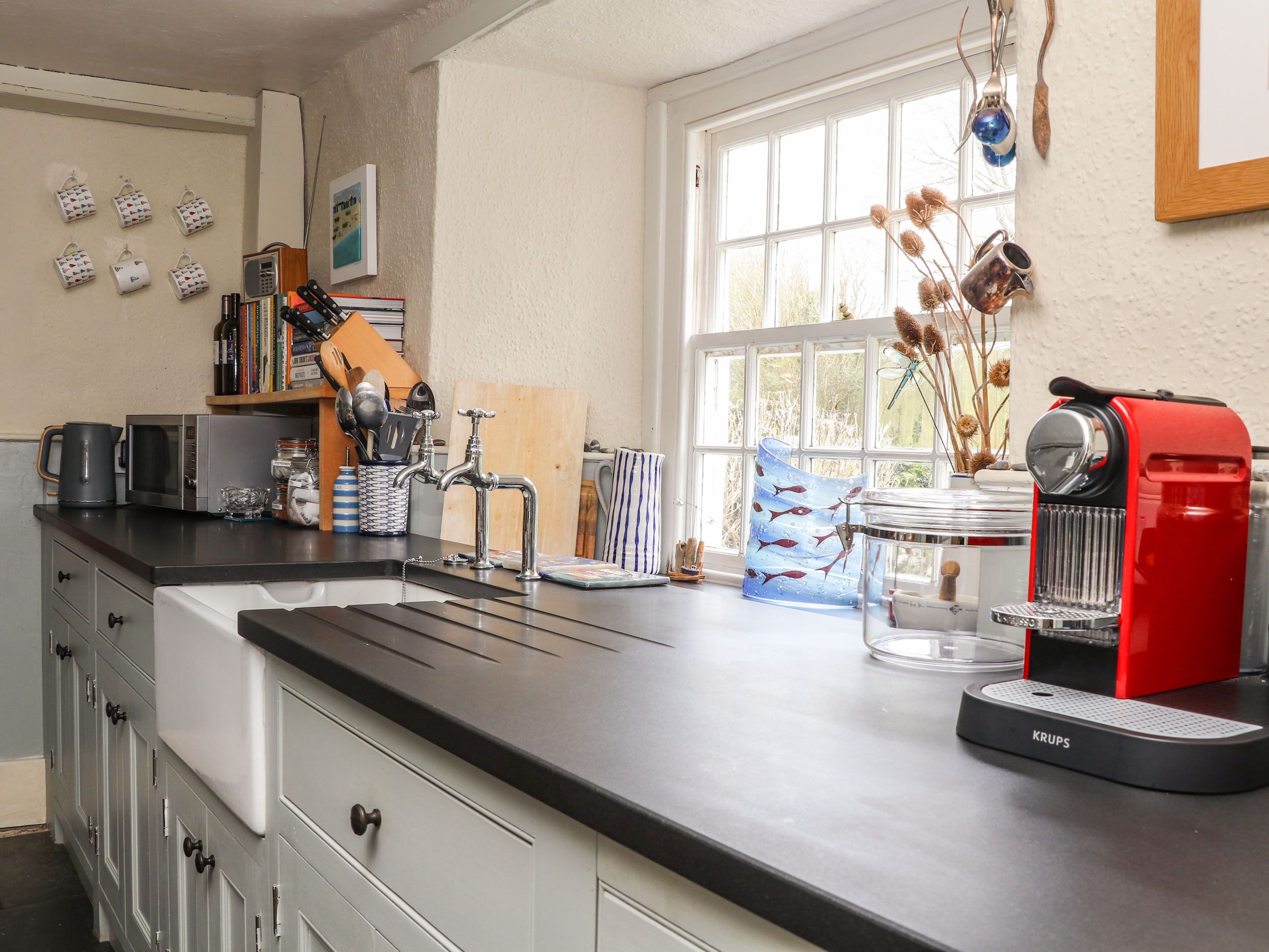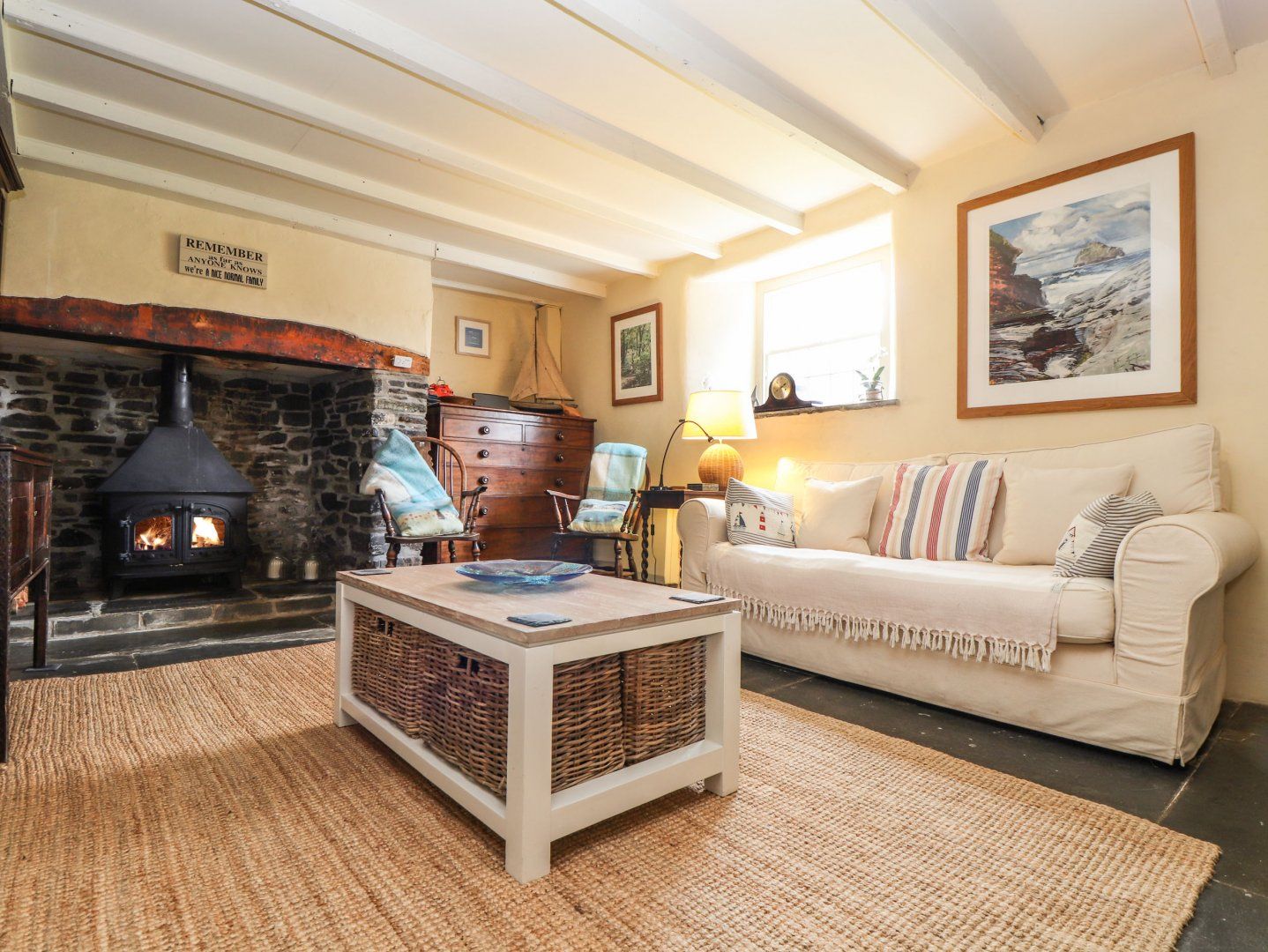 Amenities Electric central heating. Electric Range cooker with oven and hob, microwave, fridge, freezer, washer/dryer, dishwasher and coffee machine. 1 x Smart TV, WiFi and a selection of books. Fuel, power and starter for woodburning stove inc. in rent. Bed linen and towels inc. in rent. Travel cot and highchair available on request. Off-road parking for three small cars or two large cars. Enclosed front garden and enclosed rear garden with barbecue, furniture and rockery. Two well-behaved small dogs welcome. Sorry, no smoking. Nearby local shop,stocks all basics, pub and beach 1.7 miles. Note: Due to the property's age there is uneven flooring throughout and a number of steps and thresholds, please take care. Note: The woodburning stove in the ground-floor bedroom is not to be used. Note: The stairs to the first floor are uneven and steep, please take care. Note: There are low and exposed beams and a-frames that may limit head height, please take care. Note: The twin bedroom is accessed through the king-size and has its own steep and narrow staircase down to the sitting room. Note: The downstairs bathroom is accessed down two steps