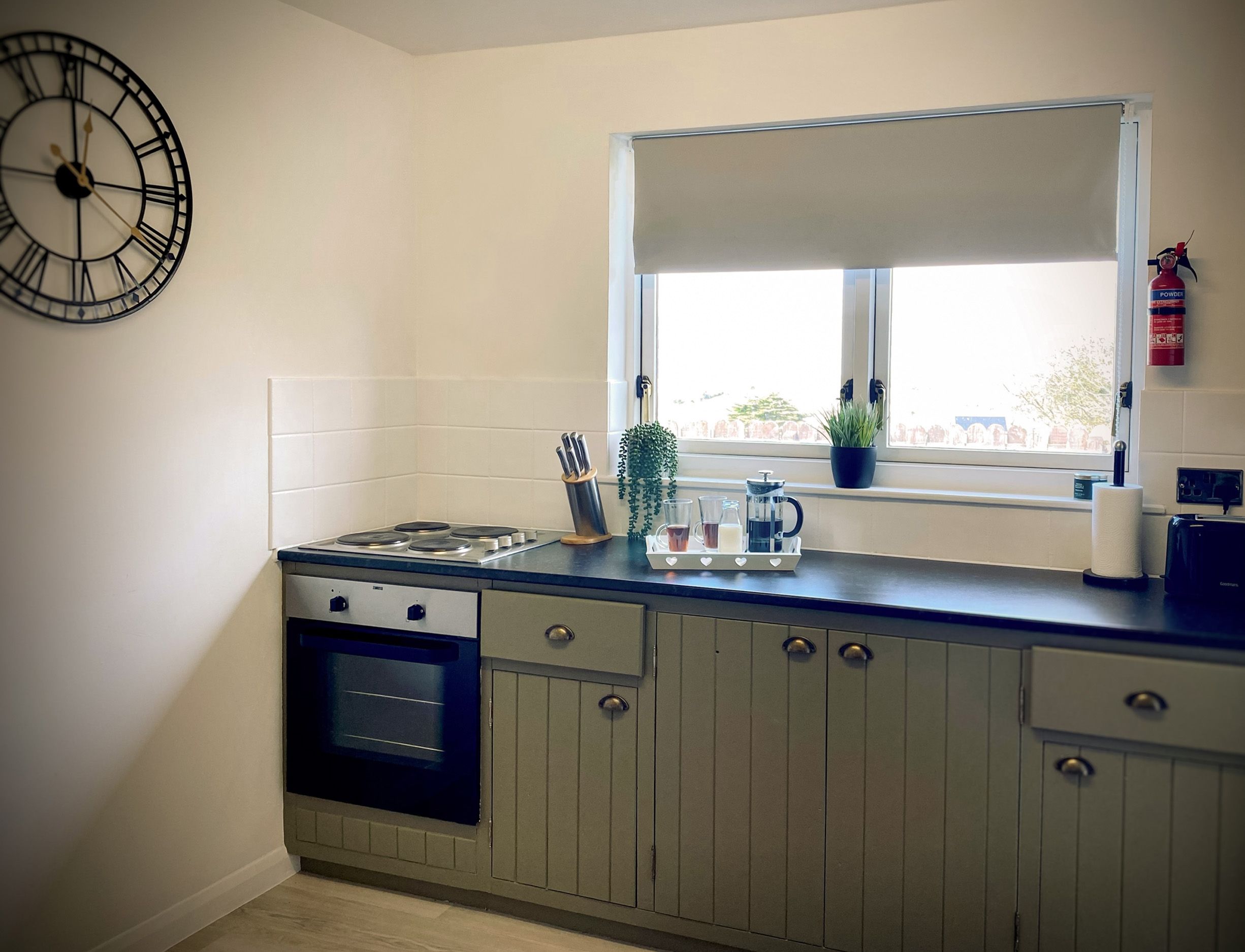Amenities Electric central heating. Electric oven and hob, fridge/freezer, washing machine, kettle. Smart TV, WiFi. Fuel and power inc. in rent. Bed linen and towels inc. in rent. Highchair available. Off-road parking for 2 cars. Enclosed rear garden with spectacular views of the sea, stunning sunsets and horses. Two well-behaved pets welcome. Sorry, no smoking. Shop 0.1 mile, pub 1.1 miles