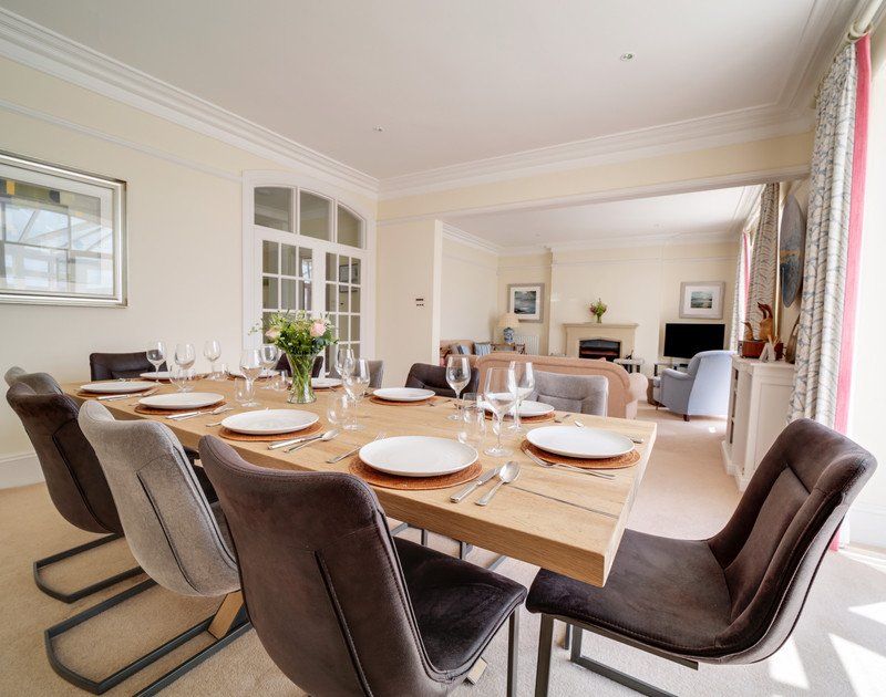 Accomodation Details Over three floors. Six bedrooms: 2 x super king-size bedrooms with estuary views (one with en-suite bathroom with bath, shower, basin, bidet and WC), 2 x twin bedrooms, 1 x double bedroom, 1 x second floor super king-size bedroom. Ground floor shower room with shower, basin and WC. First floor family bathroom with child friendly bath, basin and WC. First floor family shower room with shower, basin and WC. Second floor bathroom with bath, basin and WC. Ground floor cloakroom with basin and WC. Kitchen with island seating for two guests and informal bench and chair dining. Utility room. Open-plan dining area and sitting room with open fire. Conservatory. Playroom/media room.