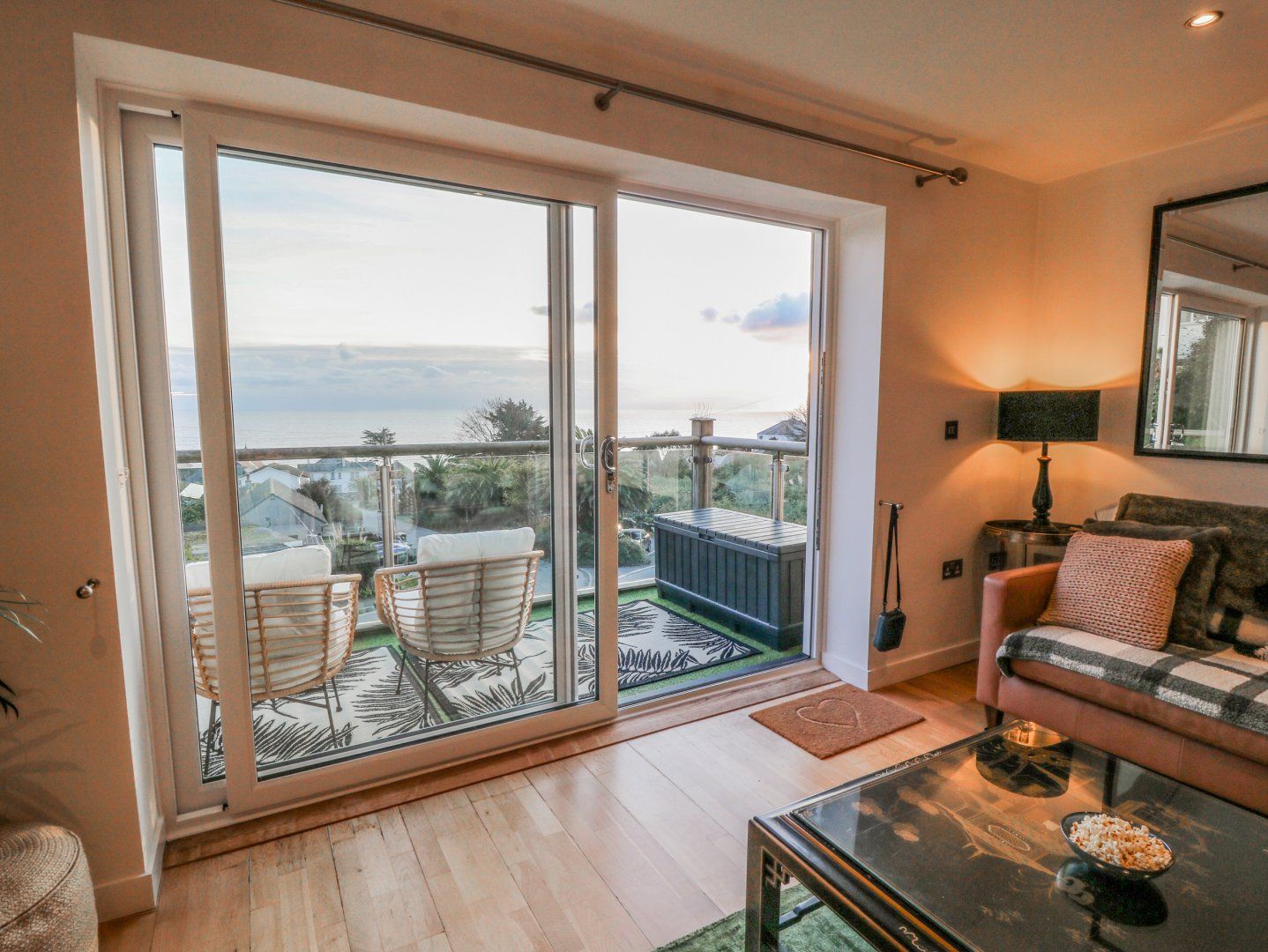 Amenities Ground-source heat pump, underfloor heating. Electric oven, ceramic hob, microwave, fridge/freezer, washing machine, and dishwasher, washer/dryer and Nescafe Dolce Gusto Coffee Machine. Smart TV with Sky, WiFi and games. Fuel and power inc. in rent. Bed linen and towels inc. in rent. Travel cot and highchair available. Private allocated parking for one car. Additional may be found in the nearby car park, though fees may apply in high season. Private balcony with furniture. One well-behaved pet welcome. Sorry, no smoking. Shop and pub 0.1 mile, beach 0.3 miles. Note: There are steps up from the car park. Note: Check-in from 5pm and check-out by 11am