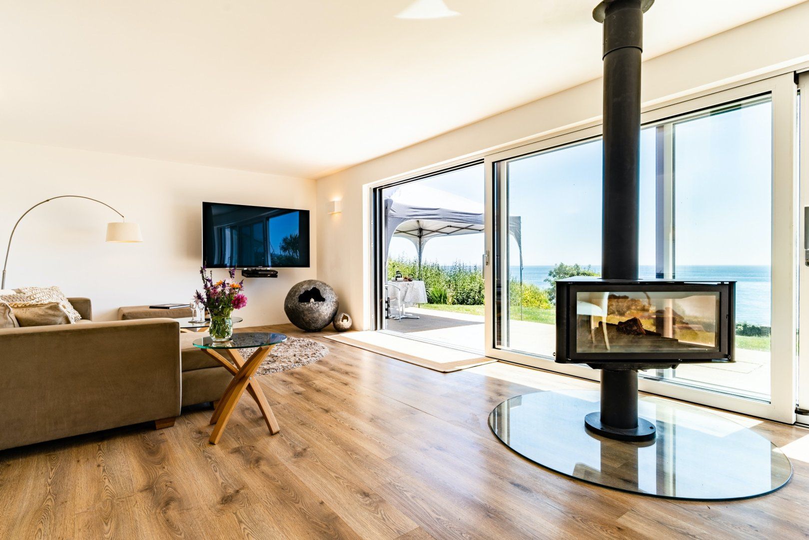 You’ll get inspired to create delicious meals in the modern, well-stocked kitchen, featuring all the necessary gadgets to make rustling up a family supper a work of moments. You can savour your meals at the dining table inside or gather for an alfresco feast outside, where the lush garden, comfy seating and those stunning ocean views await.
