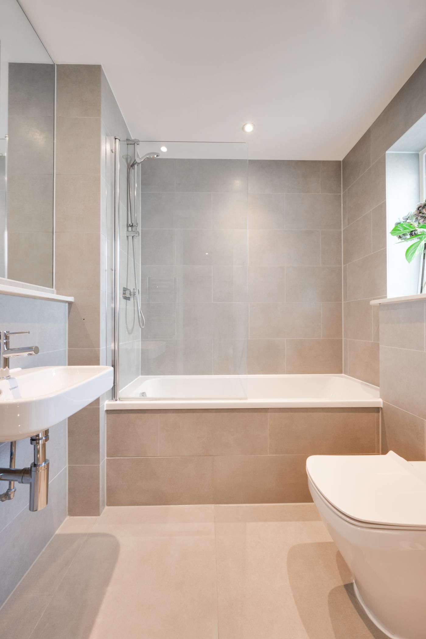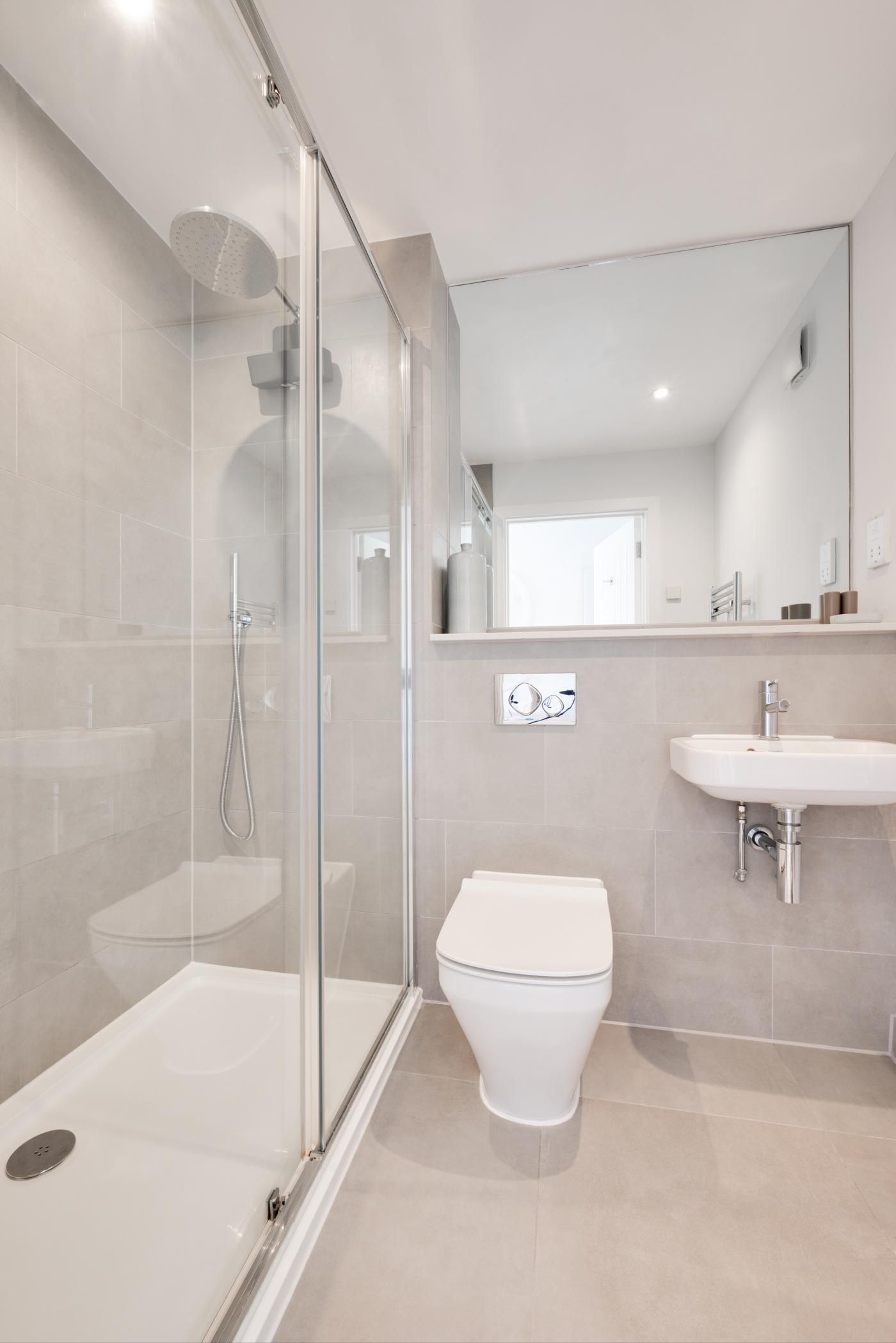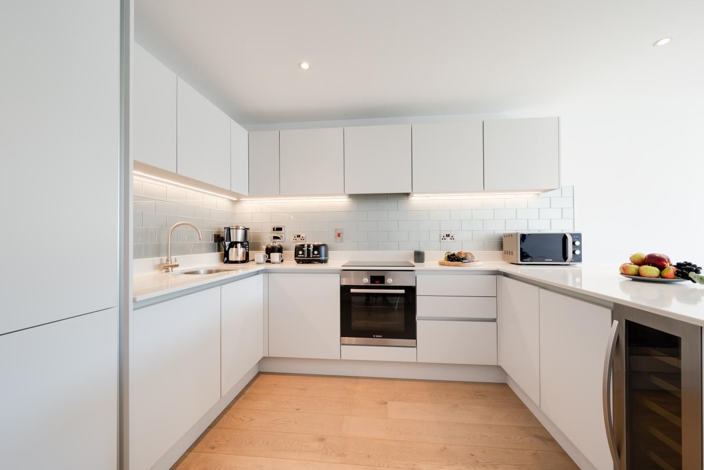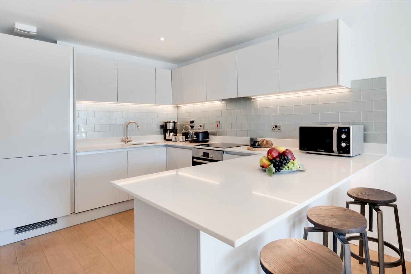 The main social space in the apartment is the open-plan living room/kitchen/diner, decorated all in white with quirky features to soften the space.