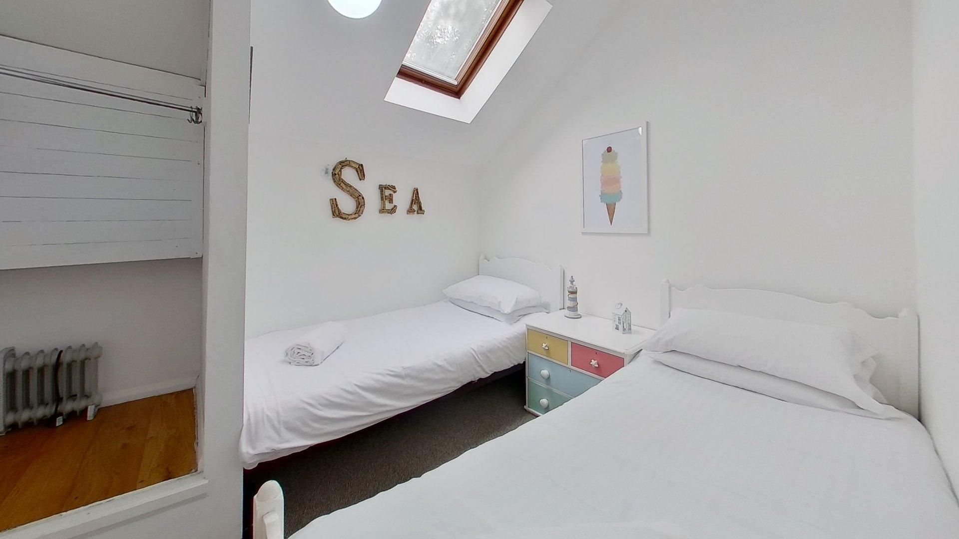 Bedroom Two: There are two single beds, chest of drawers and hanging space.