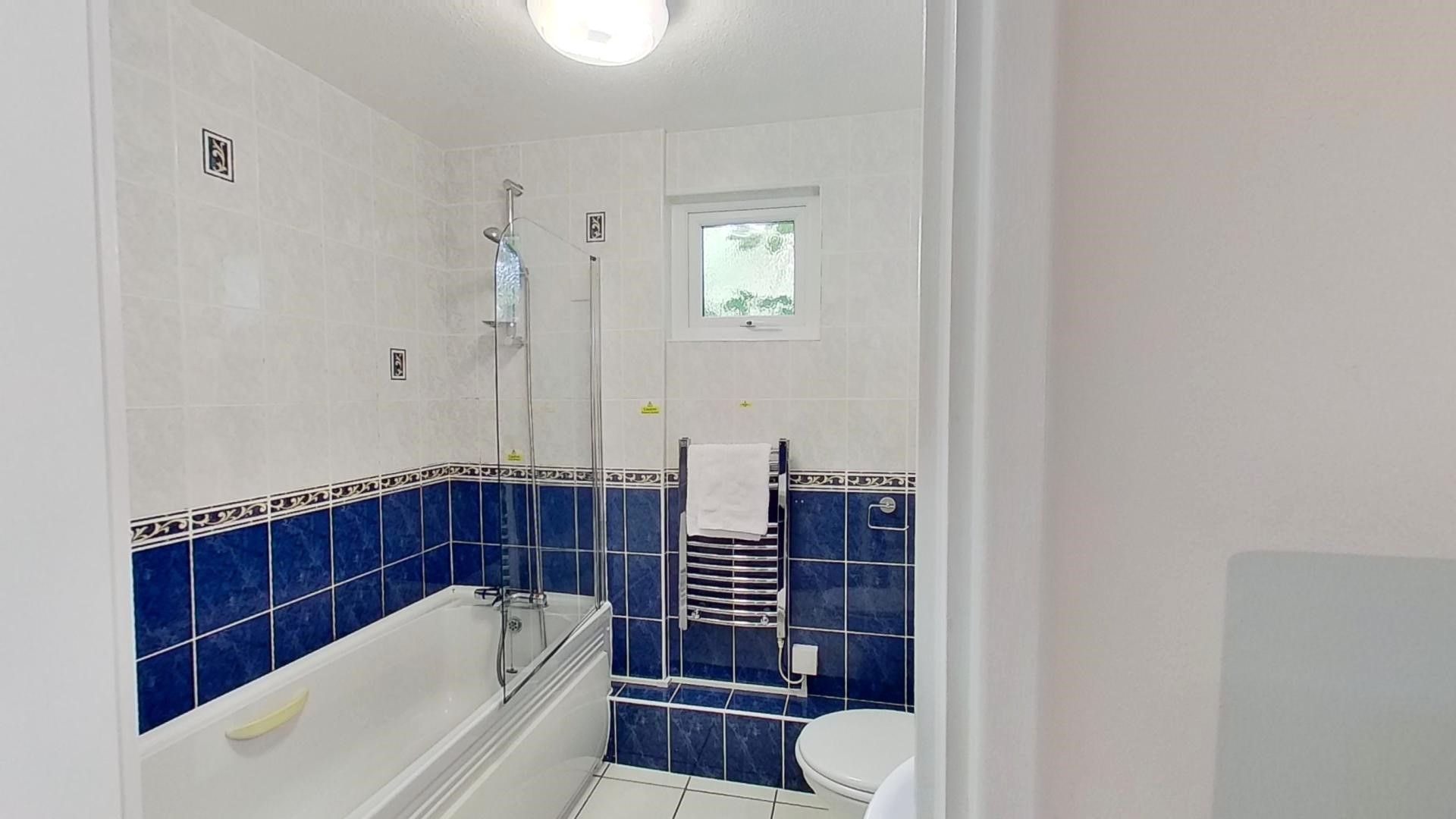Bathroom: With a bath and shower over, basin, vanity unit, shaver point, heated towel rail and WC.