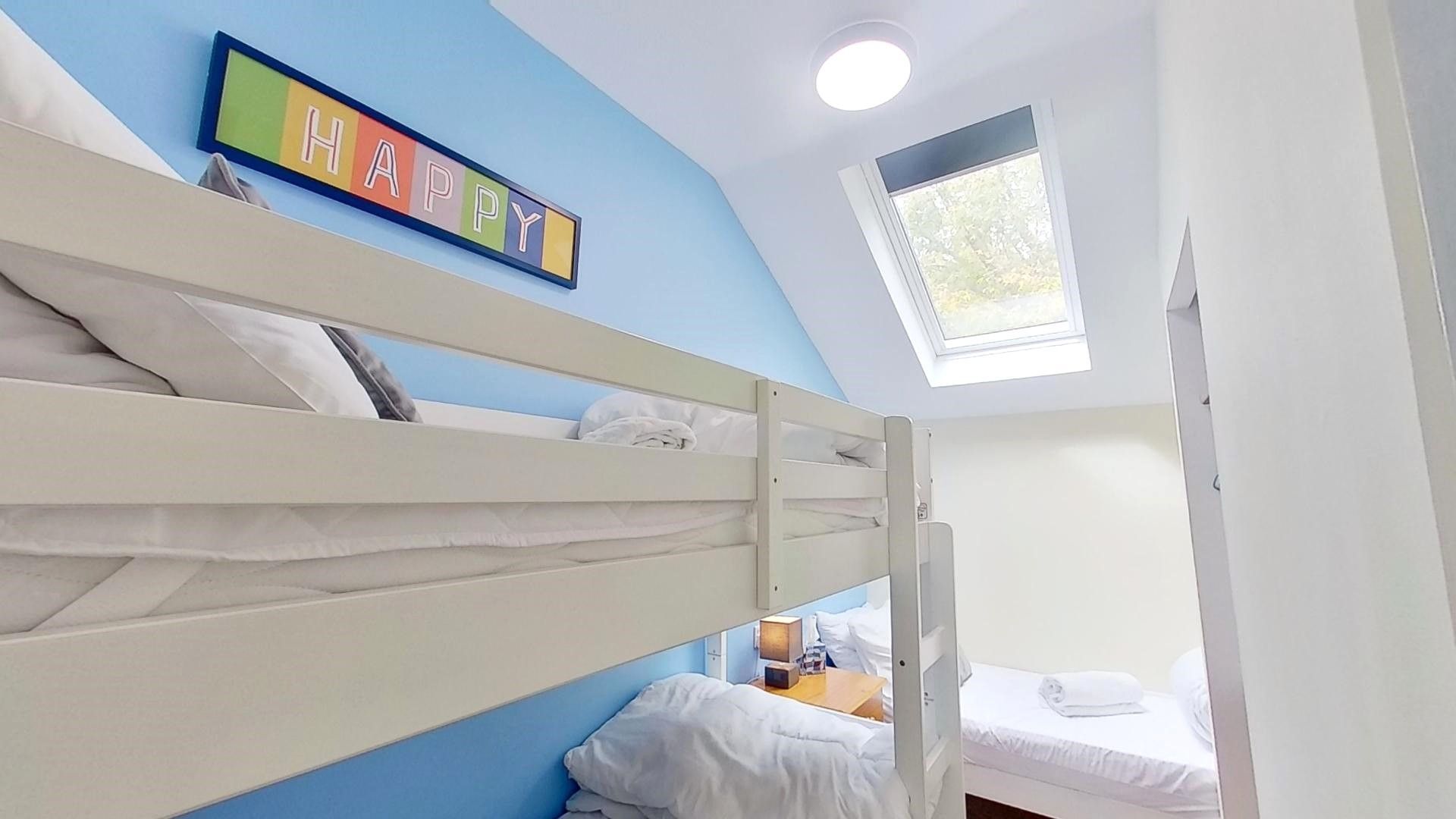 Bedroom Two: - This bedroom has bunk beds, a single bed, bedside units, lamp, a chest of drawers and hanging rail.