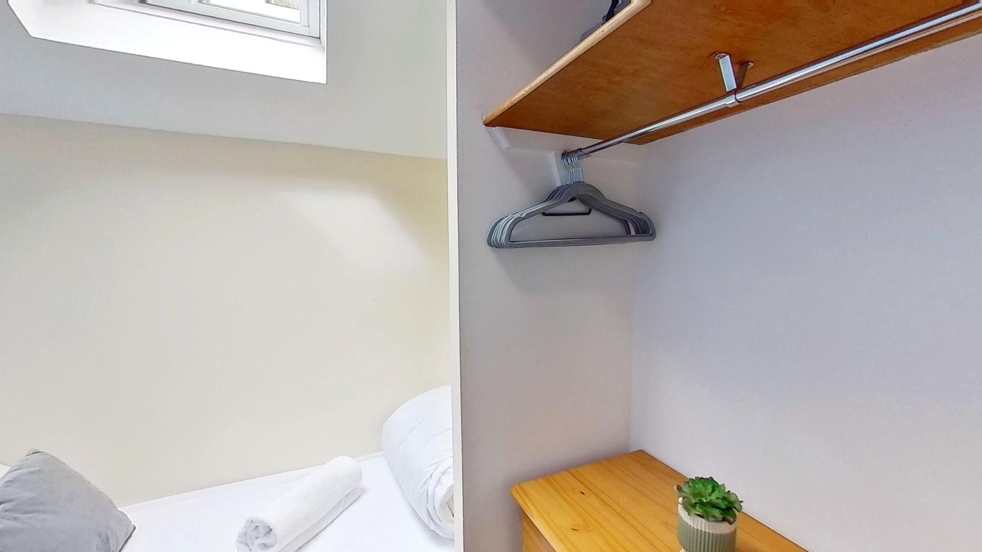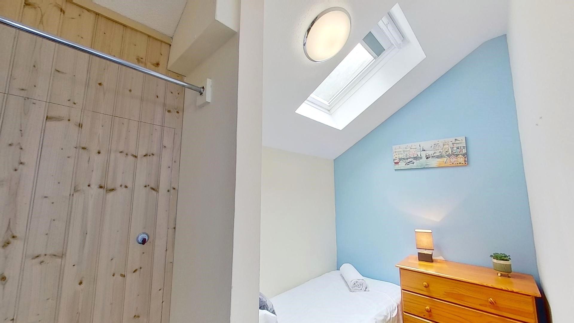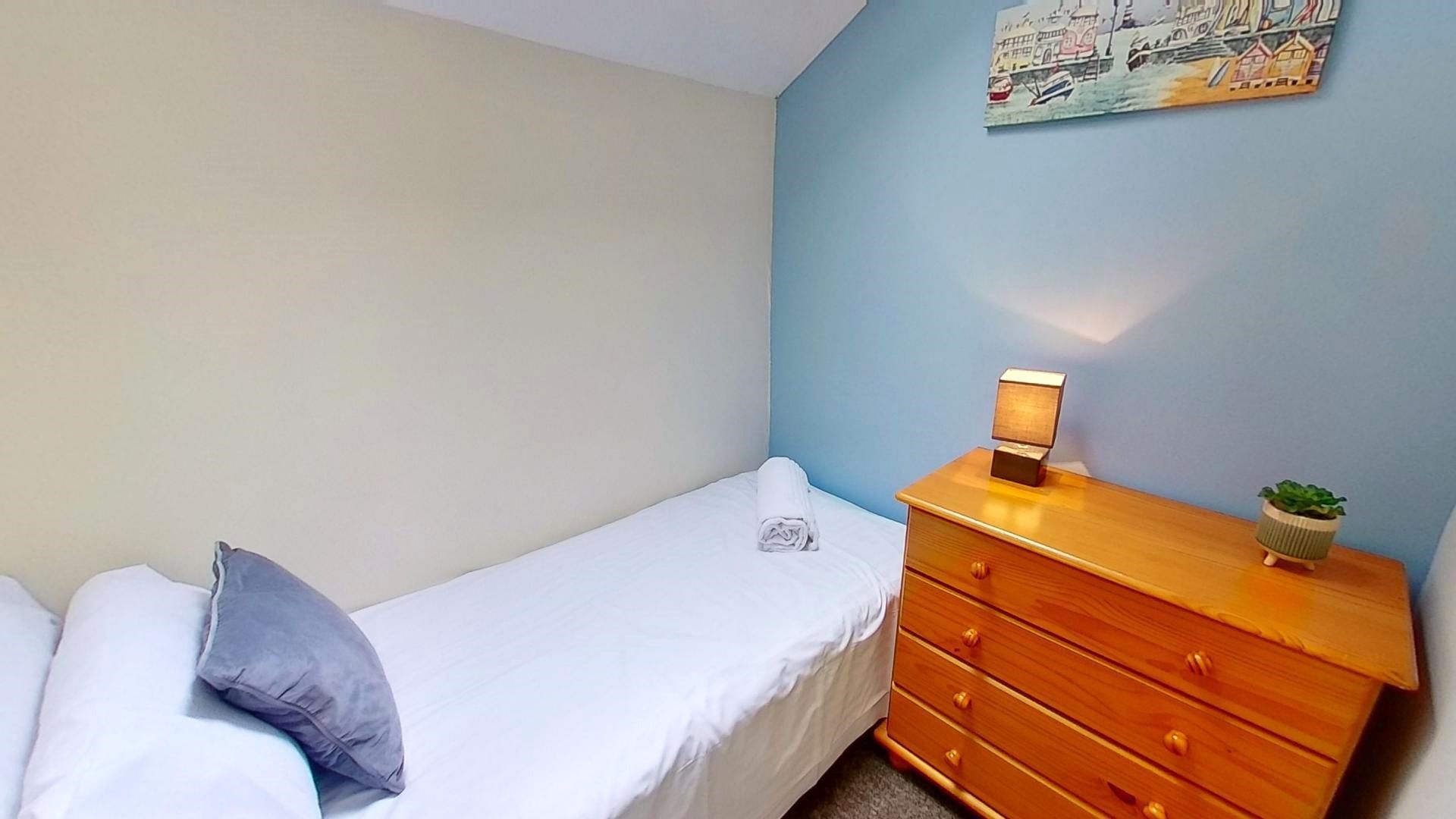 Bedroom Three: - With a single bed, chest of drawers, lamp and hanging rail.