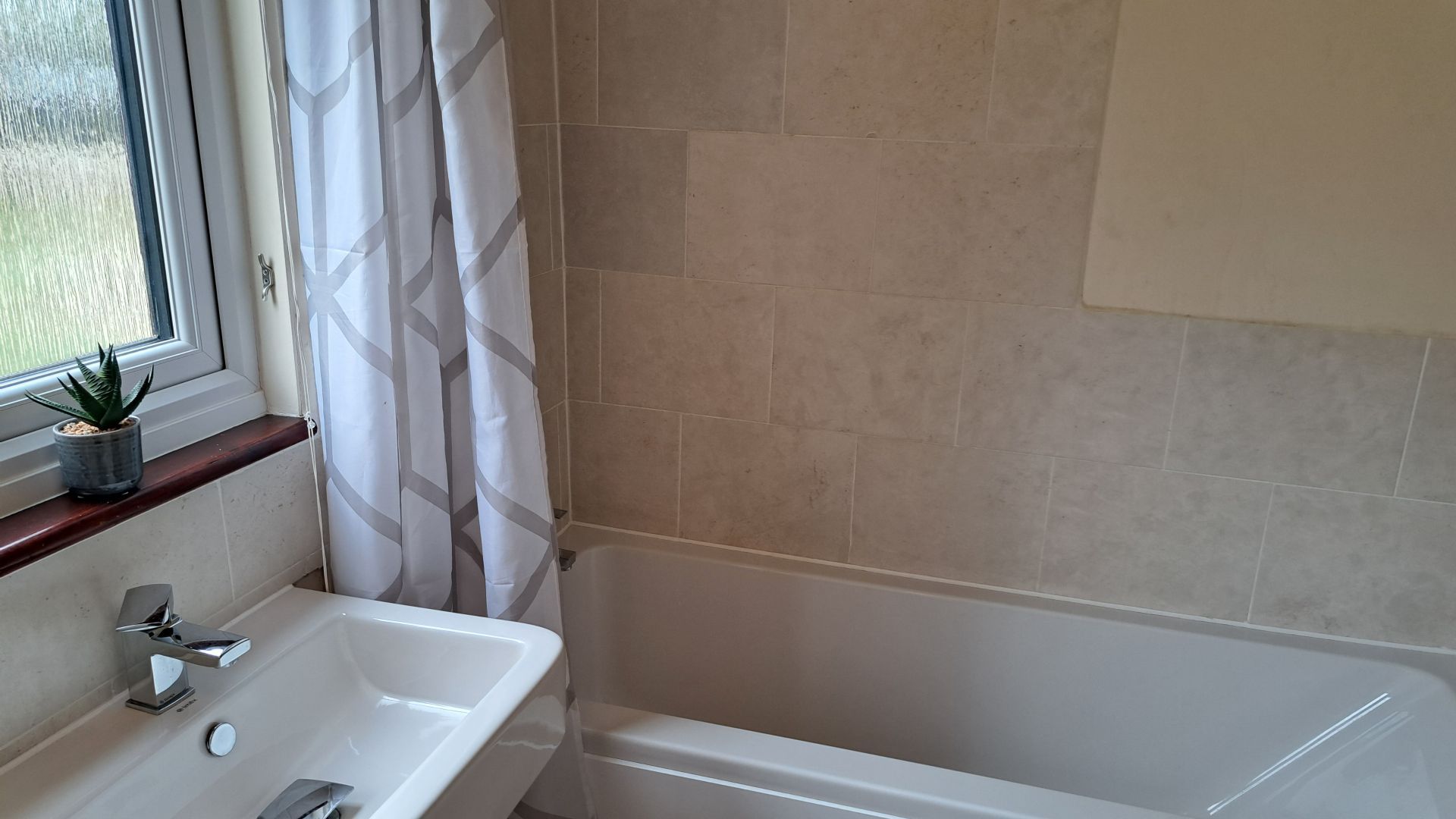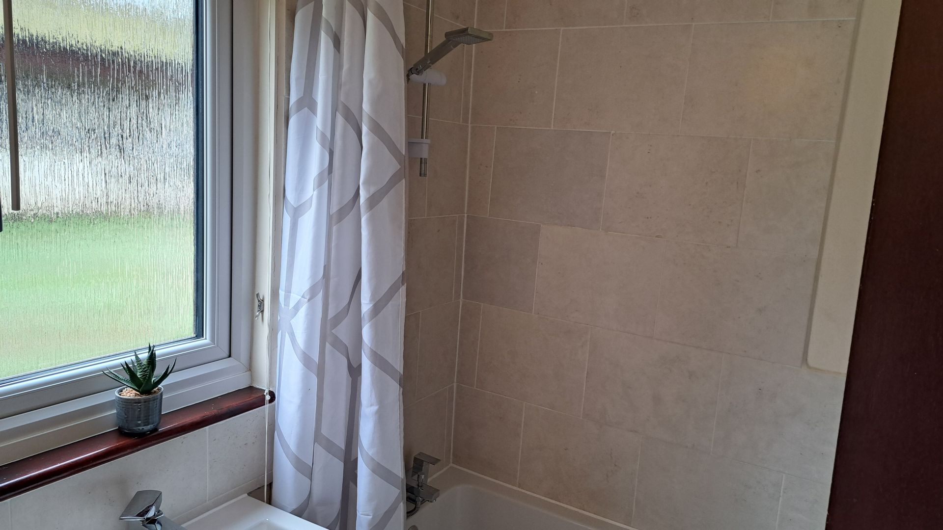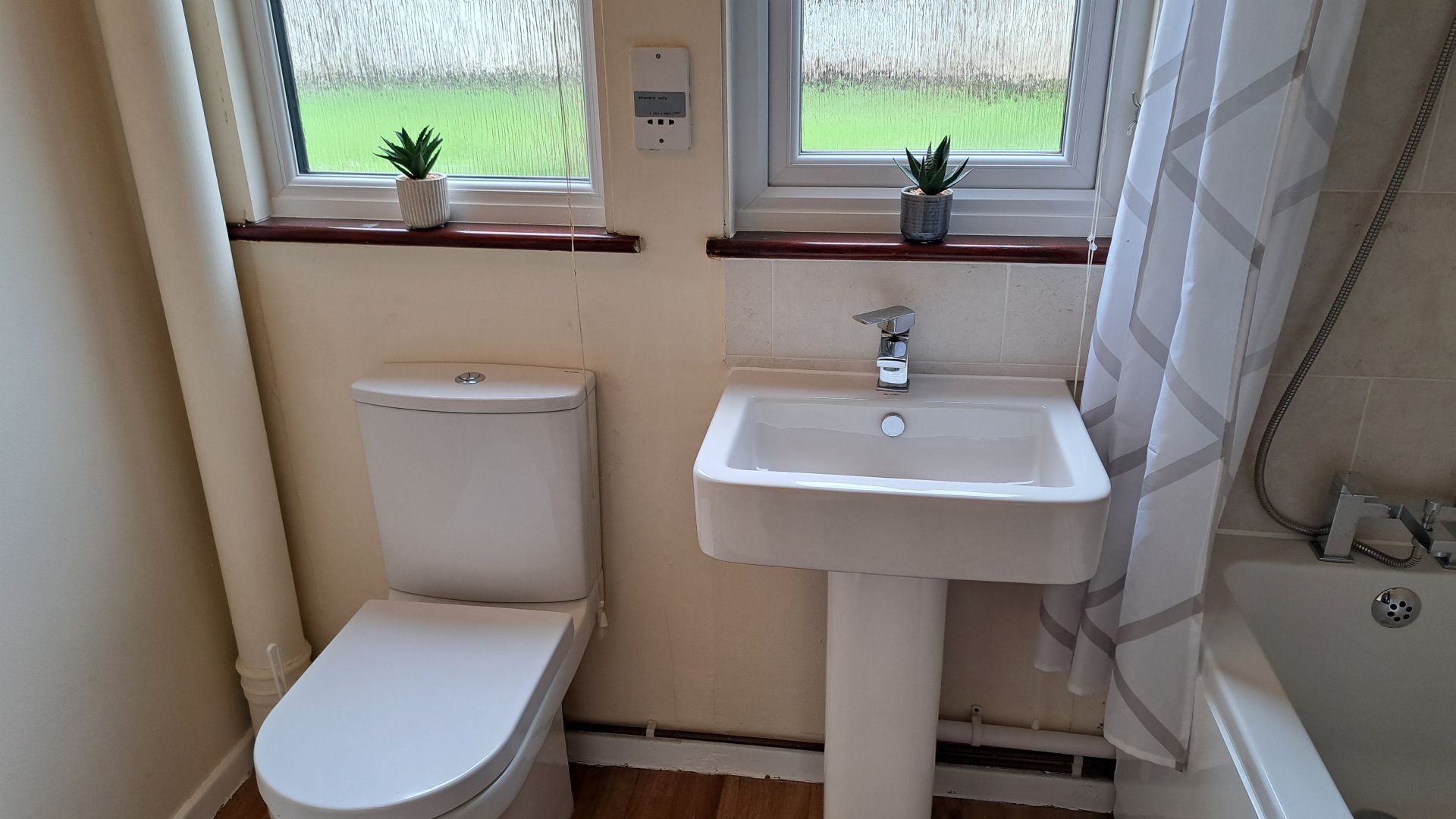 Downstairs bathroom - The downstairs bathroom features a full-size bath, with an over bath electric power shower, wash hand basin, mirror and WC. The bathroom is furnished with a wall-mounted electric fan heater and wood effect lino flooring. Privacy is protected by obscured windows and blinds.