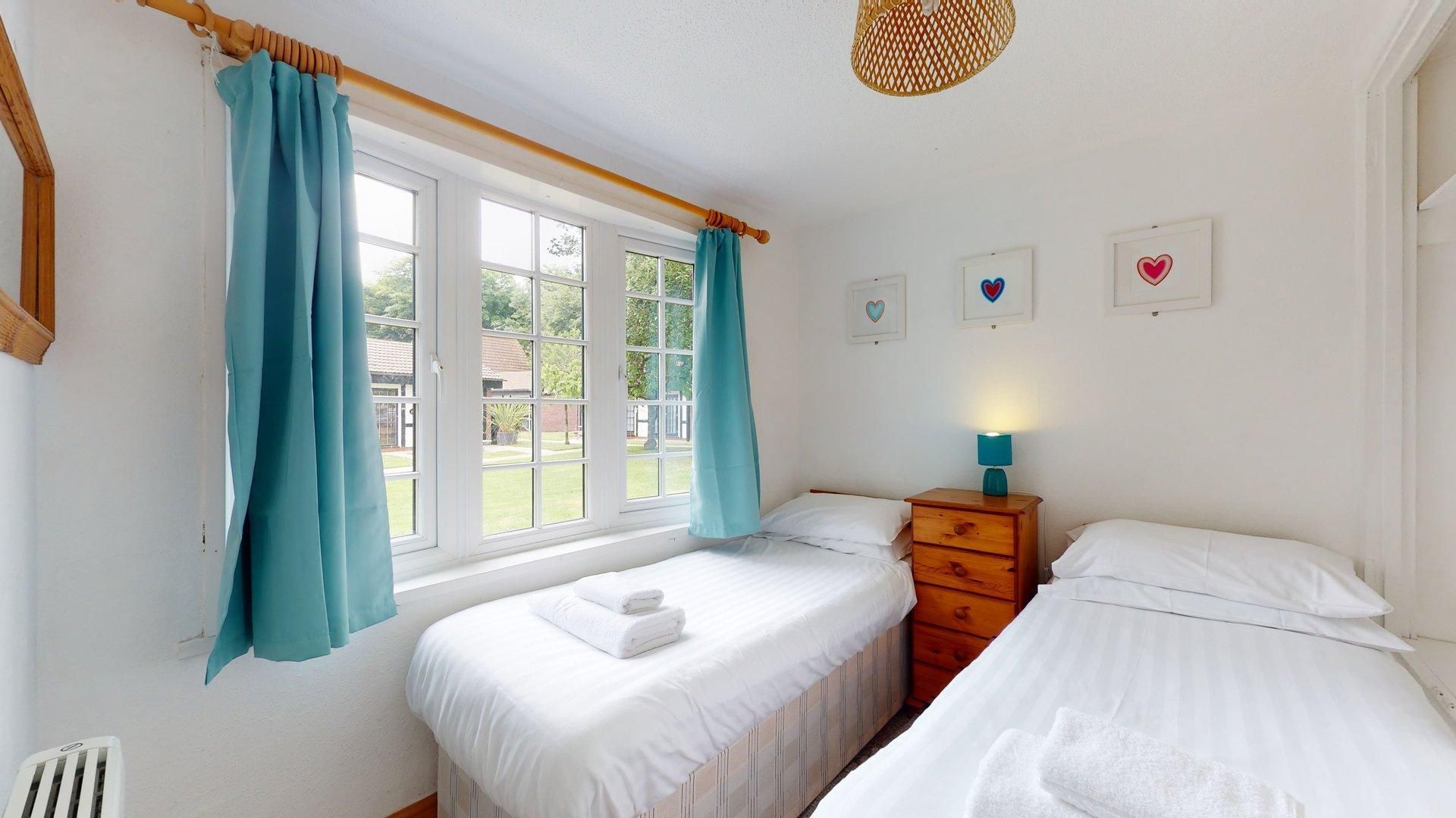 Bedroom 2 - Two single beds, hanging space, chest of drawers & bedside lamp.