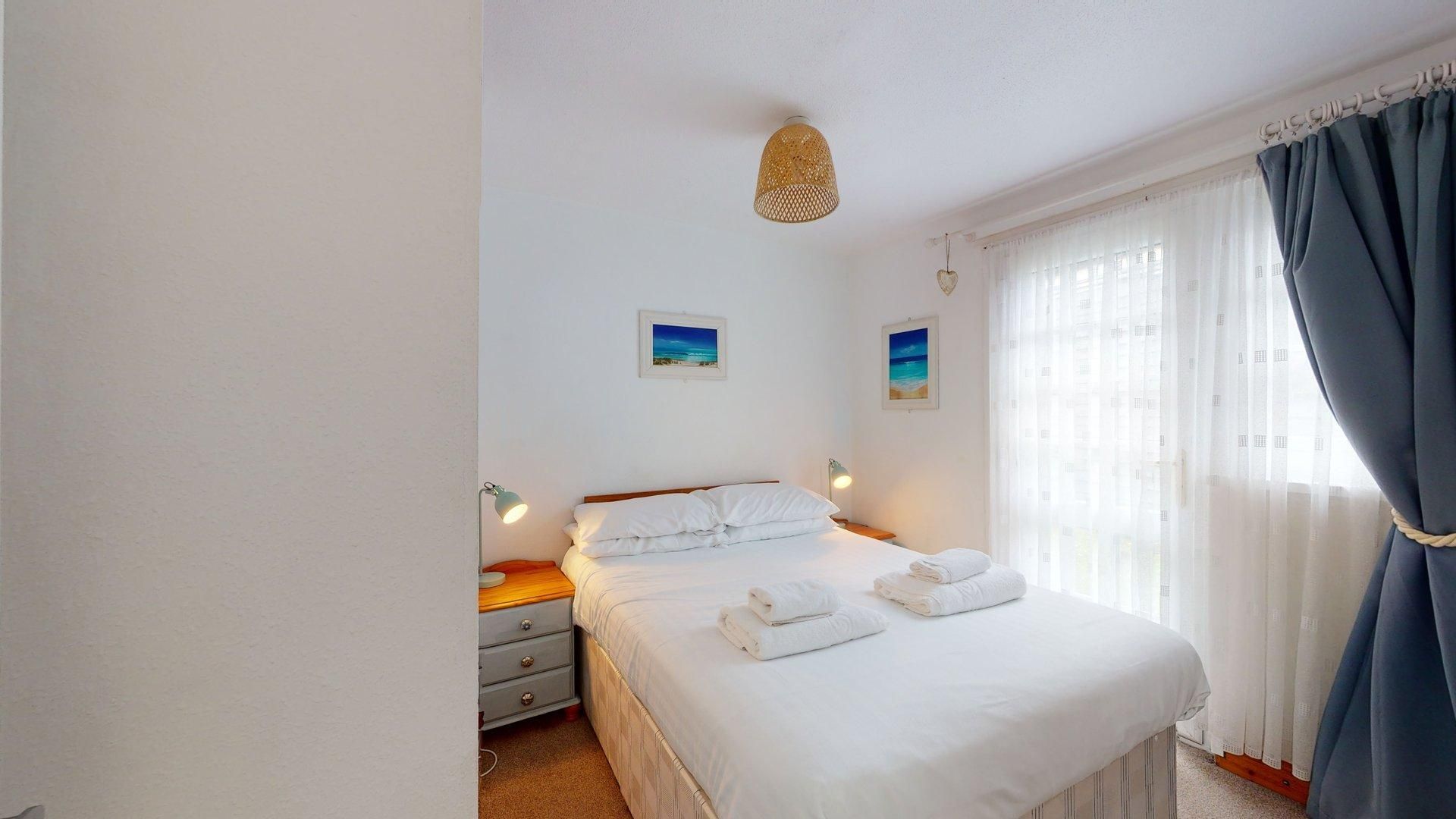 Bedroom 1 - A double bed, hanging space, bedside tables with drawers and lamps. Door to outside space behind the property.