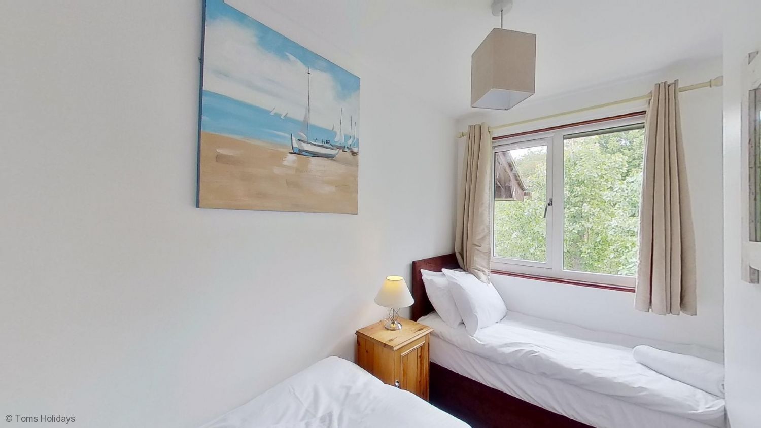 Twin Bedroom - Two single beds, bedside table with lamp, chest of drawers and hanging space.