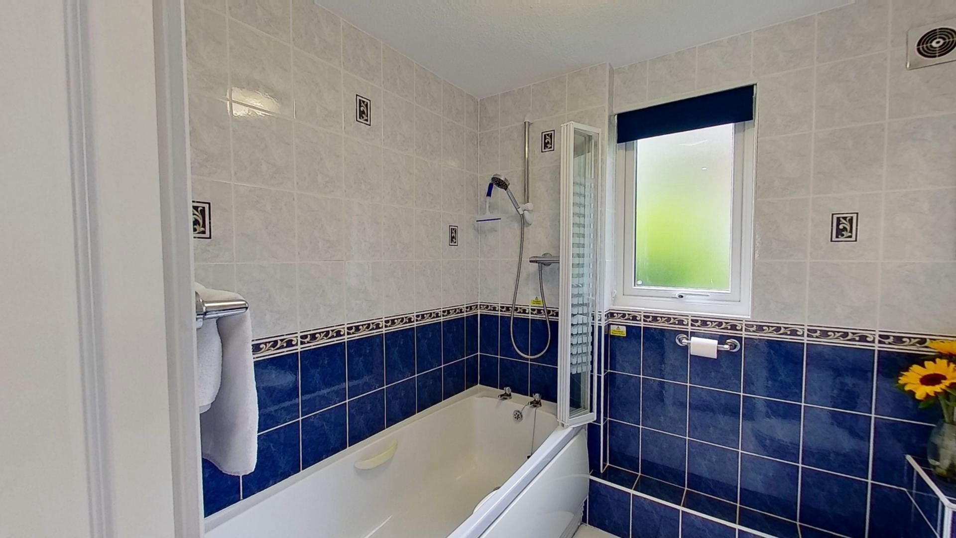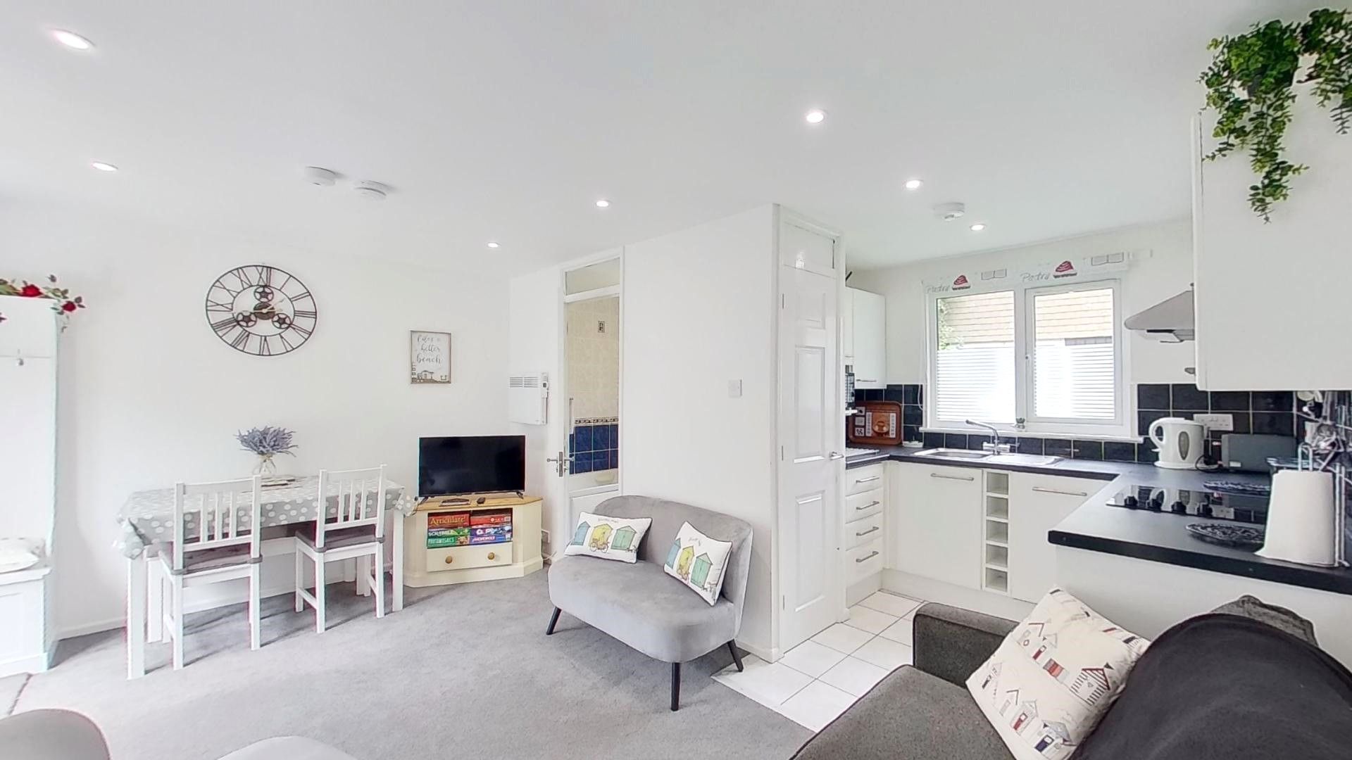 Ground Floor: Living/Dining Area: With a comfy sofa and easy chairs, TV and dining table with seating for up to five guests. Kitchen: Open plan and well-equipped with electric hob and oven, dishwasher, fridge with freezer compartment and microwave. Bathroom: With a bath which has a shower over, wash basin, heated towel rail and WC.