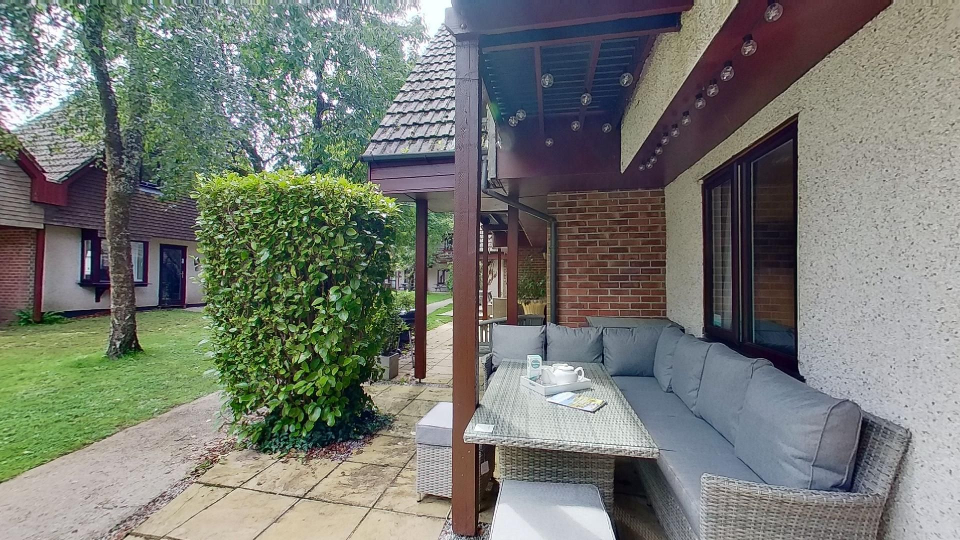 Outside - A lovely patio with large corner sofa, stools and dining table. Nearby is off road parking in the resort car park.