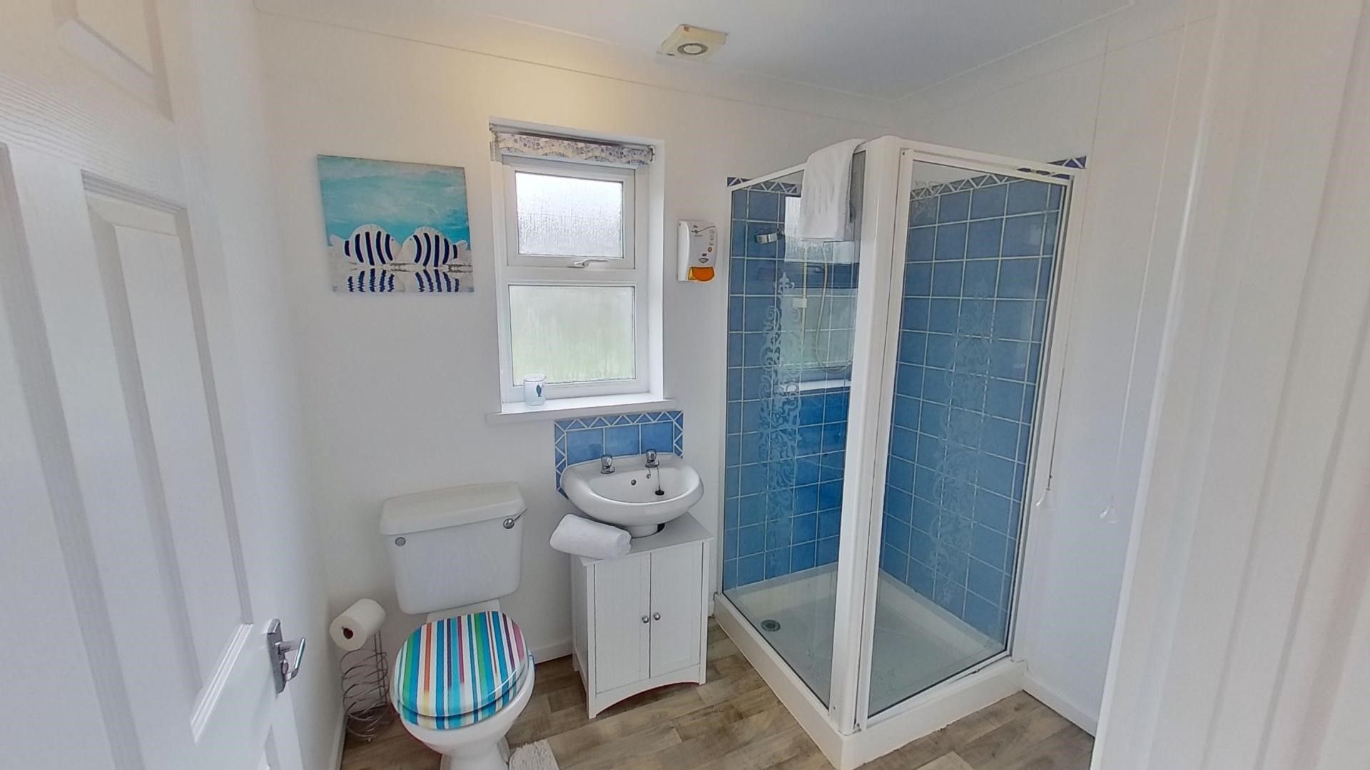 Open Plan Living/Kitchen/Dining – Bright, spacious room with TV, large comfy sofa and easy chairs, front aspect views; fitted kitchen with cupboards, electric cooker, under-counter fridge and freezer, microwave and washing machine; dining area with table and chairs. Bedroom 1 – Double bed, built-in wardrobe with shelving, window to the side. Bedroom 2 – Double bed, built-in wardrobe with shelving, window to the rear. Bedroom 3 – Bunk room with full-size bunks; window to the rear. Shower Room – Very spacious; shower cubicle, wash basin, shaver point and WC. Access – Level access to the rear door. Parking – On-site parking for two or more cars right next to the chalet.