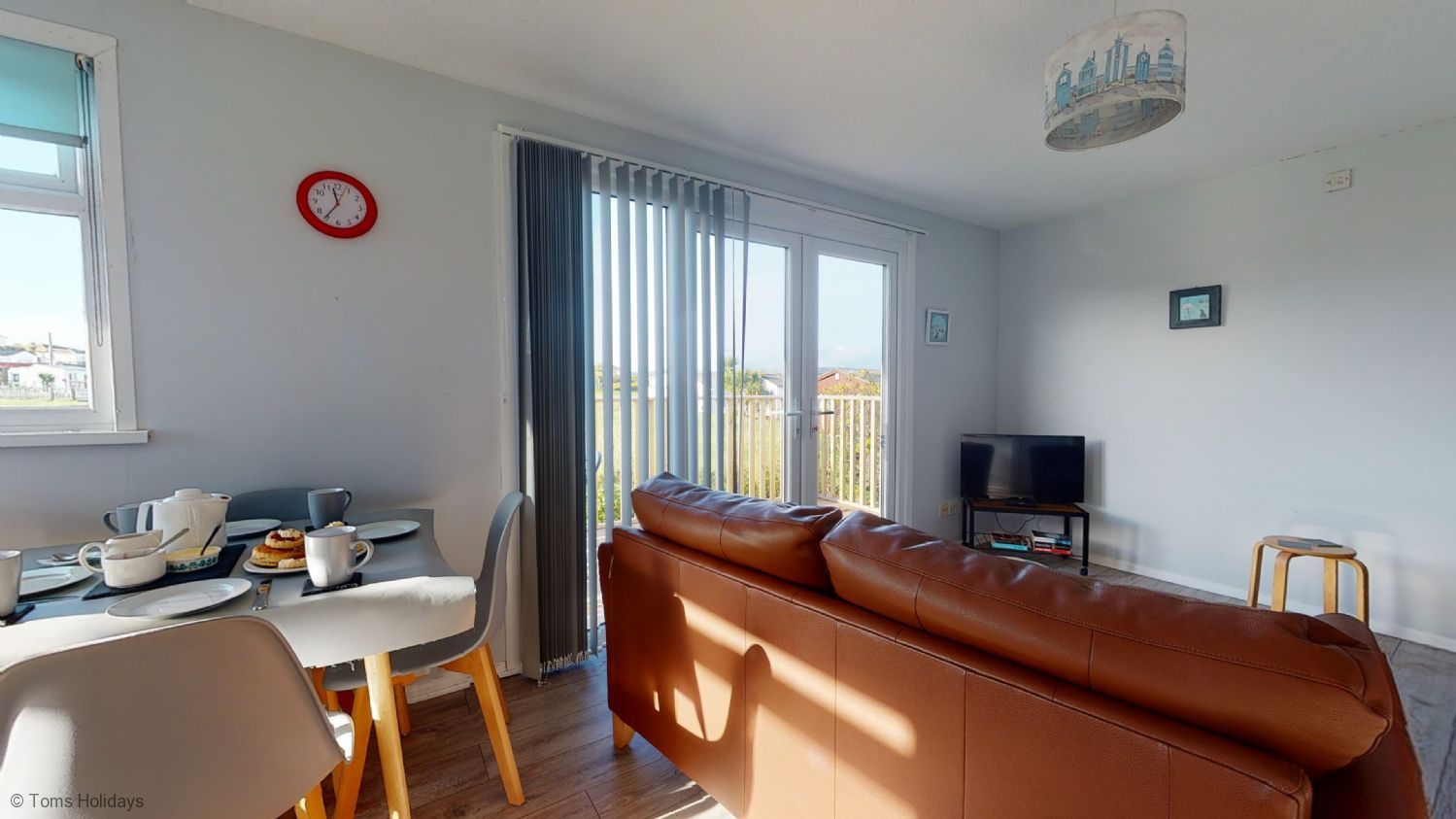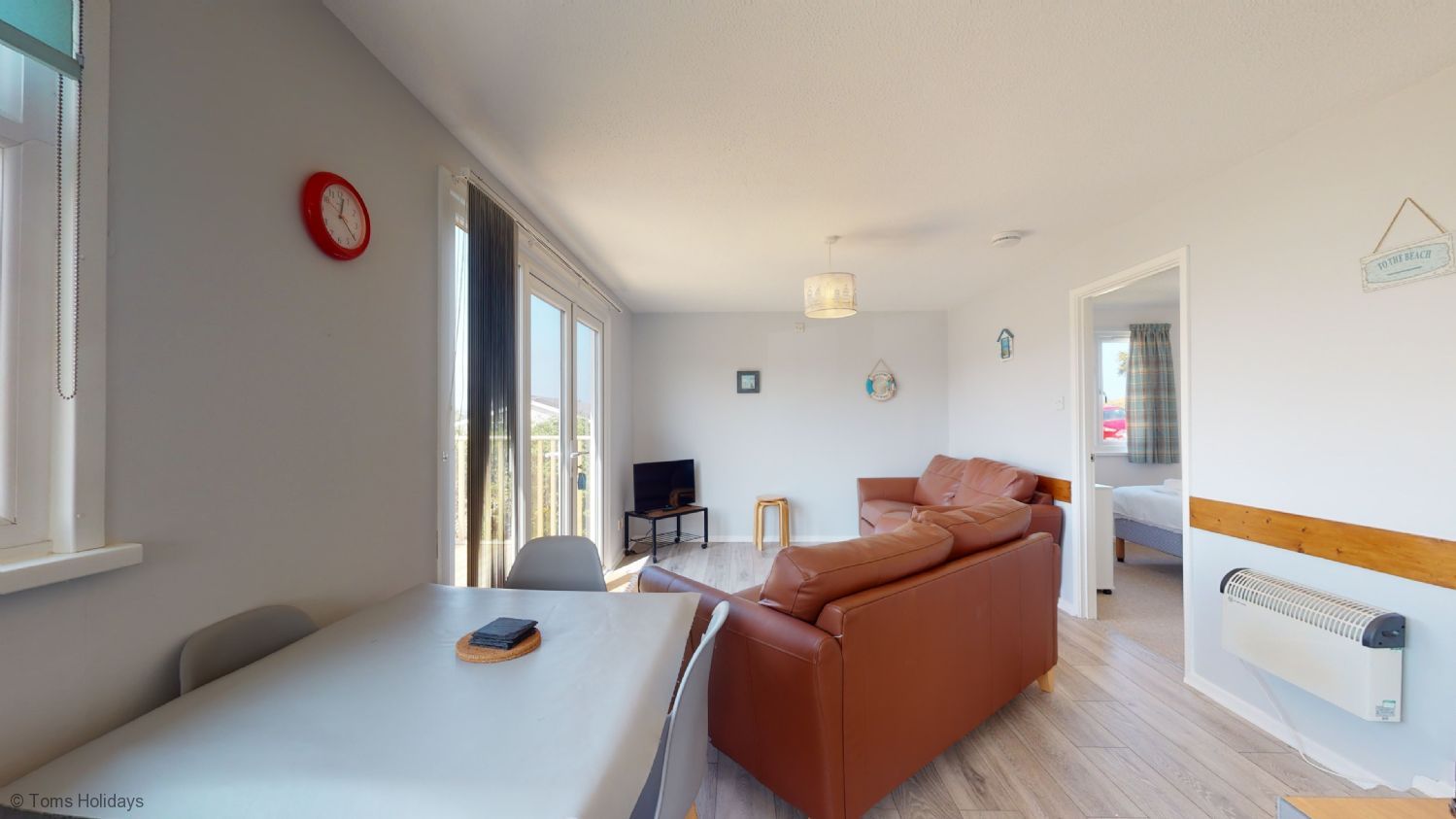 Comfortable and deceptively spacious. With a delightful fresh feel and glimpses of the sea and the far hills from the sunny balcony. In an open area overlooking the Park with easy access to the beach, bus stop and a shop.