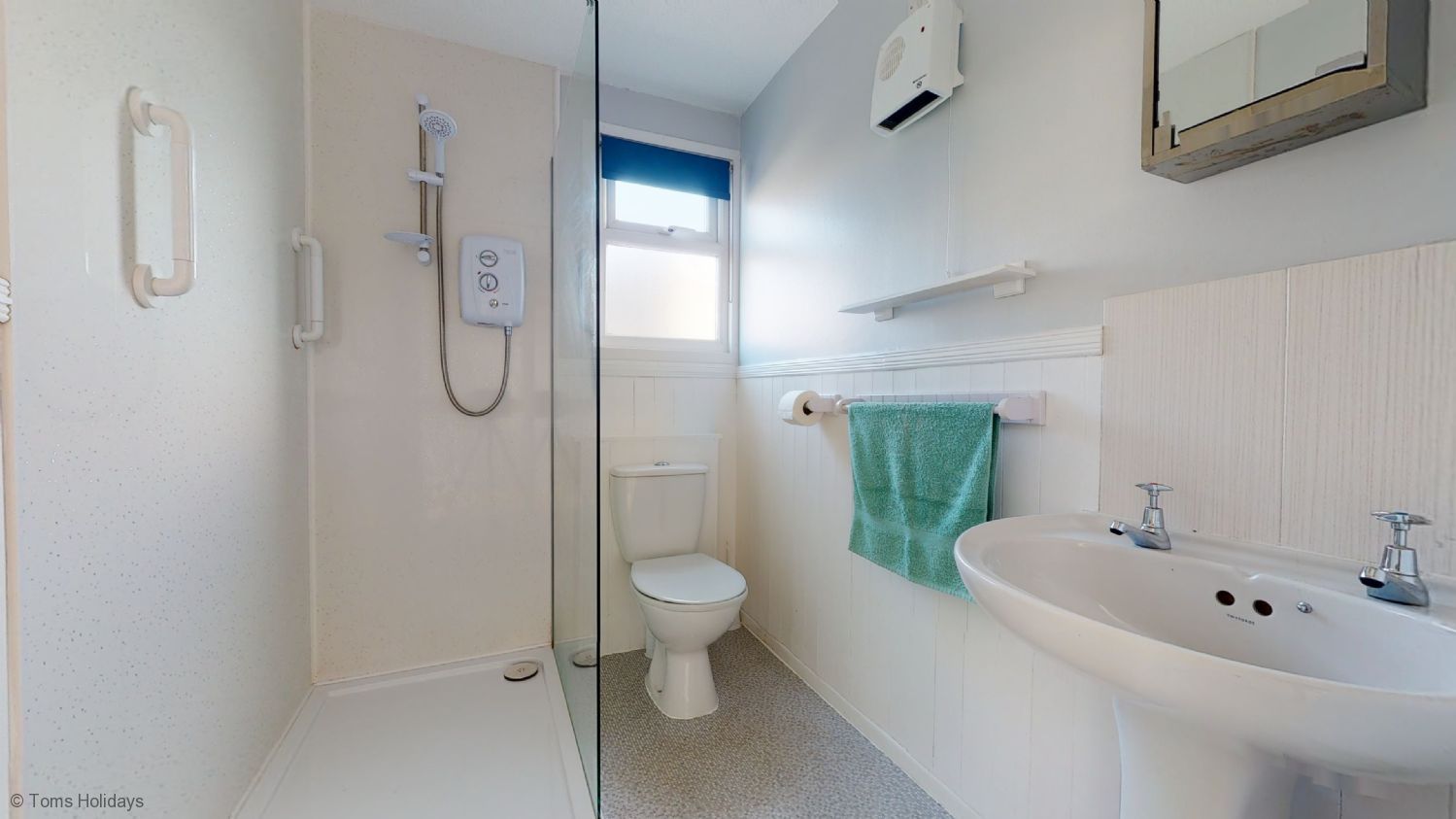 Bathroom - Large walk-in shower, WC and pedestal WHB. Cupboard housing vacuum cleaner.