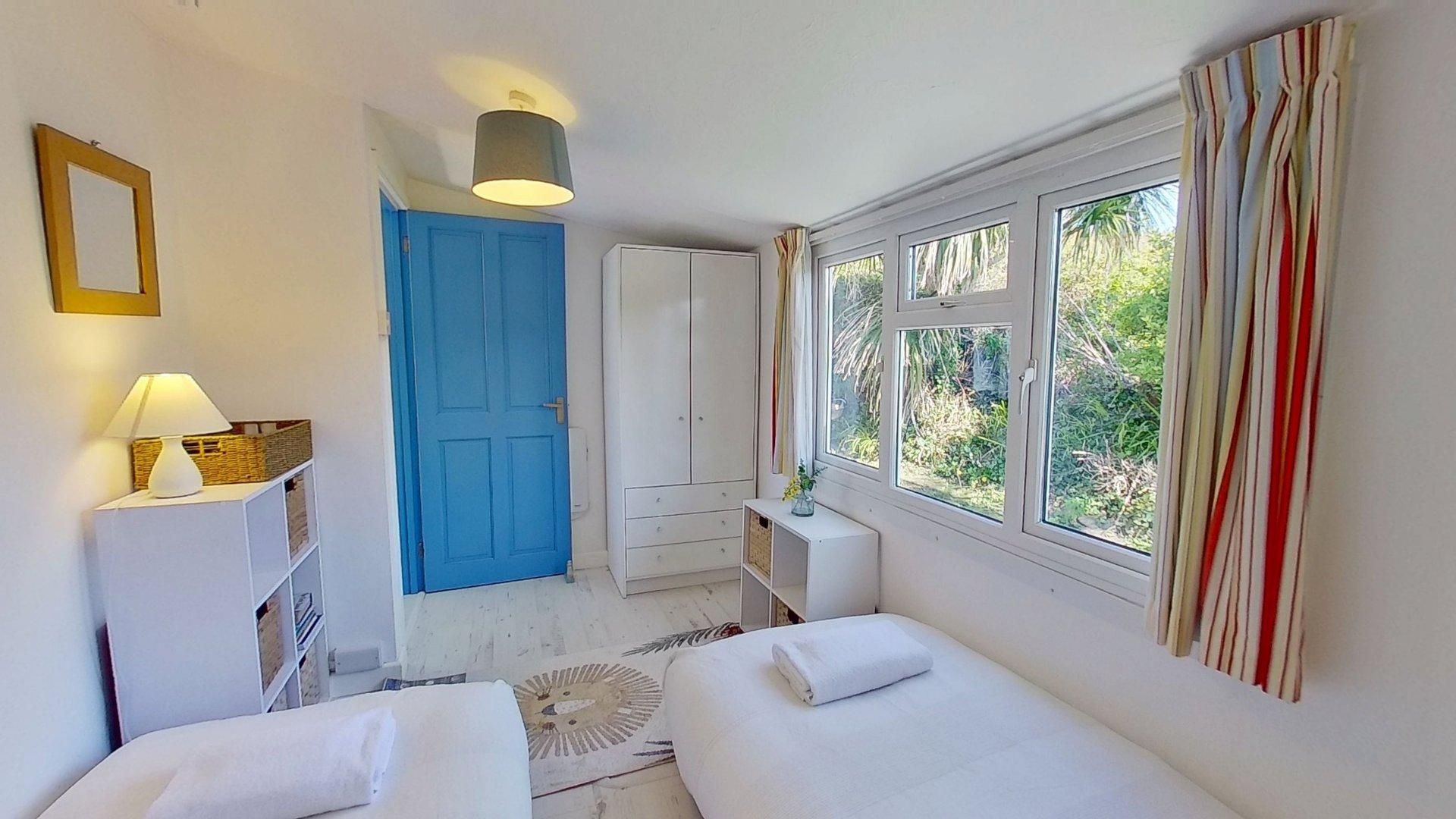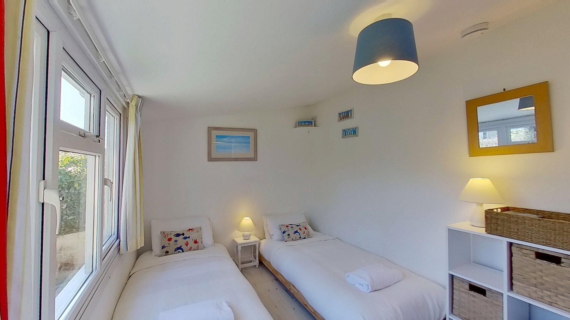 Bedroom 2 - Twin, low rise single beds, wardrobe, bedside unit and room for a cot. Please note the beds are full size and low to the floor.