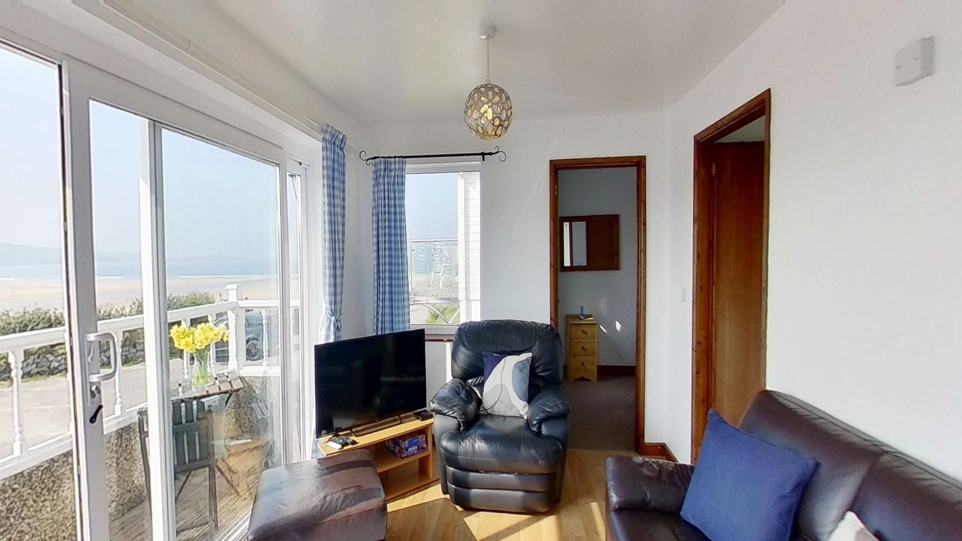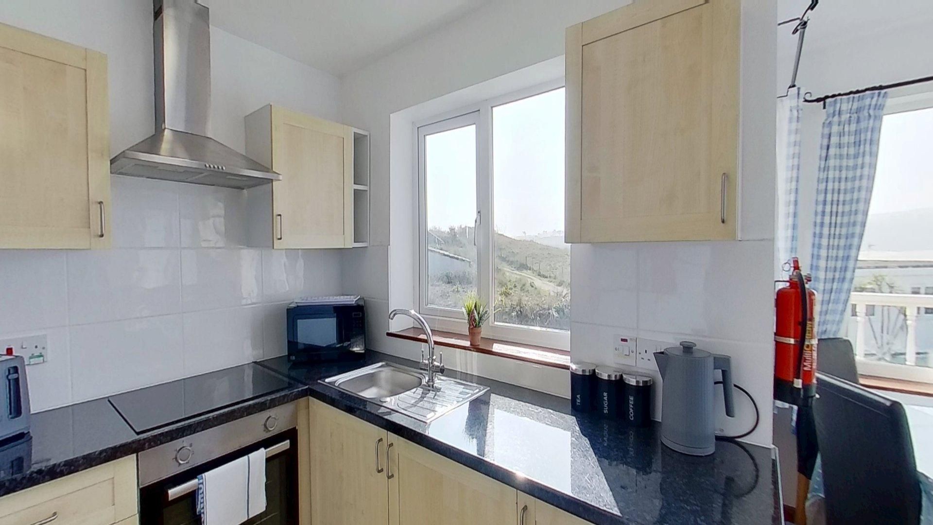 Living Room - Furnished with a sofa and chairs, plus dining table and chairs and TV. Patio doors open on to the balcony, with views across the bay. Kitchen - Adjoining the living area, with fitted units, electric cooker, microwave and fridge.