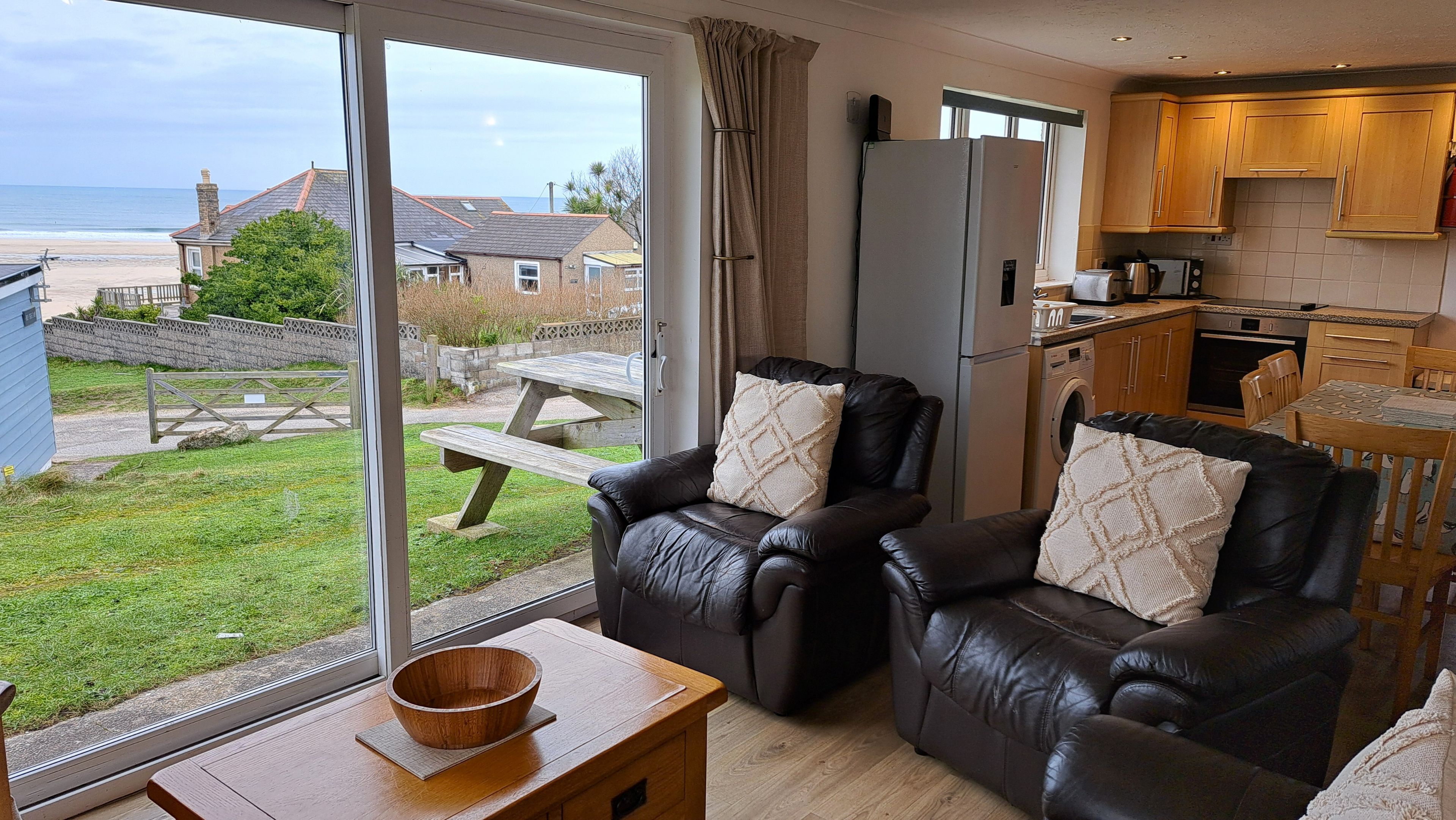 Living Room - Comfy sofa and easy chairs, TV and DVD player, fabulous beach and sea views through patio doors and kitchen windows. Just a short stroll to the golden, sandy beach.