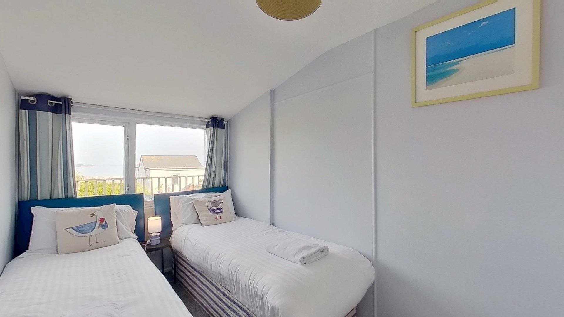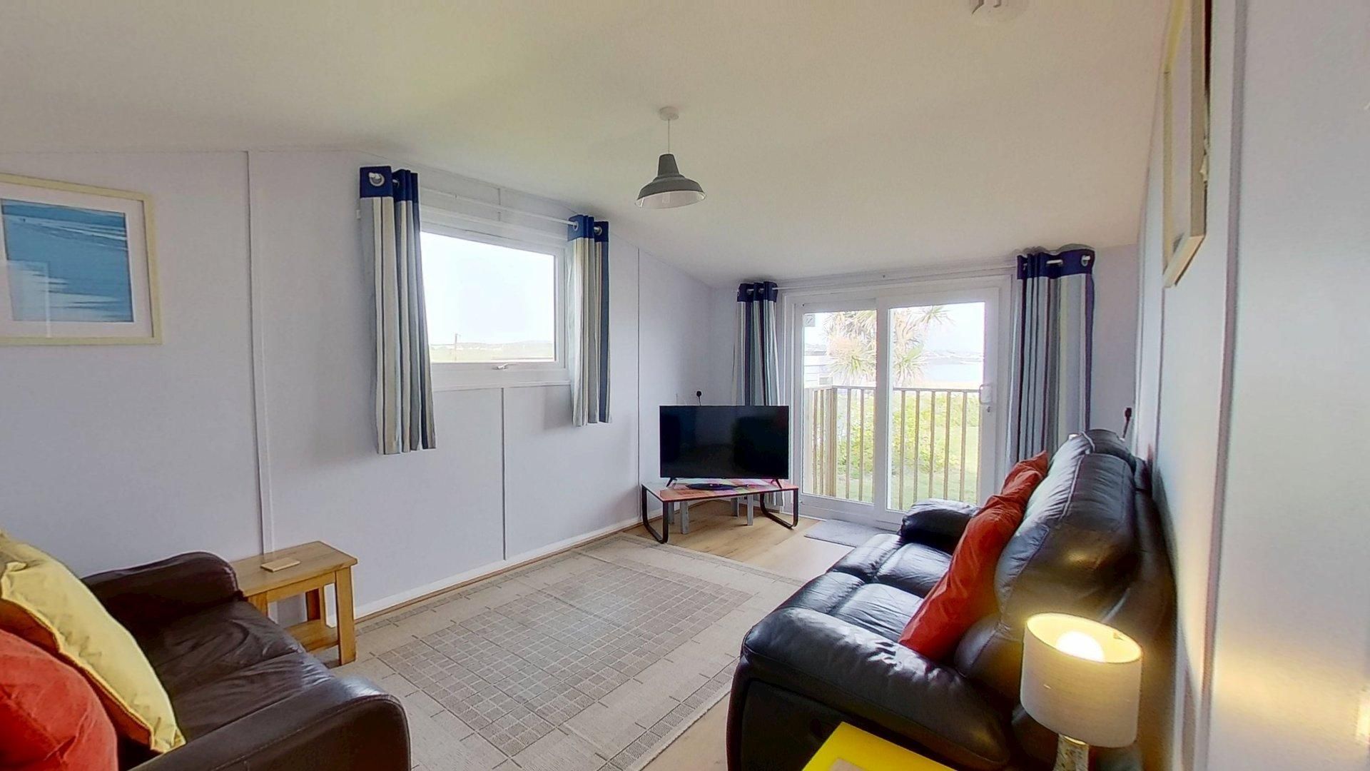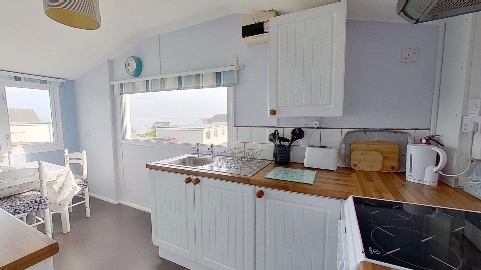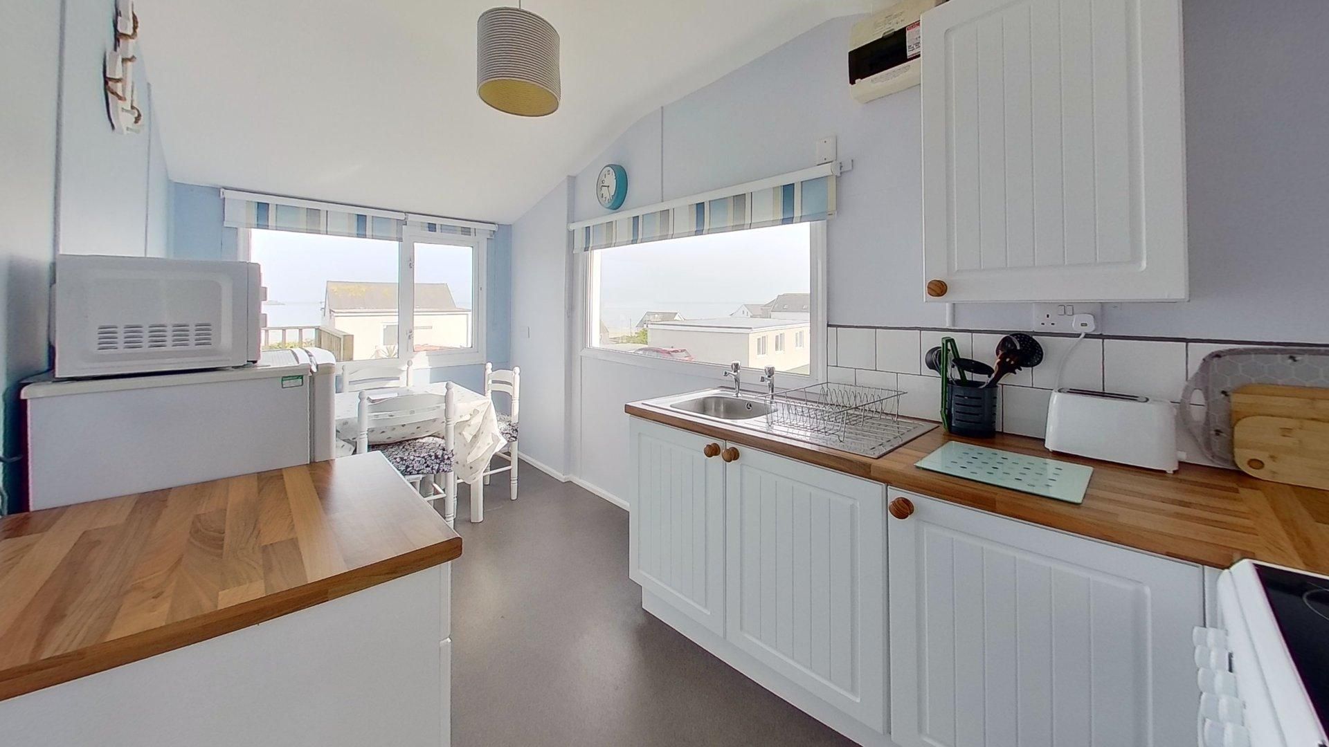 Living Room - Sea views from the living room with twin sofas,TV and patio doors leading to a private and secure decked area with table and chairs. Kitchen/Diner - With an electric oven and hob, fridge/freezer, kettle, toaster, microwave, extractor fan with a dining table overlooking St Ives Bay. Bedroom 1 - King Size bed with a wardrobe, chest of drawers and bedside lighting. Bedroom 2 - Two single beds, a built in a wardrobe at the front of the property overlooking St Ives Bay. Shower room - Shower, hand basin and heated towel rail. Separate WC - Separate WC. Outside and Parking - There is a enclosed deck area with sea views. Ample parking at the side and rear for numerous cars close to the door to the property on a level area.
