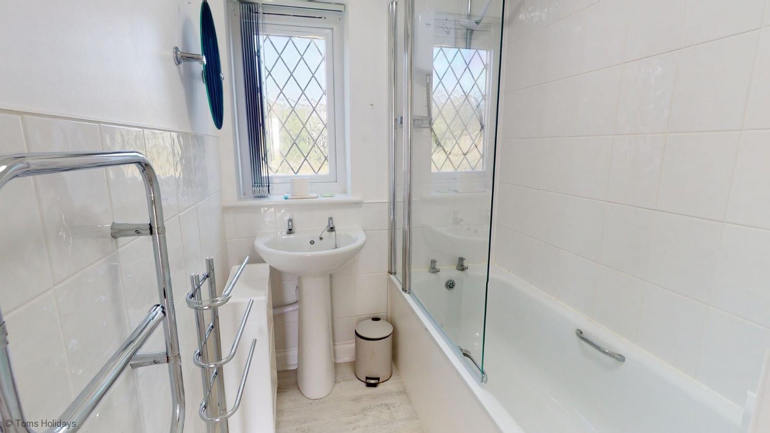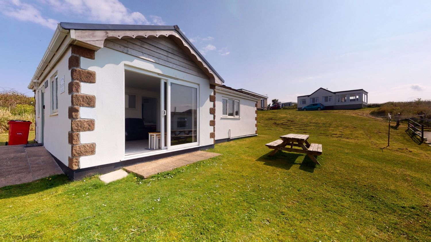 Bedroom 1 - One double bed, single wardrobe, electric heater. Bedroom 2 - Two single beds, single wardrobe, electric heater. Bedroom 3 - One set of full size bunk beds, electric heater. Please note, while full size, the bunk room is more suited to children. Lounge/Diner/Kitchen - Modern fully fitted kitchen comprising breakfast bar & stools, built-in hob and oven, microwave, integrated appliances - washing machine, fridge and dishwasher. Dining table & chairs, electric heater, leather 3 piece suite, flatscreen TV, DVD player, electric stove fire, large sliding patio doors onto grass area offering excellent sea views. Bathroom - Bath with overhead shower, W.H.B., shaver point, heated towel rail, electric heater. Separate Toilet - With W.H.B.