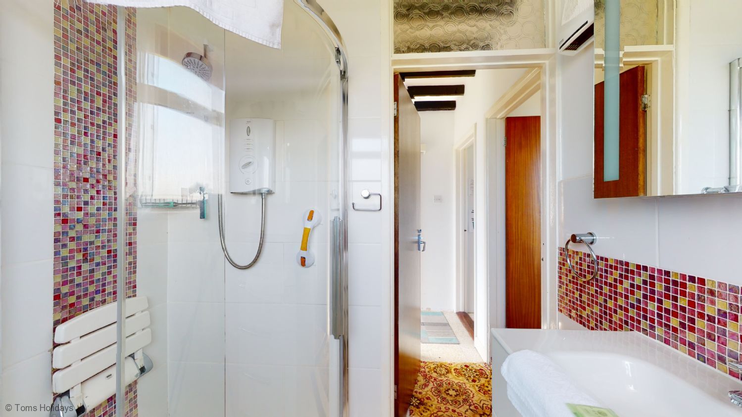 With two bedrooms (one double and one bunk room), a well equipped, modern kitchen and dining space for four, shower room and characterful living space with a mixture of retro furniture, framed by floor to ceiling glass doors looking towards the ocean.