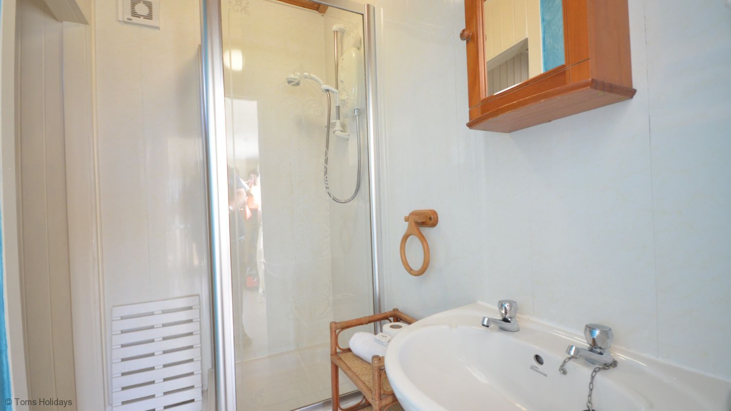 Living space - Light and airy Open plan fitted kitchen with breakfast bar and stools, plenty of storage cupboards and sea views. Also Dining area with table and chairs for four situated by another window with sea views and two comfy leather sofas for relaxing and T.V. Bedroom 1 - Double bedroom with good sea view, with wardrobe and bedside cabinet. Bedroom 2 - 1 set of child size bunk beds, wardrobe Lounge - Dining table, stools, settee & easy chairs, digi TV. Kitchen - Fitted units, cooker, fridge, microwave. Shower Room - Long Entrance hallway leading to shower room with shower cubicle and sink and adjoining toilet. Outside - Chairs for outside use and large grass area with fantastic views of the beaches of Lelant and St Ives. Washing Line available and close Parking space . Other features - Three large windows looking out on spectacular views of the bay and only a short walk to the beach provide a very relaxing holiday, often with beautiful sunsets. Dogs are also allowed at the chalet to enjoy the many coastal walks and beaches and sand dunes close by