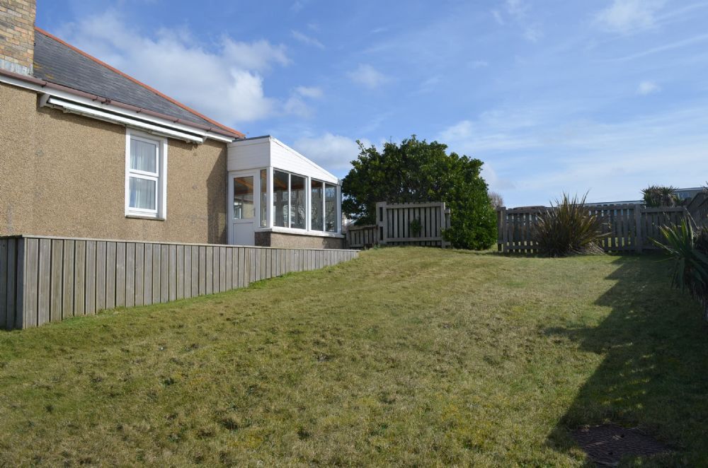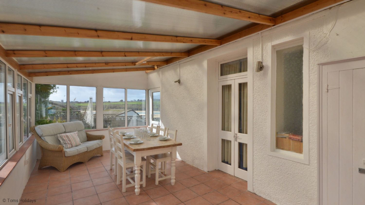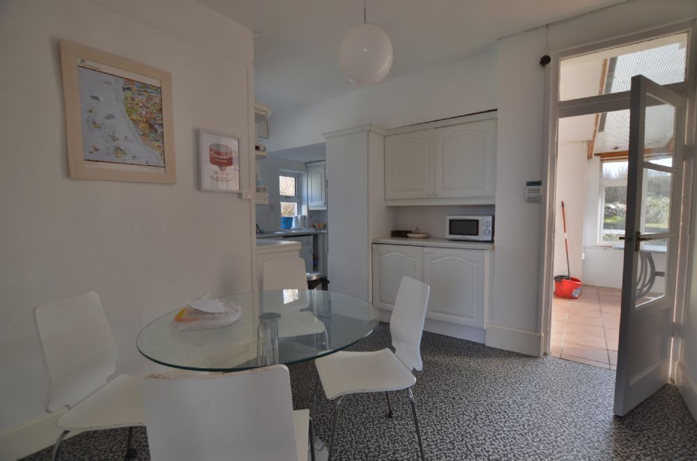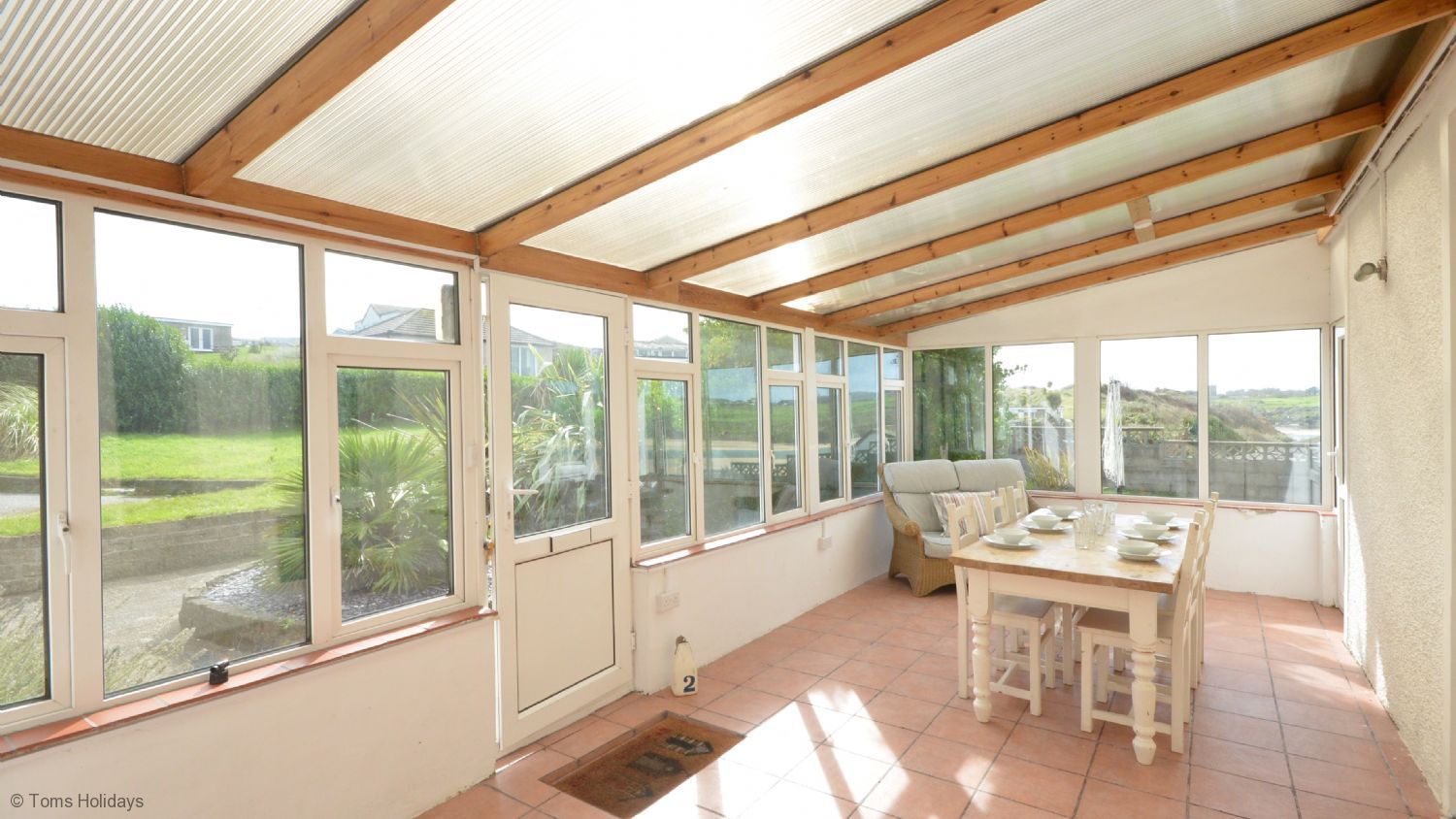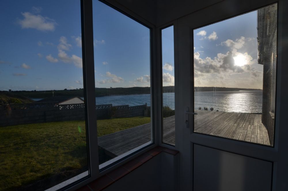 Large Conservatory with dining table and door leading onto a large deck overlooking the garden and beyond. Please note the deck is without railings and care must be taken at the sea end where the drop to the lawn is approximately three feet.