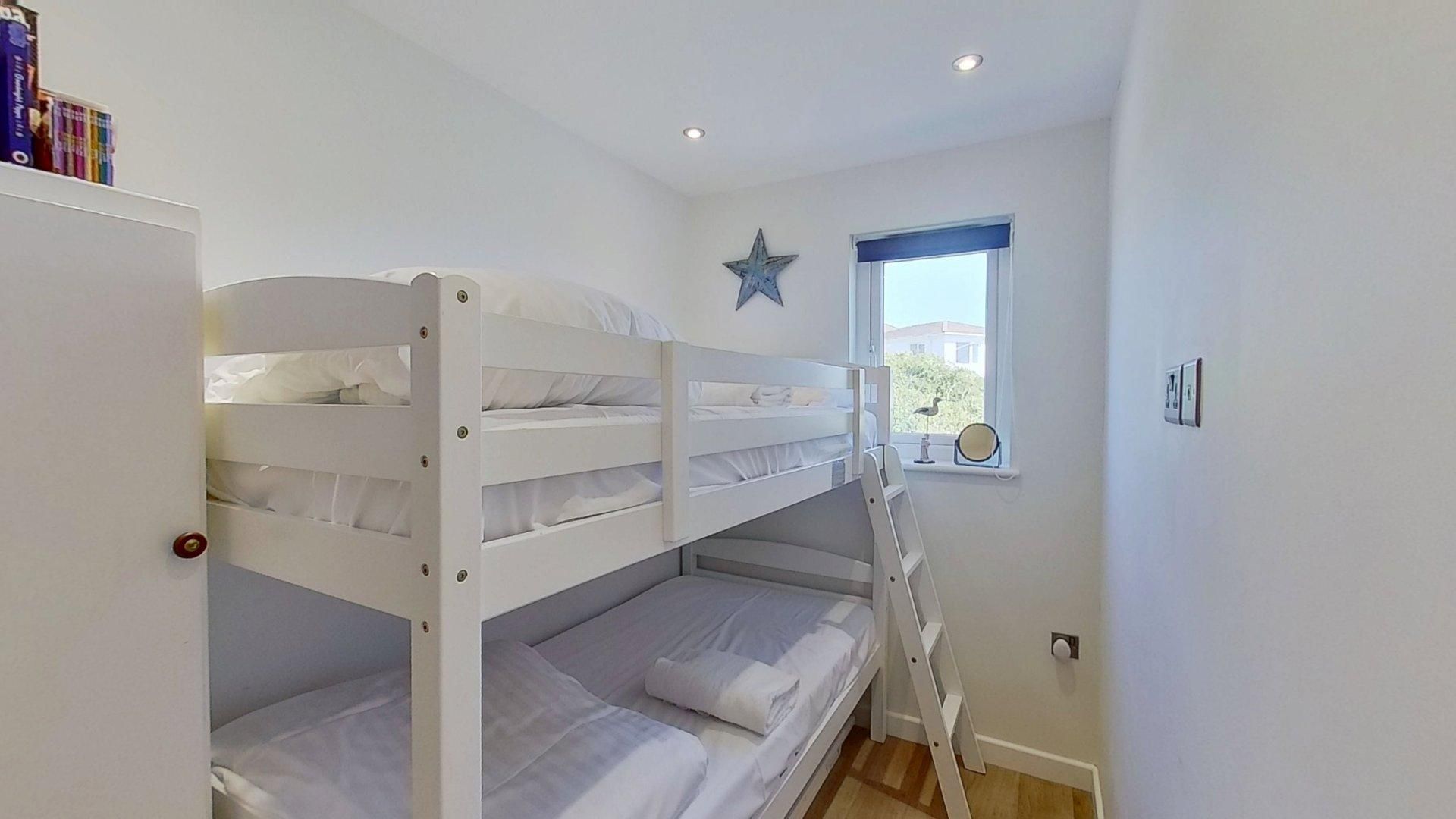 Open Plan Living/Kitchen/Dining Area - A bright open plan living space with a large corner sofa, TV and pull out dining table and chairs. The contemporary kitchen is well-equipped and includes an electric hob and oven, microwave, dishwasher and washing machine. Bedroom 1 - A spacious double bedroom with a wardrobe, chest of drawers and bedside tables. Bedroom 2 - With a single bed, a wardrobe, chest of drawers, small TV and room for a cot. Bedroom 3 - With full size bunk beds. Shower Room - A fitted shower cubicle, basin with vanity unit, heated towel rail and WC. Outside - A super large enclosed deck with a table and chairs, great for enjoying the sea air. Parking - On site parking available.