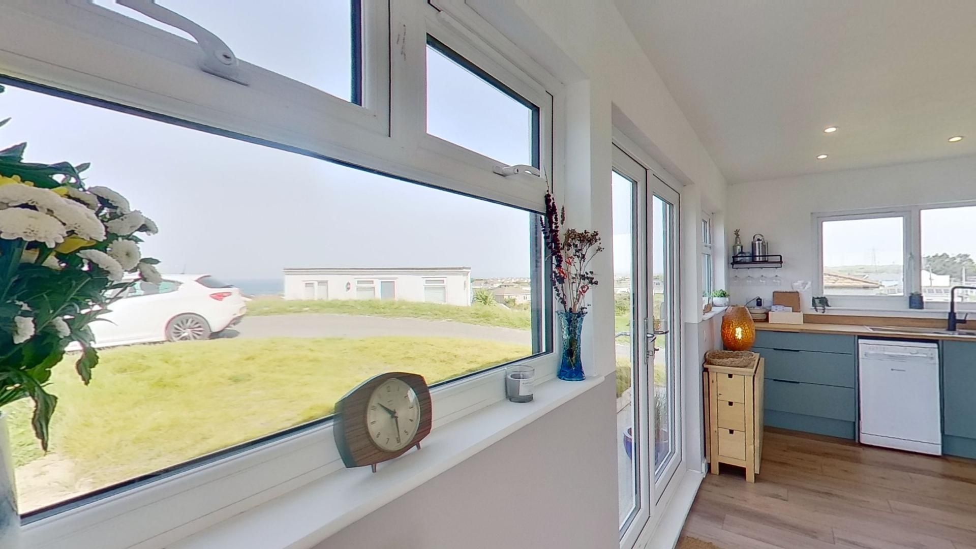 Living Area with Corner sofa looking out of Patio doors at a picture postcard view of the Hayle Estuary and Lelant Golf Course. Either sit and just stare into space or cosy up and watch TV after a day in the fresh air.