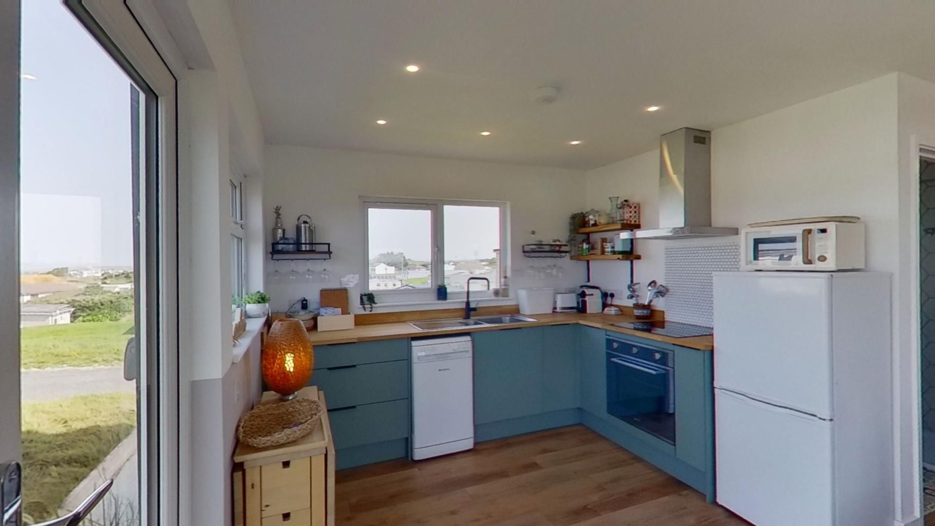 The kitchen - Fully fitted modern kitchen, solid wood worktops with Smeg hob and Oven. Fridge /Freezer, microwave, Nespresso machine. Along with plenty of lovely glasses for your wine and gin. The fold up dining table can seat six comfortably in the kitchen area.