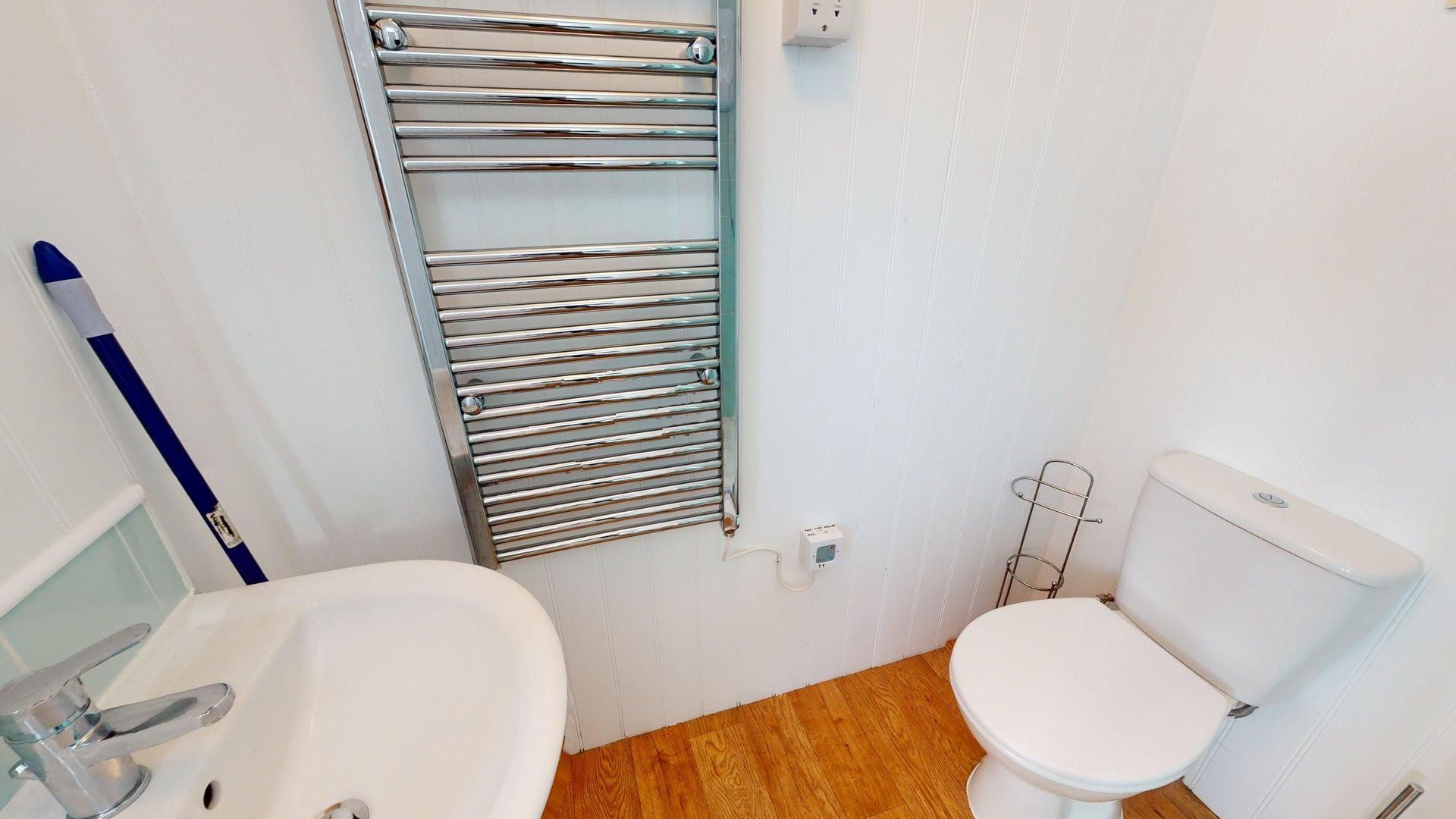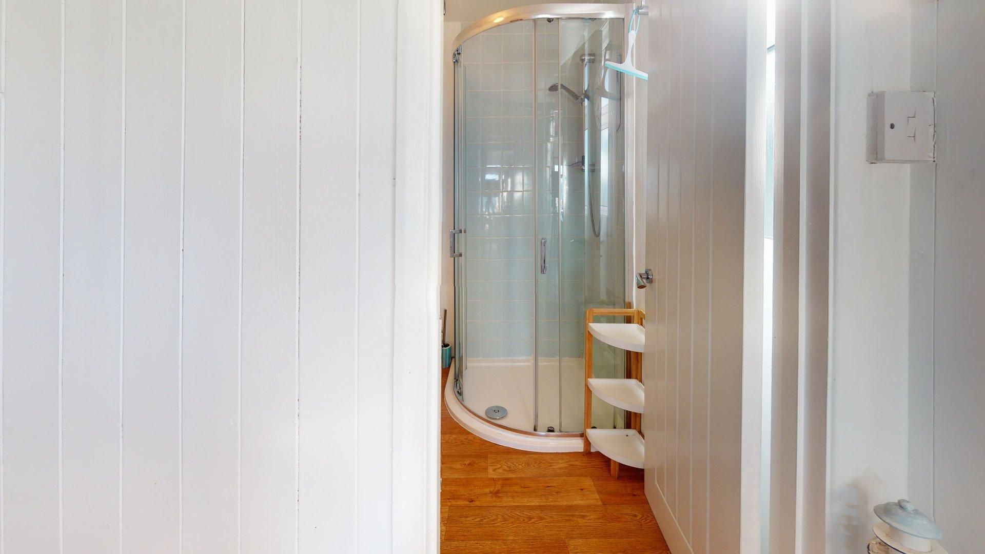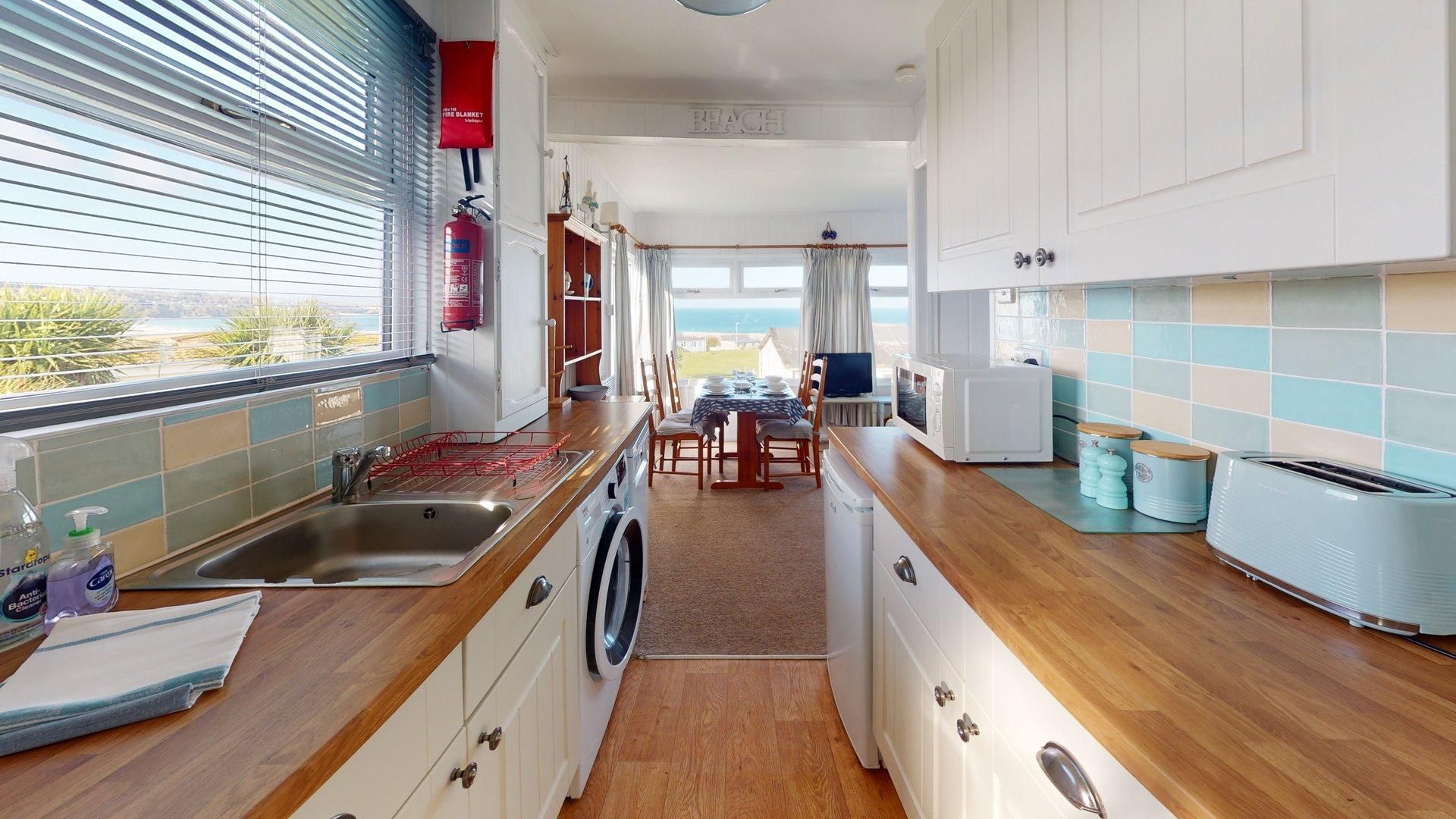 Living/Dining Area - A light and comfortable open plan living space with large picture windows and excellent views across St Ives Bay. The living area includes a sofa, comfortable armchair with footstool, TV and wall mounted electric heater. The dining table seats up to four guests. Kitchen - With excellent views across the golf course to Lelant, the kitchen has an electric cooker, microwave, washing machine, dishwasher and fridge. Shower Room - With an enclosed shower, basin, thermostatic towel radiator and WC. Bedroom 1 - Double bed, bedside drawers and shelf. Additional set of drawers plus fitted wardrobe and storage. Wall mounted electric heater. Bedroom 2 - Two single beds, drawer unit with vanity top and fitted wardrobe. Wall mounted electric heater. Entrance Hall - Hanging space for coats and room for beach equipment. Parking - Below the chalet down a grassy slope with some shallow steps.