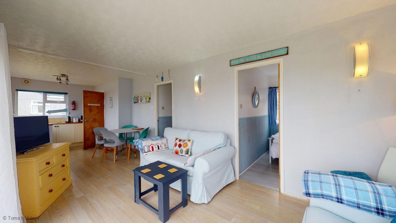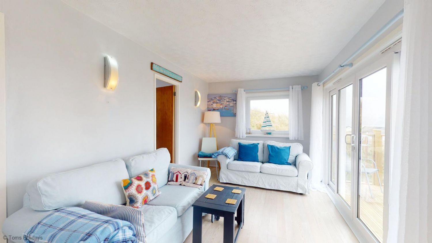 Lounge/Diner - Two sofas, dining table & chairs, table with digi TV, large picture frame window offering excellent sea views.