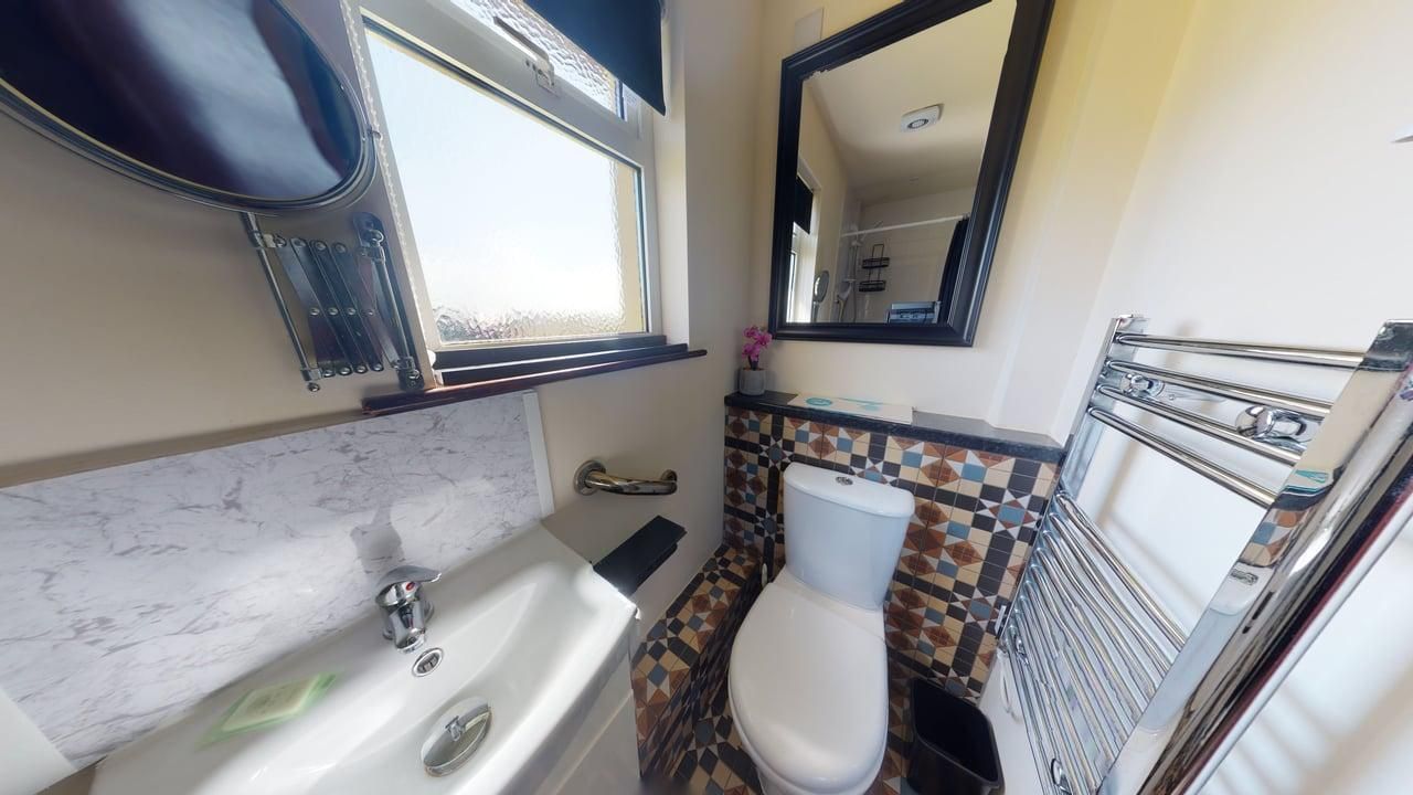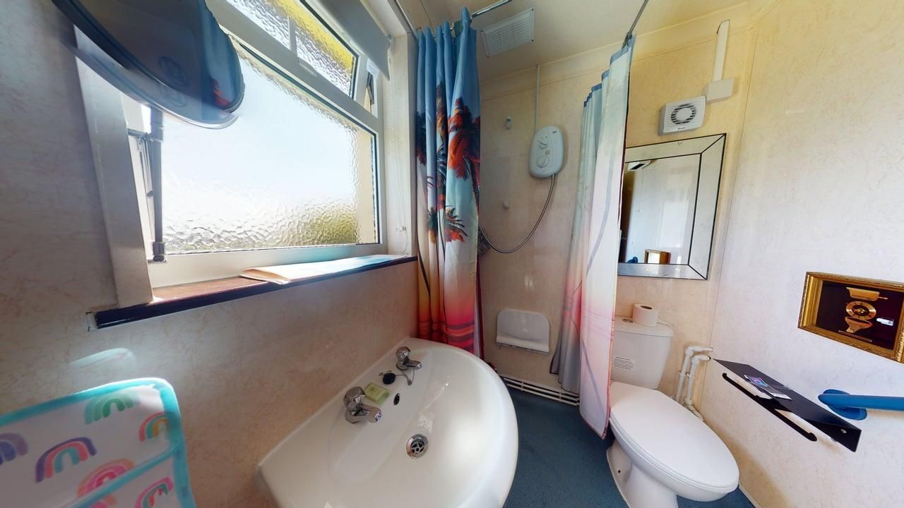 Wet Room - with open shower & fitted shower seat, electric towel rail, basin and WC.