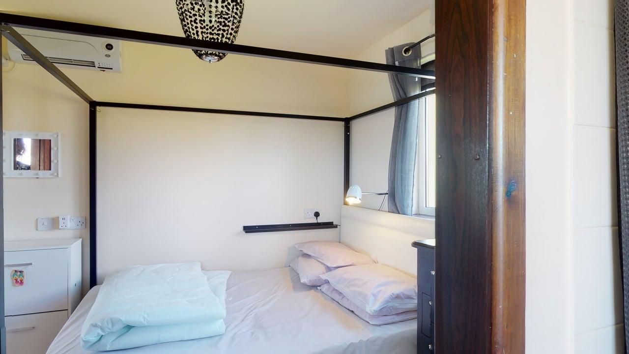 Bedroom 2 - Double bed. Wall heater, vinyl flooring with clothes hanging space.