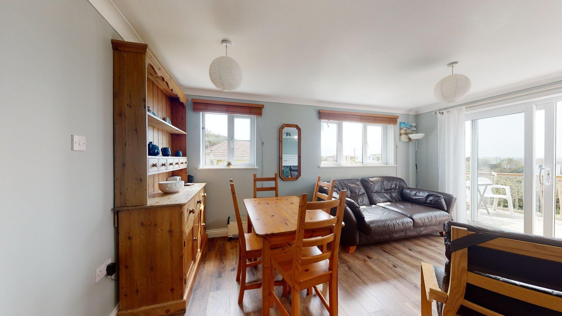Bedroom 1 - One double bed, built-in wardrobe, shelving and storage. Bedroom 2 - Bed which converts to 2 full size singles or 1 large double, built-in wardrobe, shelving unit and storage. Lounge/Diner - 3 Seater sofa, 2 armchairs, dining table and chairs, Welsh dresser, digi flat screen T.V, patio doors opening onto deck. Kitchen - Modern and well equipped with fitted units, oven & ceramic hob, fridge freezer, washing machine, microwave. Shower Room - Shower cubicle, WHB , W.C, heated towel rail, shelving unit. Outside - Enclosed decking area with bench, table and two armchairs.